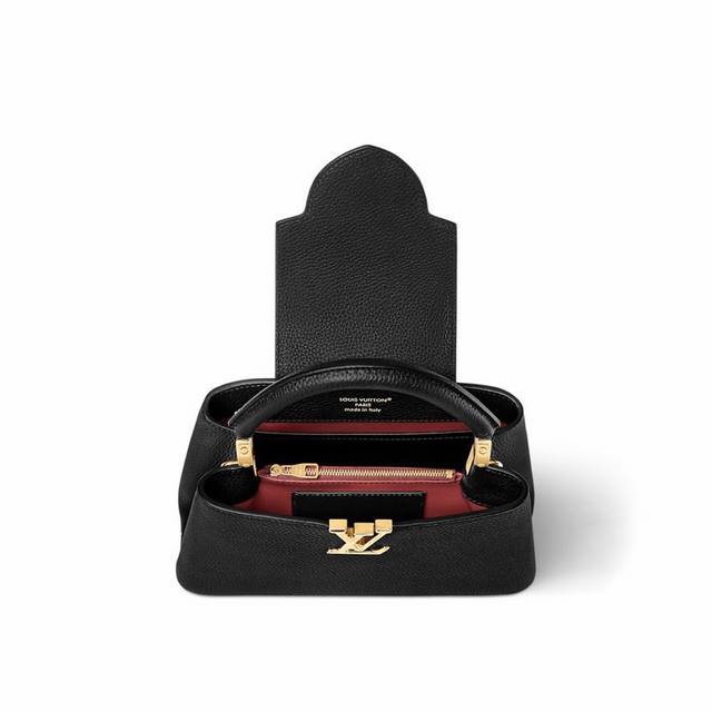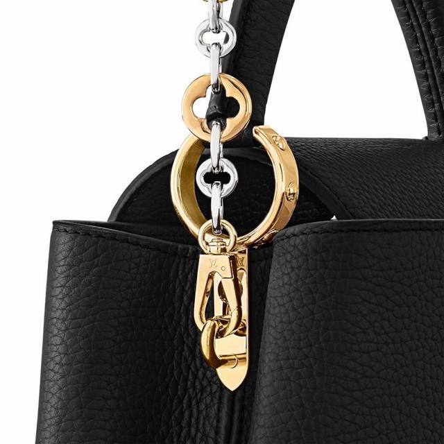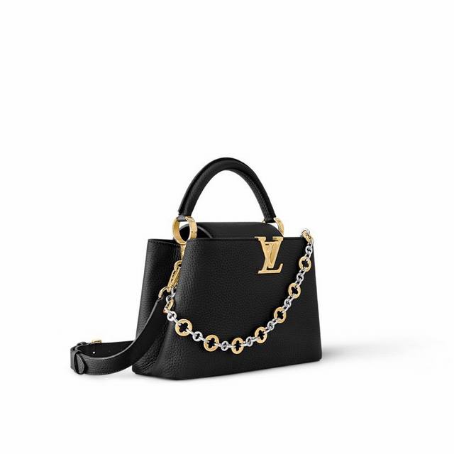 Extra-grade steel M12938 white gold M12938 black gold This Capucines mini handbag is part of the Capucines chain on you collection. Crafted from supple Taurillon leather, it offers ample storage for a compact wallet, keys, lipstick, and other daily essentials. The jewelry-inspired double-plated chain features Monogram floral details, complementing the rounded Lv lettering. The flap can be worn either inward or outward.