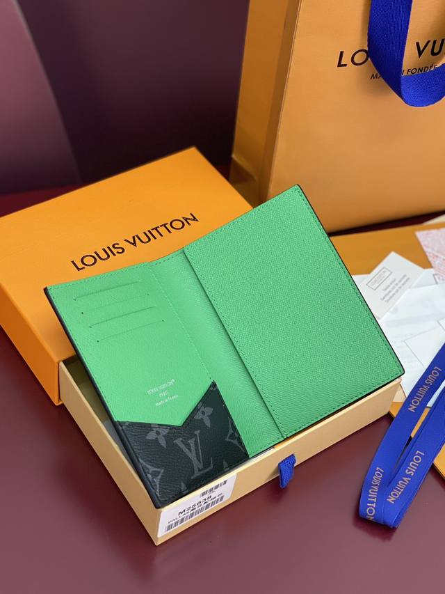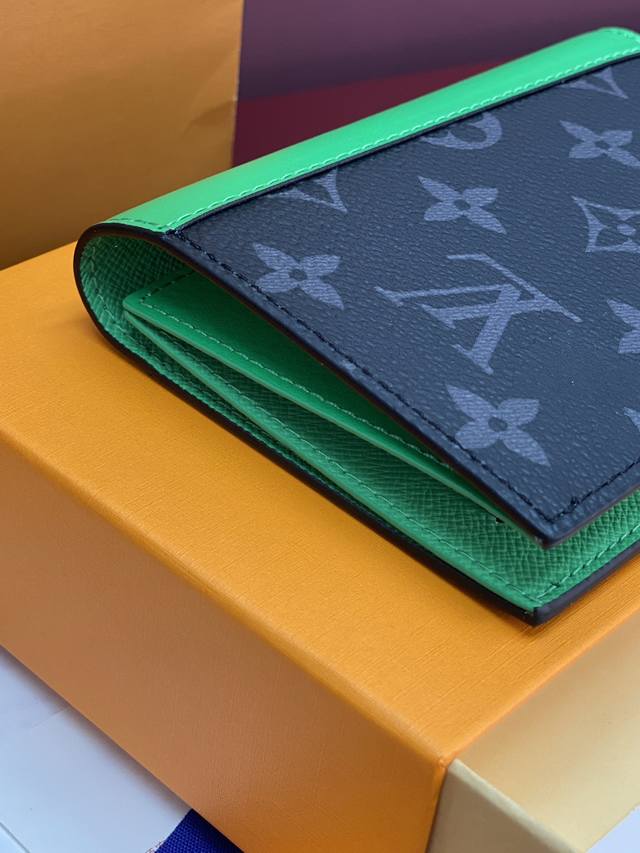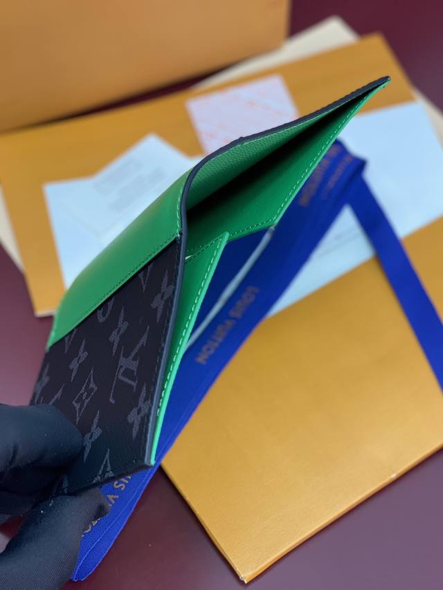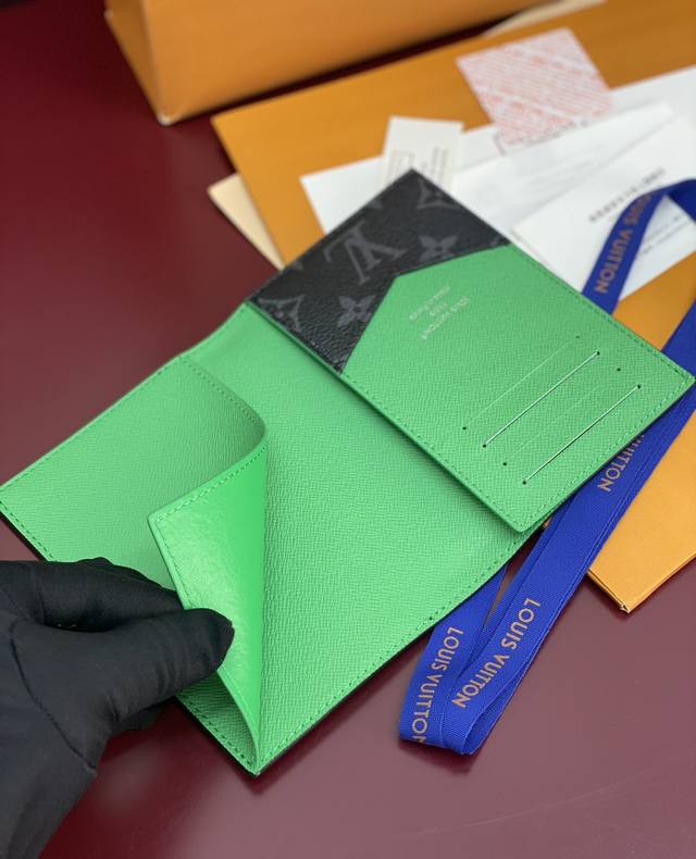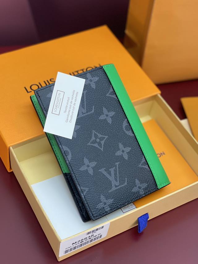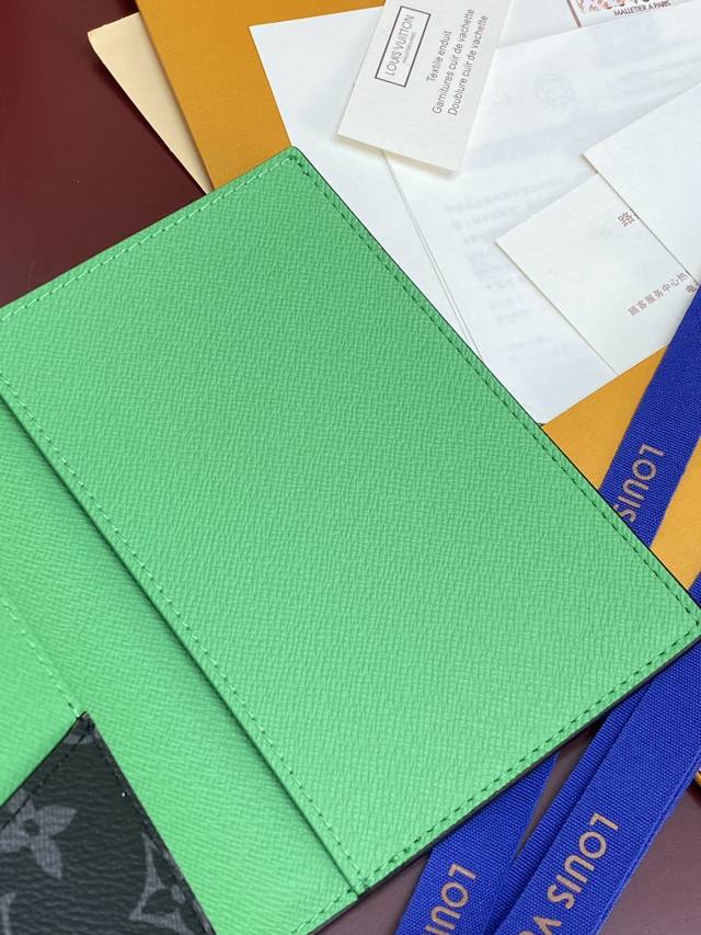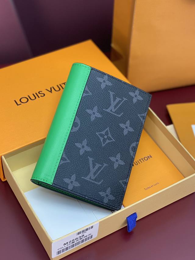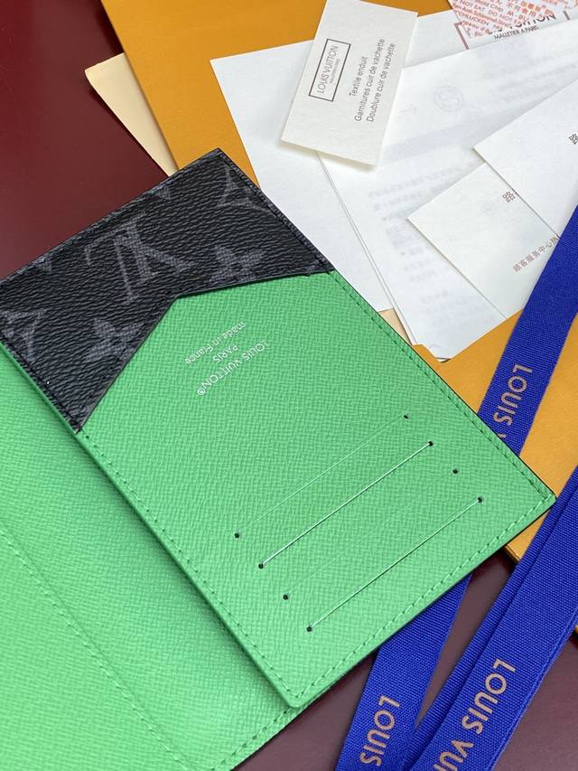 Factory Price: M25838 Green! This passport holder features Monogram Eclipse coated canvas with vibrant leather trim, embodying a touch of summer chic. The cowhide lining adds a sophisticated touch, while the card slots and patch pockets provide convenient storage for travel documents, receipts, and other small items.