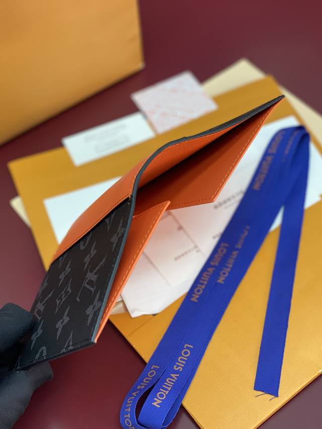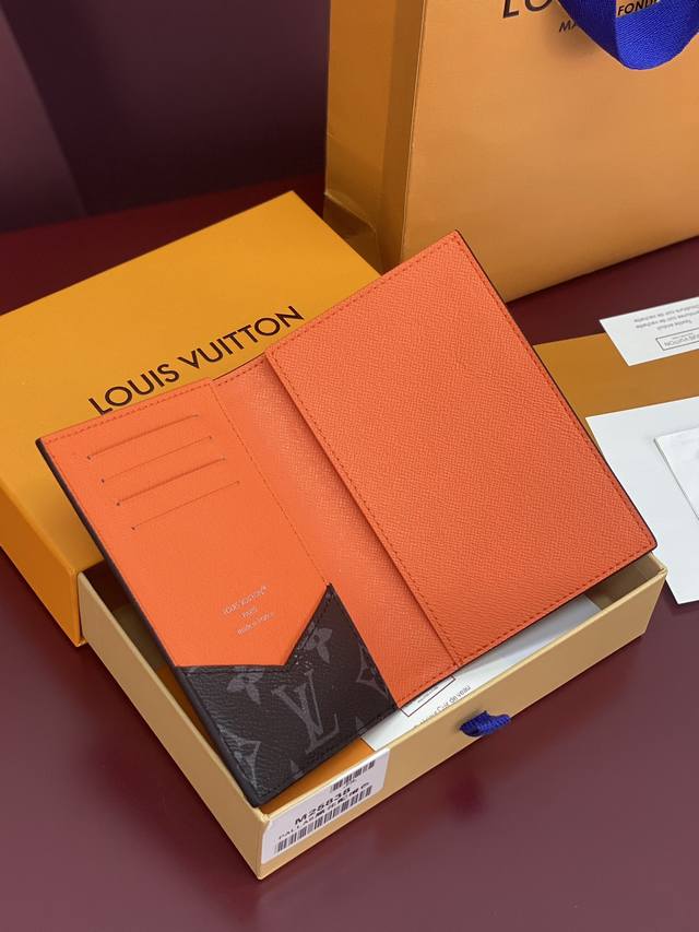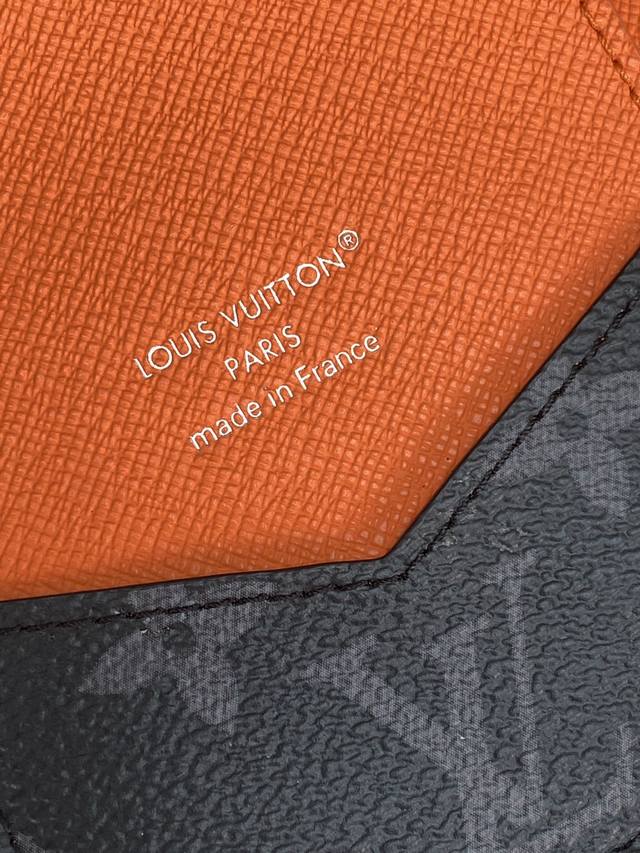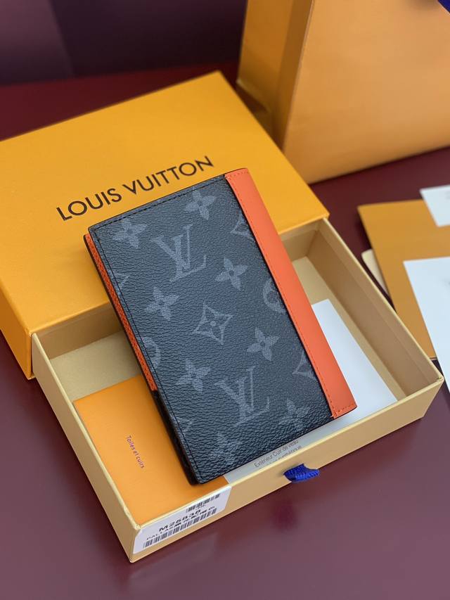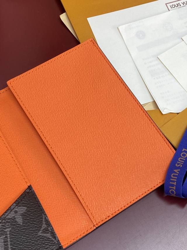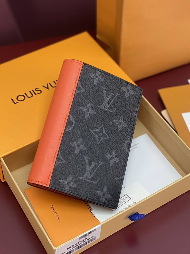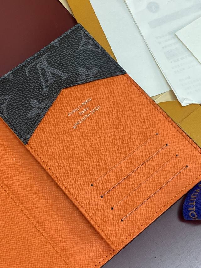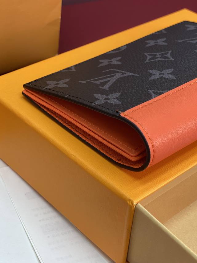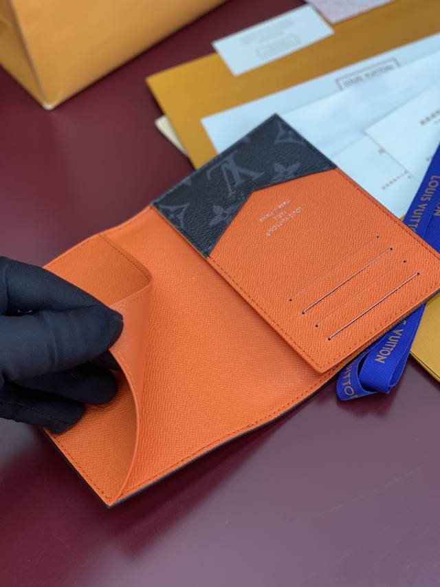 Factory Price: M25838 Orange! This passport holder is crafted from Monogram Eclipse coated canvas with vibrant leather trim, embodying a summery vibe. The cowhide lining enhances the sophisticated look, while the card slots and patch pockets provide convenient storage for travel documents, receipts, and other small items. Dimensions: 14 x 2.5 x 10 cm (Height x Width x Length).