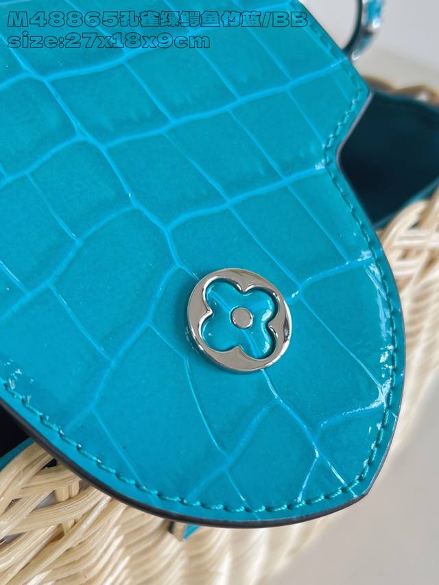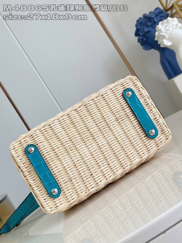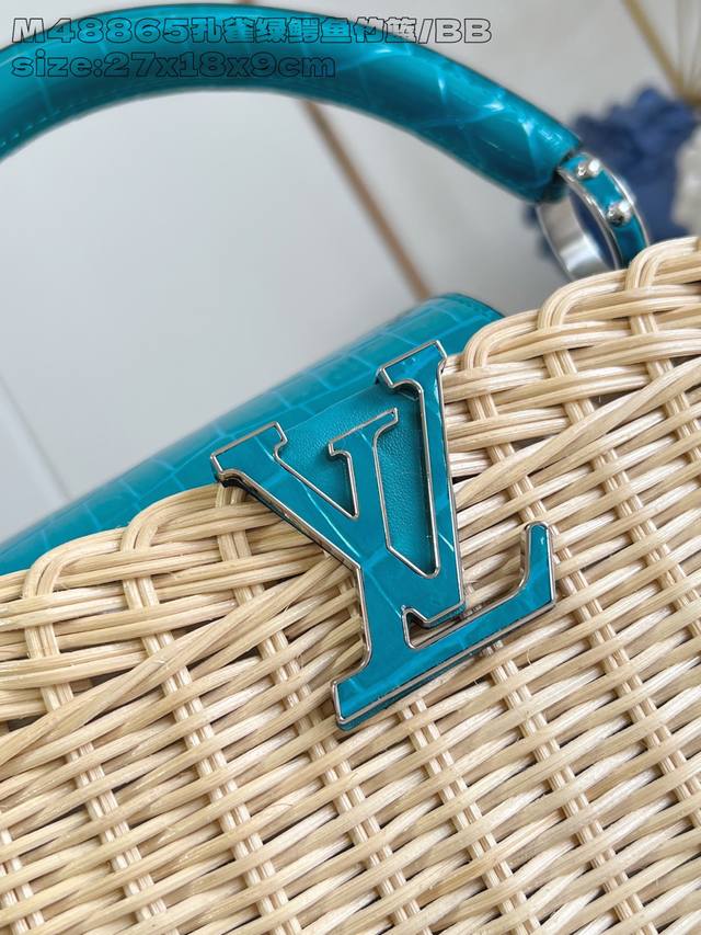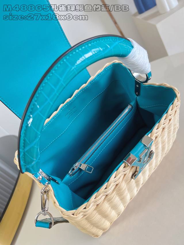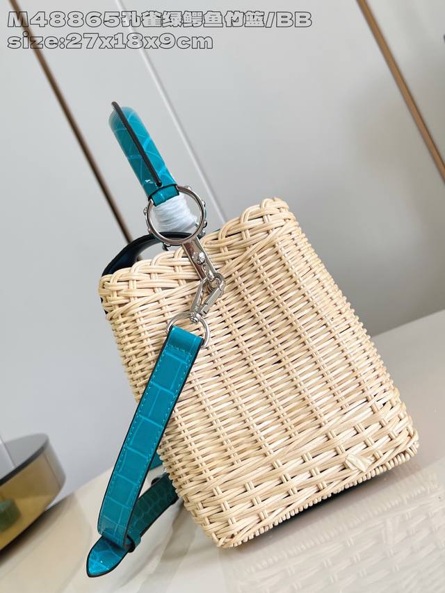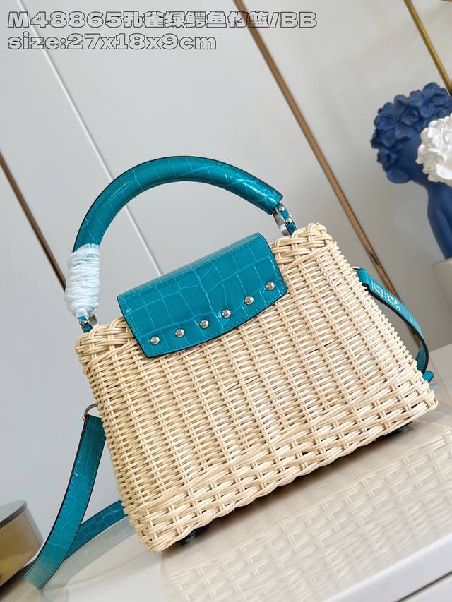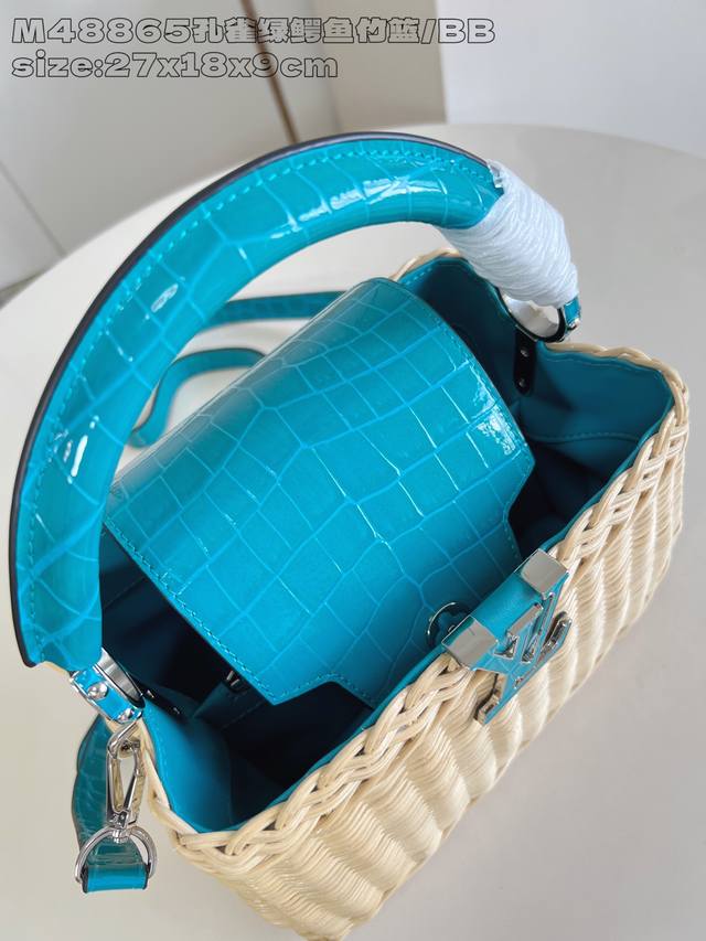 Factory Price: p Premium Original M48865 Peacock Green Crocodile Basket Small. This Capucines Bb bag draws inspiration from the picnic trunk launched by Louis Vuitton in 1892, brimming with summery charm. The rattan body requires several days of meticulous weaving, and leather trim and striking Lv monogram complete the details. Suitable for crossbody, shoulder, or handcarry. 27 x 9 x 18 cm (H x W x