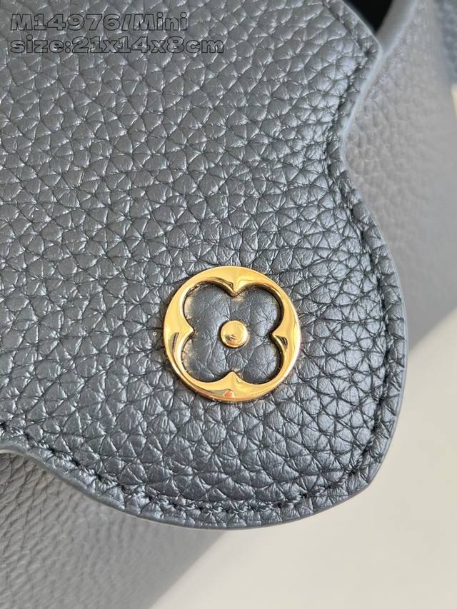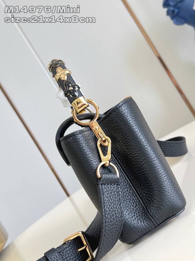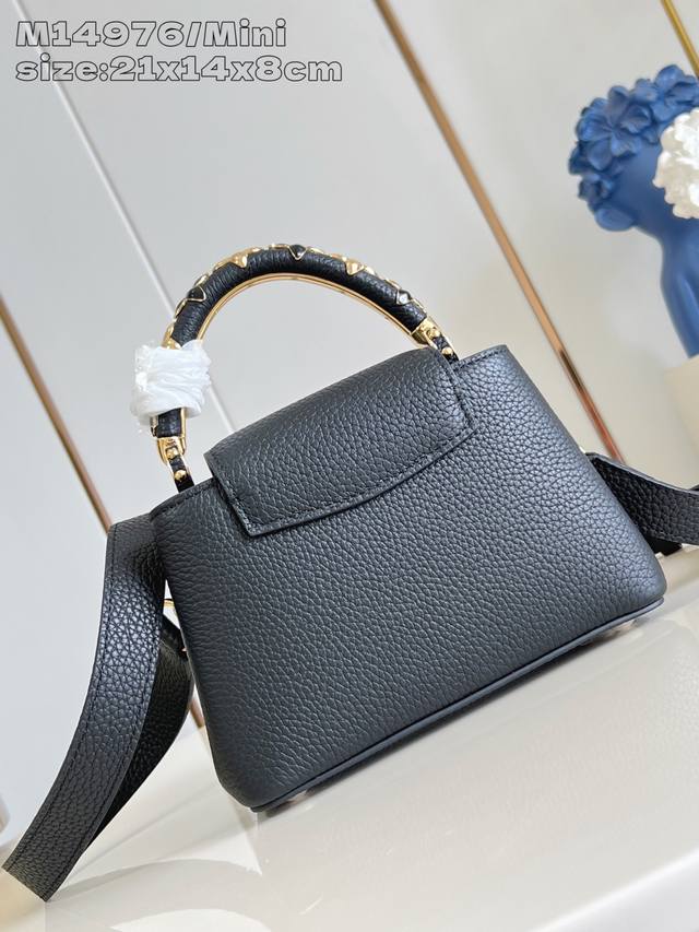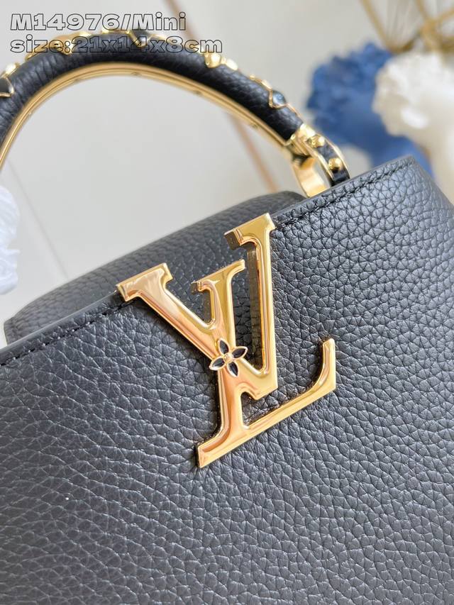 Factory Price p Top Original M14976 Mini This Ivy Capucines Mini is embellished with hand-painted enamel floral motifs, creating a romantic atmosphere. Crafted from Taurillon leather, the bag features a gold-tone LV Initials logo, a nod to the brand's craftsmanship. Perfect for everyday essentials, this compact bag offers two different styles and features a clearly defined interior for versatile carrying options. 21 x 13.6 x 8 cm (Length x Height x Width)