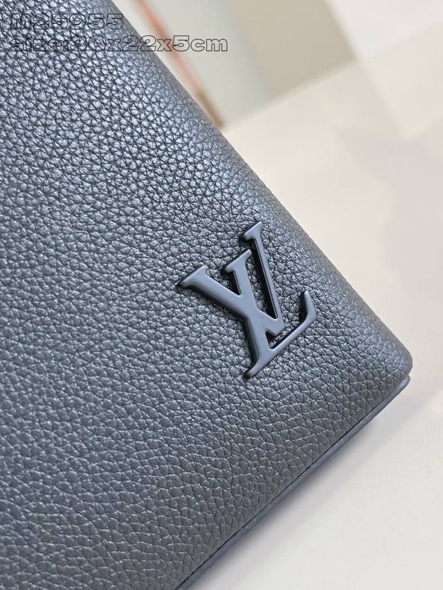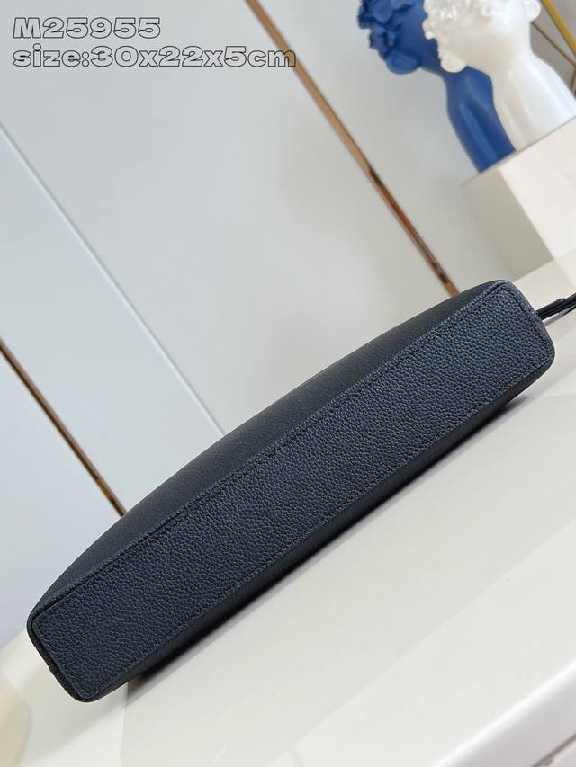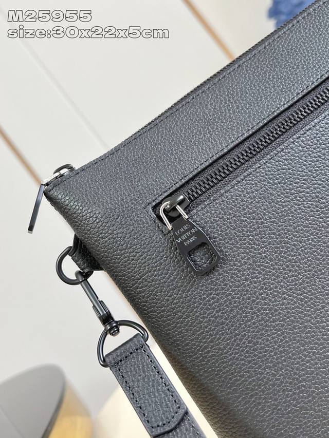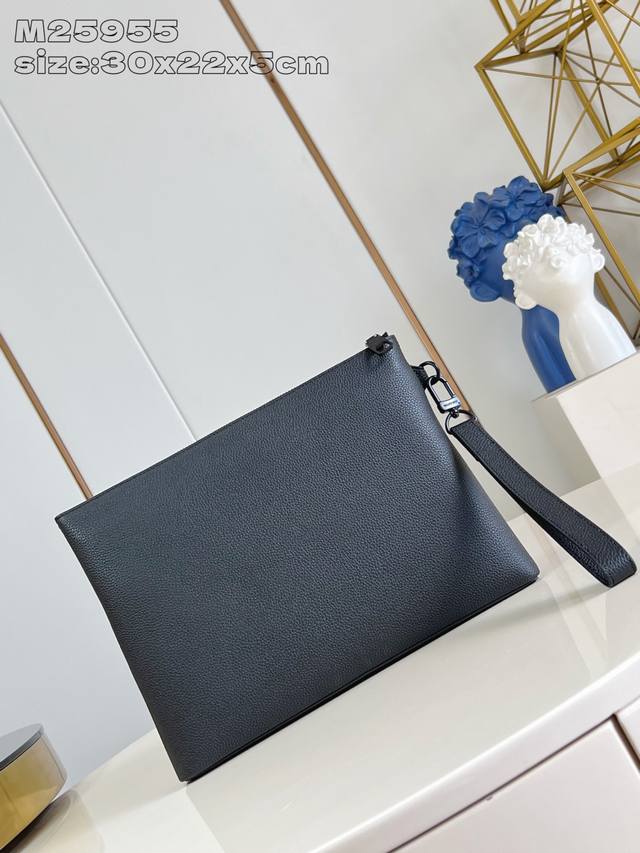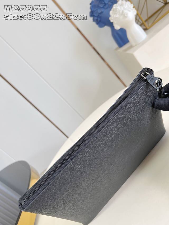 Factory Price p Top-grade original M25955 This Takeoff pouch is made of waxed calfskin with black hardware and a matching textile lining. The bag is compact in design, but spacious enough for a tablet, making it a perfect choice for both office and leisure occasions. The front corner is embellished with an elegant LV Initials embossed logo and comes with a detachable wrist strap for different carry styles. 30 x 22 x 5 cm length x height x width