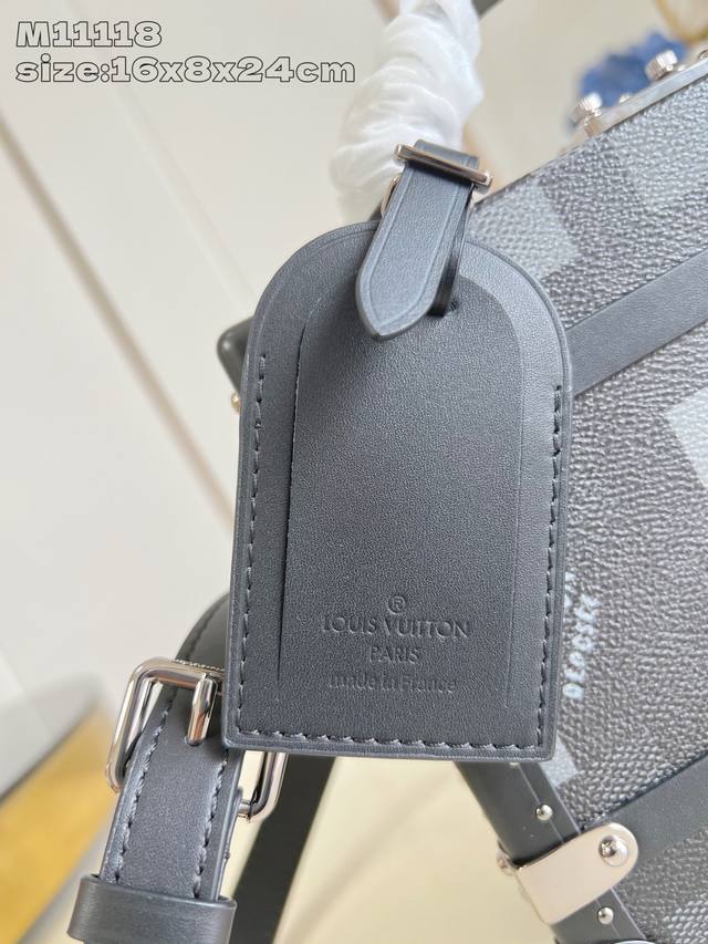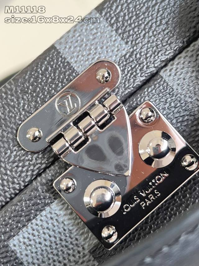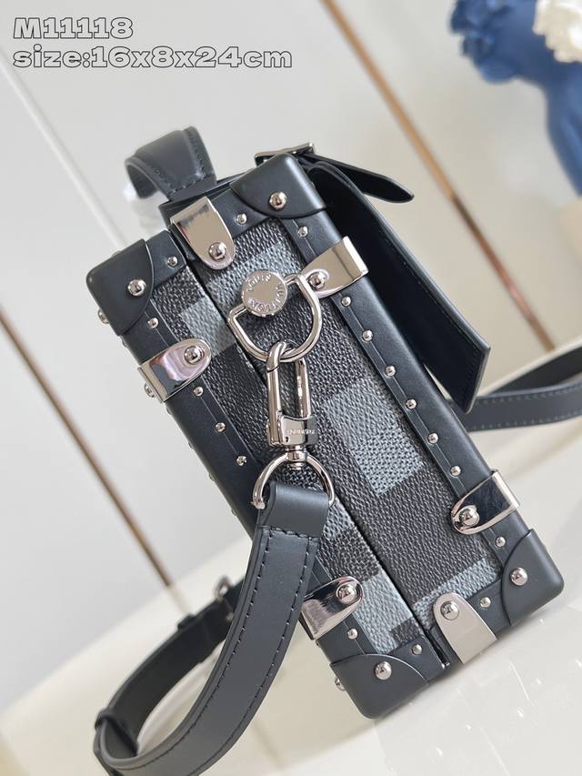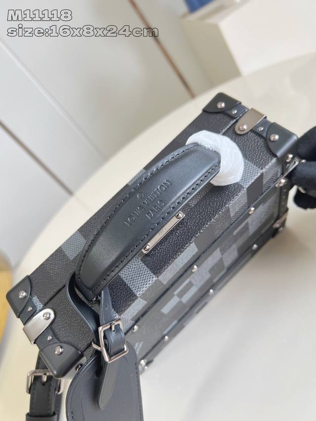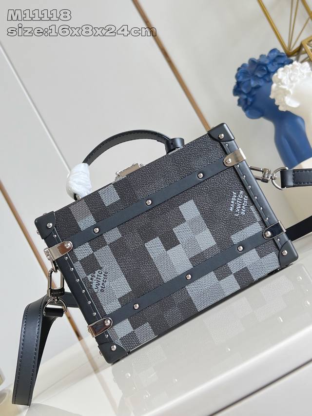 Factory Price: Premium Original M11118 Black Grid N00059. This Handle Trunk bag is crafted from Damoflage Black canvas, vividly recreating the pixelated Damier pattern from Pharrell Williams's work. Its compact silhouette, combined with a monochrome design, exudes a cool and vibrant aesthetic within a sophisticated aesthetic. A top handle and a removable, adjustable leather shoulder strap allow for flexible carrying. Dimensions: 16.5 x 8 x 24 cm (H x W x L)