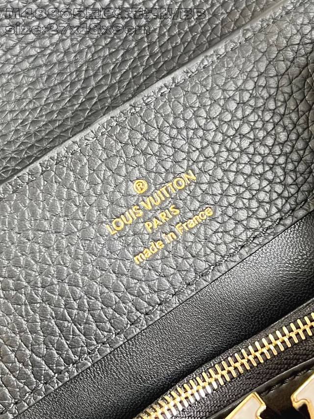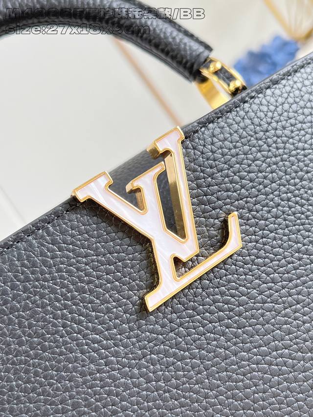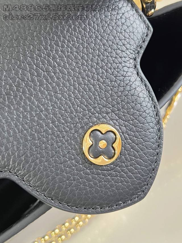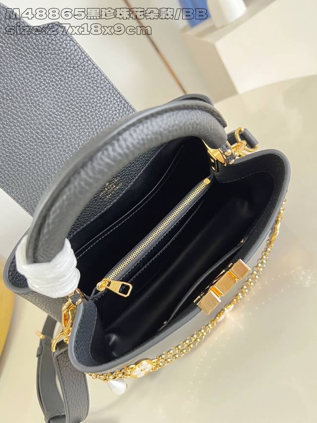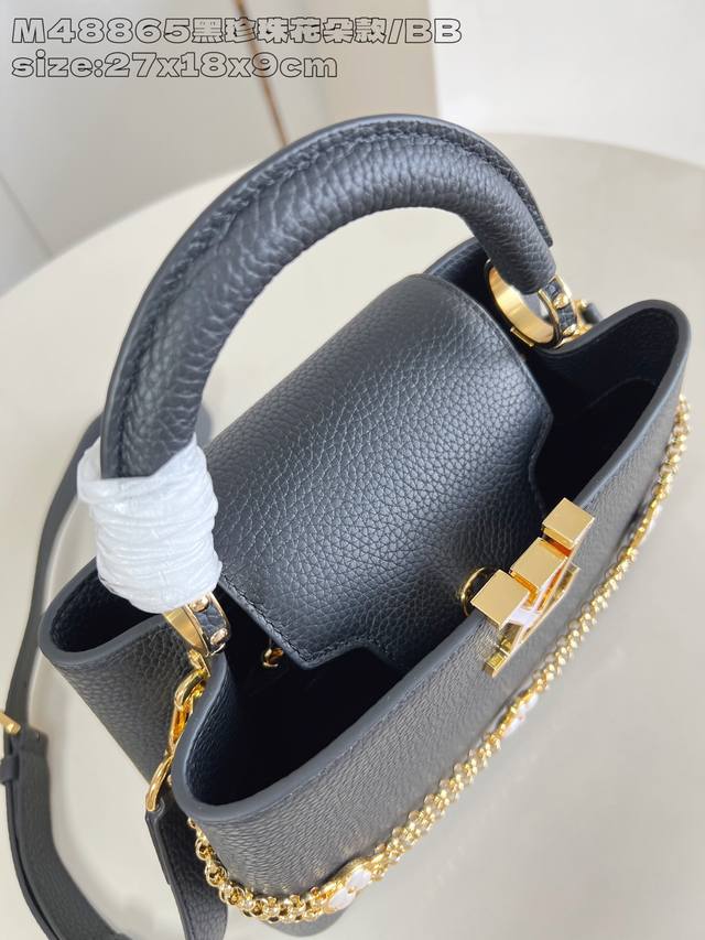 Factory Price: Premium Original M48865 Black Pearl Flower Small Model M25862. This Capucines Bb handbag features Taurillon cowhide leather in a classic hue, inspired by the classic shell necklaces of the Daydream collection. The Baroque-style chain is embellished with Monogram flowers, while Lv monograms and delicate beads add a touch of elegance. 27 x 9 x 18 cm (H x W x