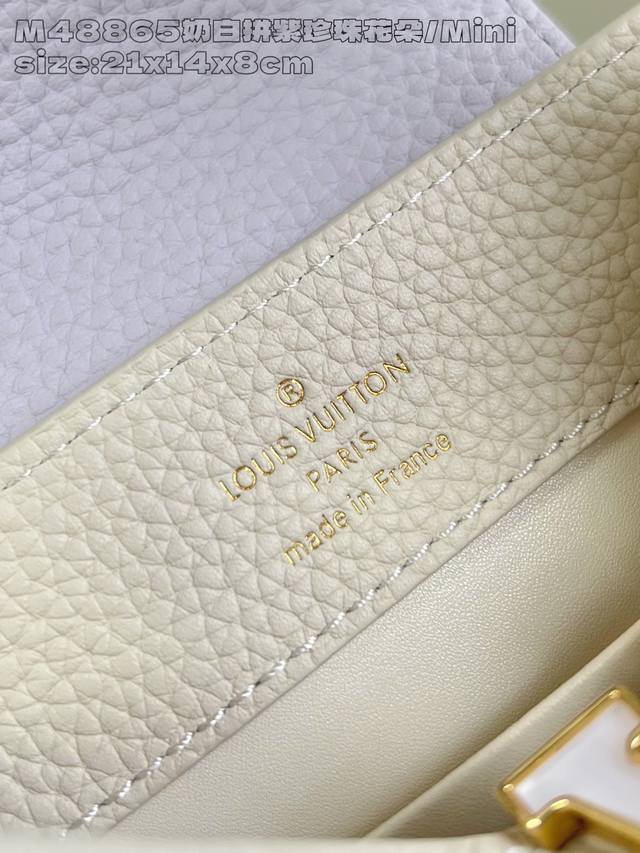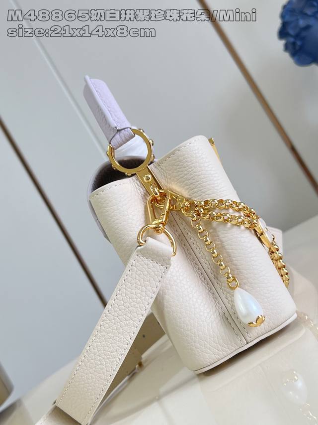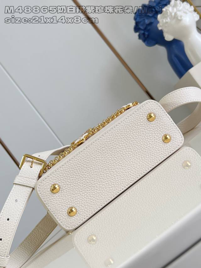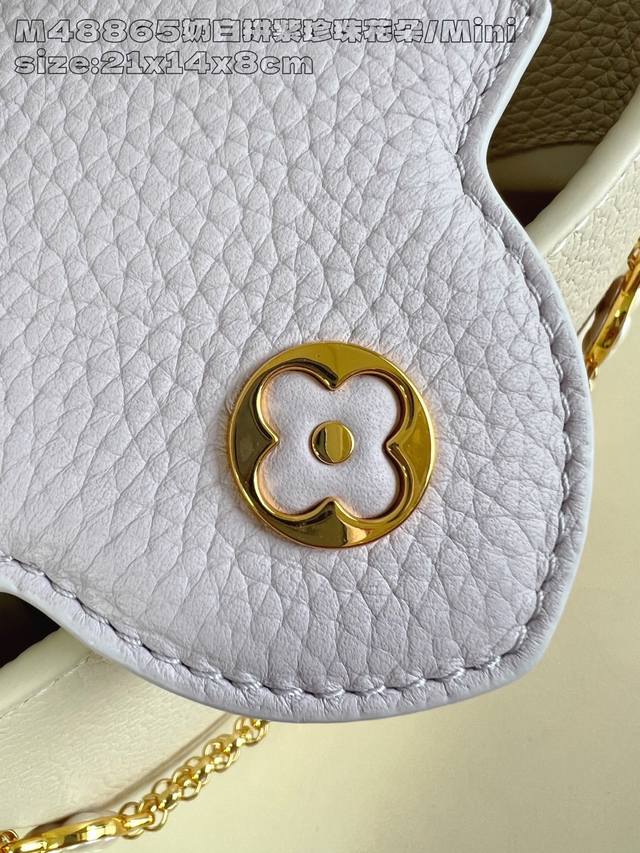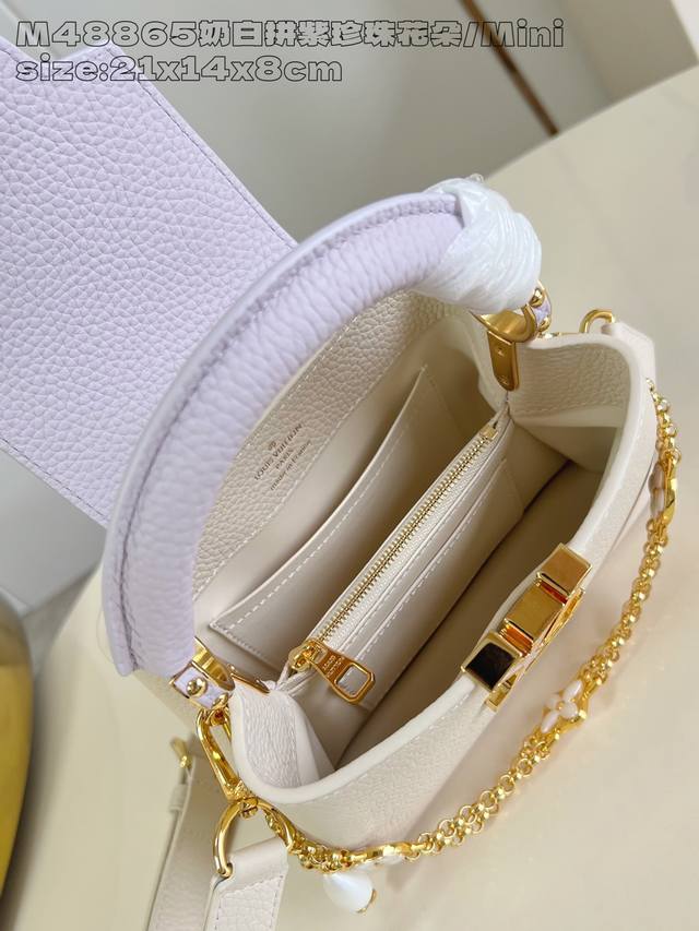 Factory Price: Premium Original M48865 Cream White with Purple Pearl Flower Mini M15117. This Capucines mini handbag draws inspiration from Baroque jewelry, incorporating shell and Monogram floral embellishments on the chain, embodying the vibrant style of the new season's Daydream collection. Taurillon cowhide leather creates a sophisticated silhouette with a flap that can be worn externally or folded inwards. A detachable shoulder strap allows for flexible carrying. 14 x 8 x 21 cm (H x W x L)