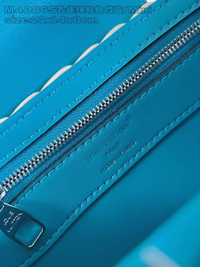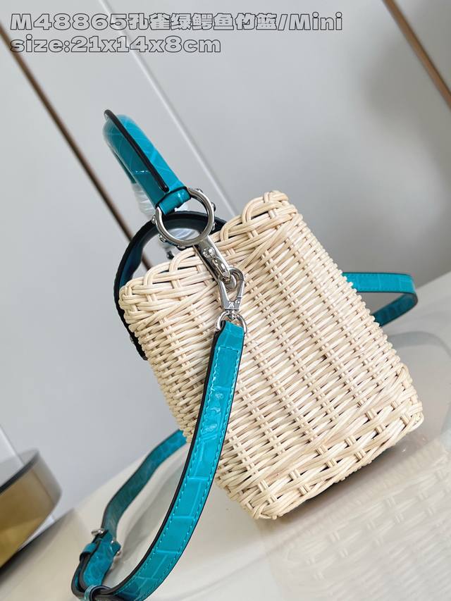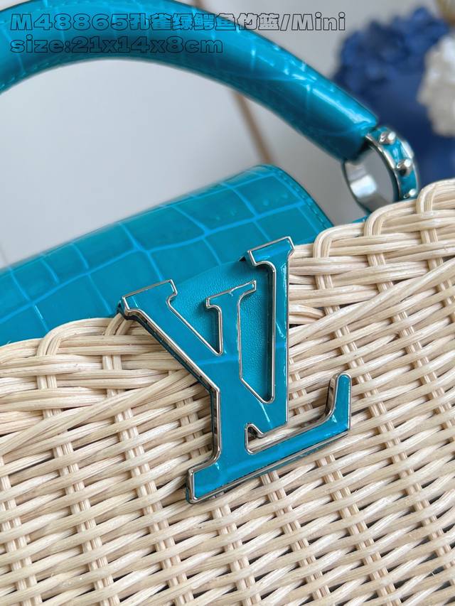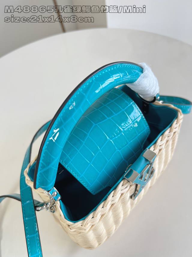 Factory Price: Premium Original M48865. This mini Capucines bag in peacock green crocodile bamboo basket draws inspiration from Louis Vuitton's 1892 picnic trunk, brimming with summery charm. The rattan body requires several days of meticulous weaving, and leather trim and striking Lv monogram complete the details. Suitable for crossbody, shoulder, or hand carry. 21 x 8 x 14 cm (H x W x