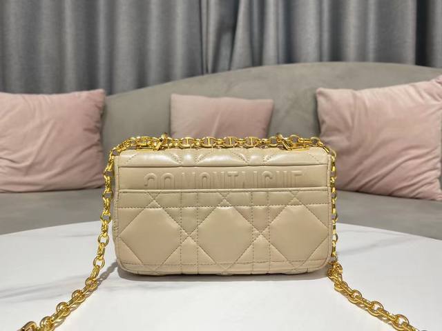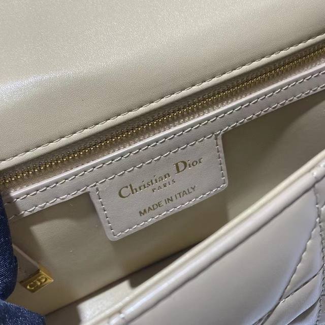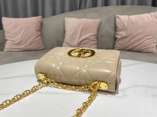 This Dior Caro handbag combines elegance with a modern flair. Expertly crafted from natural calfskin, it features an original quilted, oversized cannage topstitching for a unique look. The flap is adorned with a metal-coated, knob-style "Cd" clasp, inspired by the seal of a Christian Dior perfume bottle. The small model features a removable "Cd" signature chain strap for hand or shoulder carry, or can be replaced with a wide, embroidered Dior strap for a stylish daytime look or a finishing touch for evening wear.