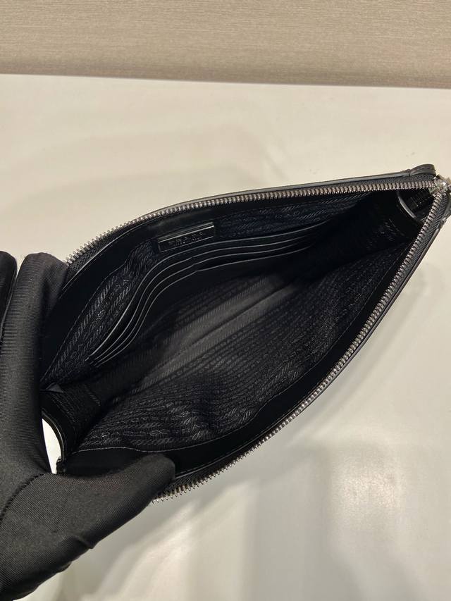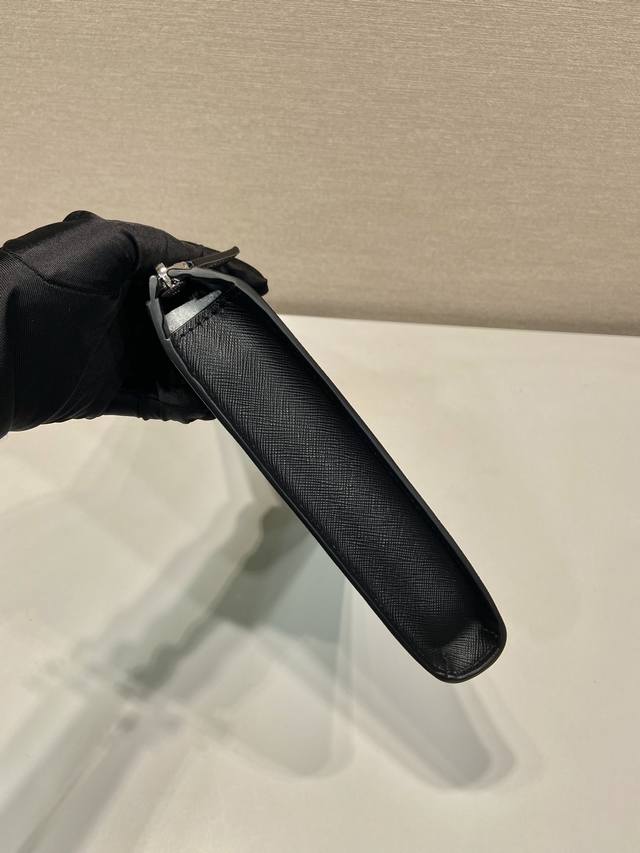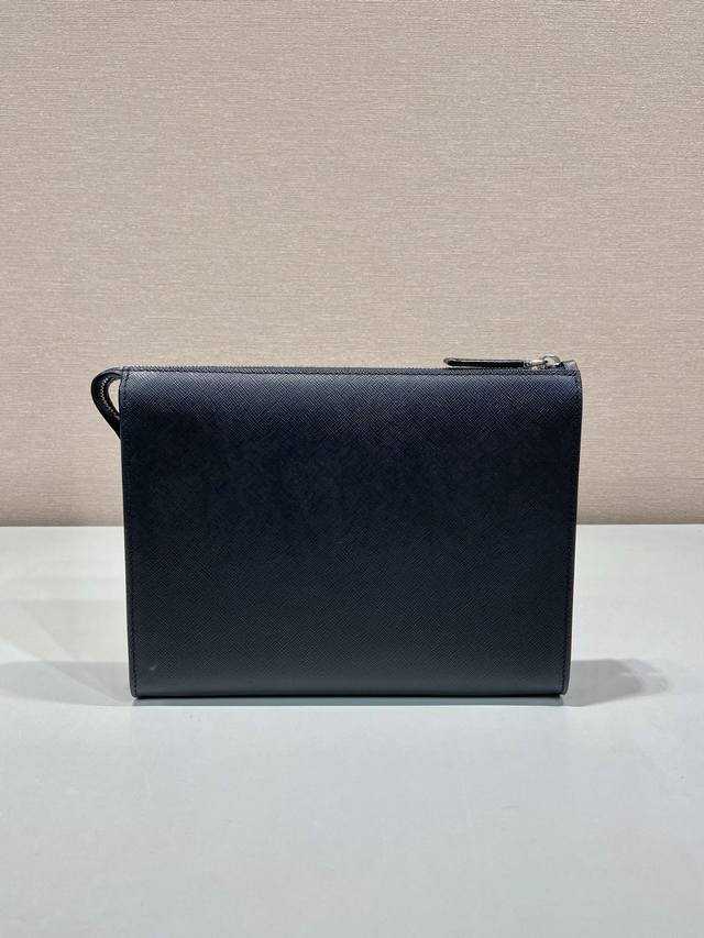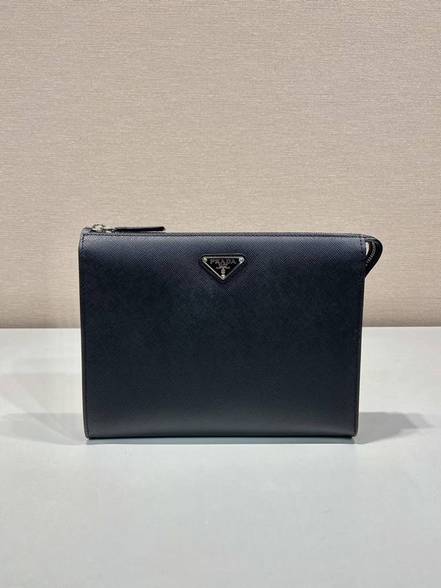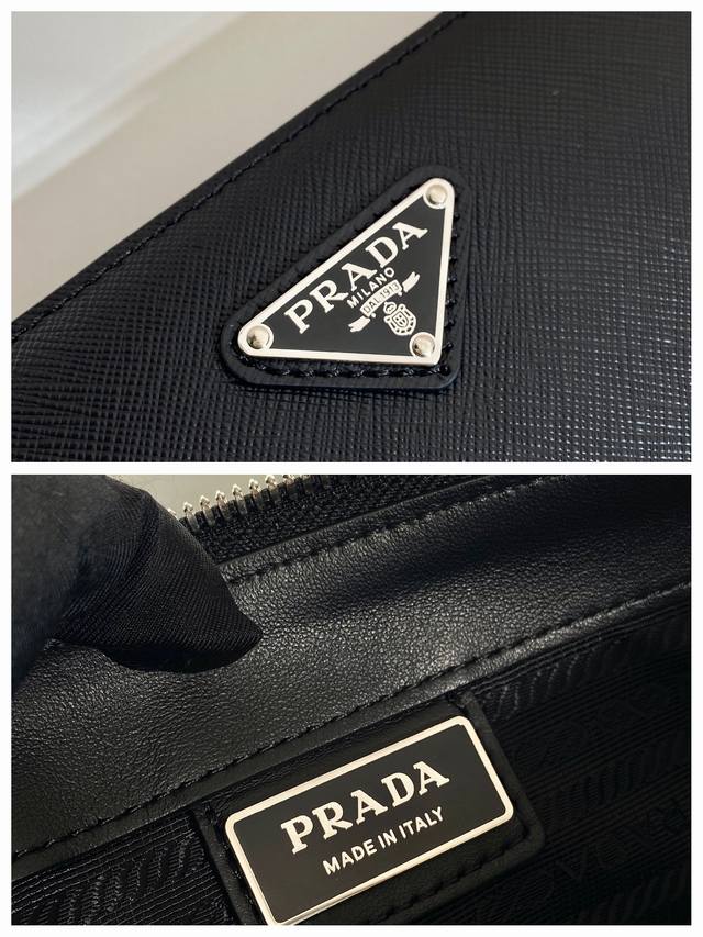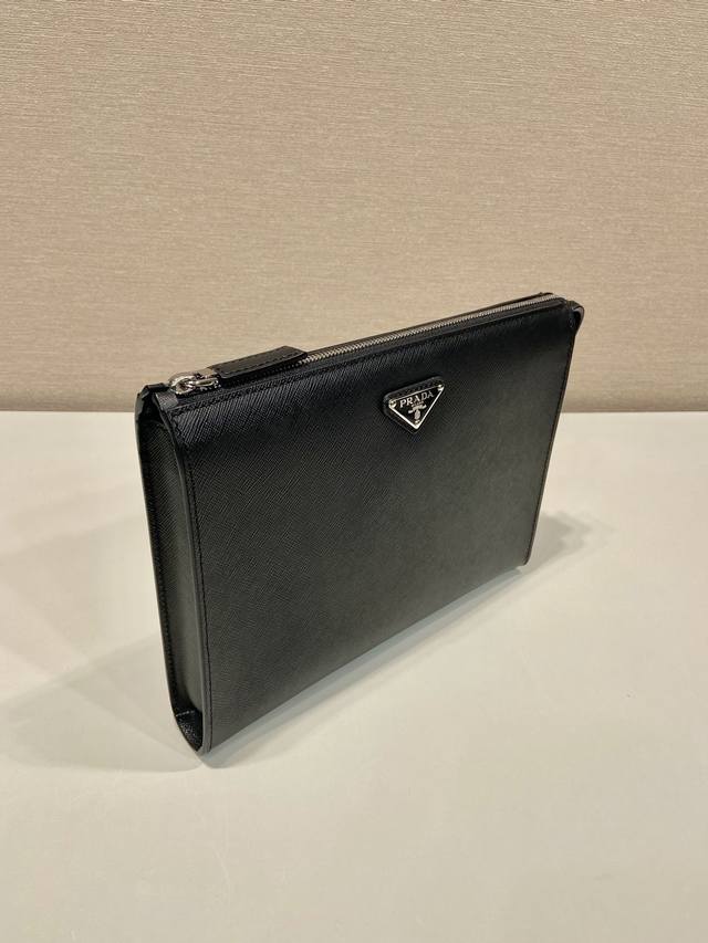 This men's handbag features a distinctive enameled metal triangle logo, offering a simple yet versatile design. The body is crafted from saffiano leather, with a distinctive texture that complements the logo. Practical and stylish, handsome men! Hurry and get yours!