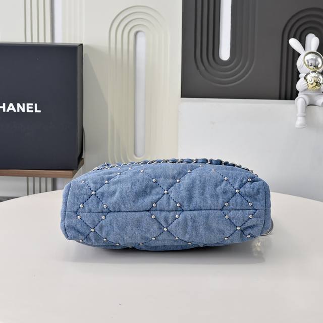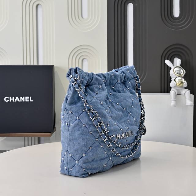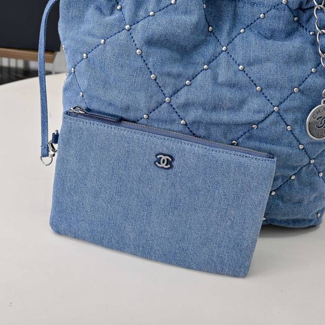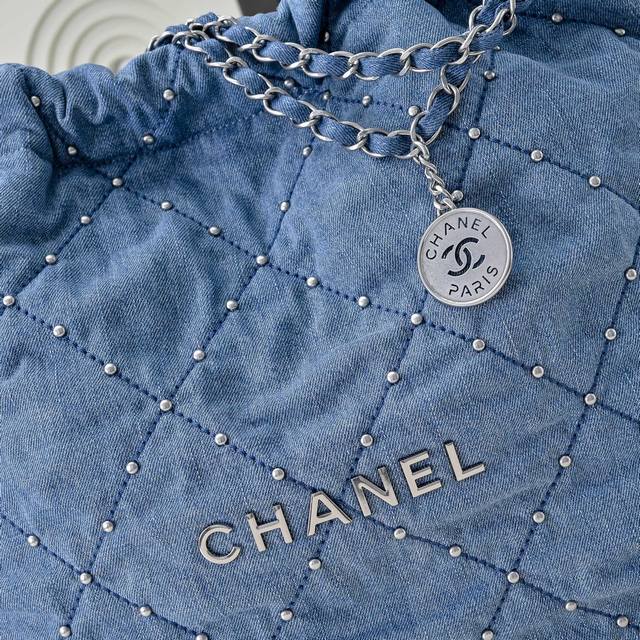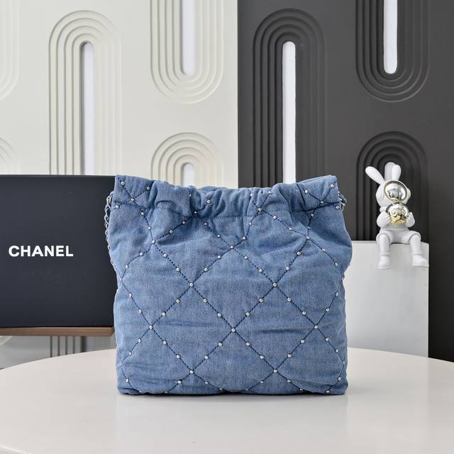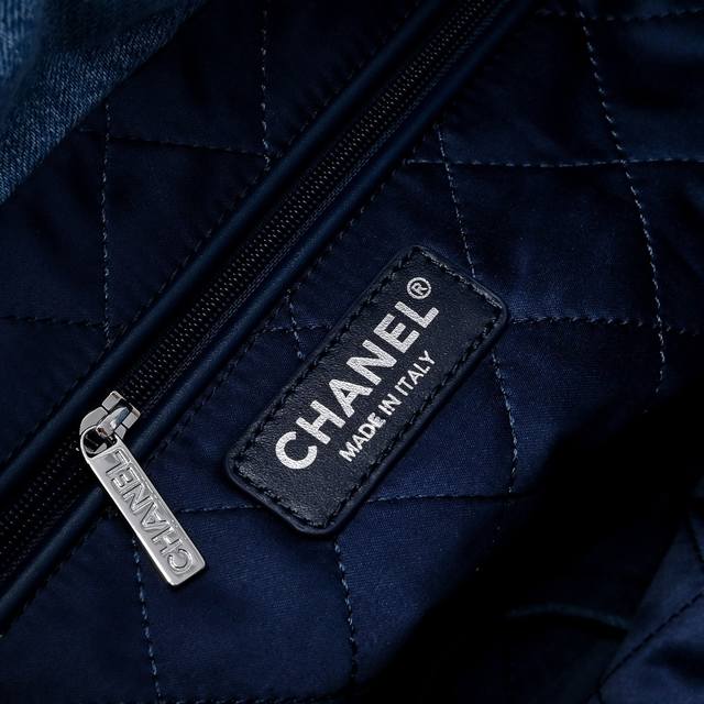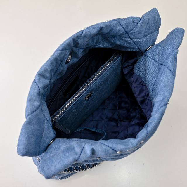 Large Chane1 24A denim! The denim beaded 22Bag is still in the same color as the leather chain, and the hardware is all silver, which really matches the blue! Eye-catching and fashionable~ It is full of cool and refreshing feeling. The design is really unique and eye-catching. The denim fabric is lighter than the leather version. The bag design continues the classic diamond quilting and leather chain elements. The large capacity bag combines simplicity and comfort. The appearance is simple and focuses on practicality. There is a zipper pocket and a detachable pouch secured with a spring hook inside. The bag has a magnetic clasp and drawstring elastic band design, showing a lazy and casual style. A hollow Chanel double C pendant adds a finishing touch.