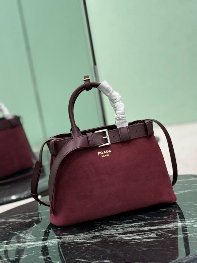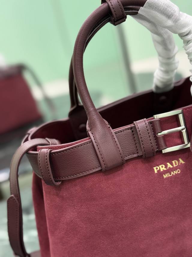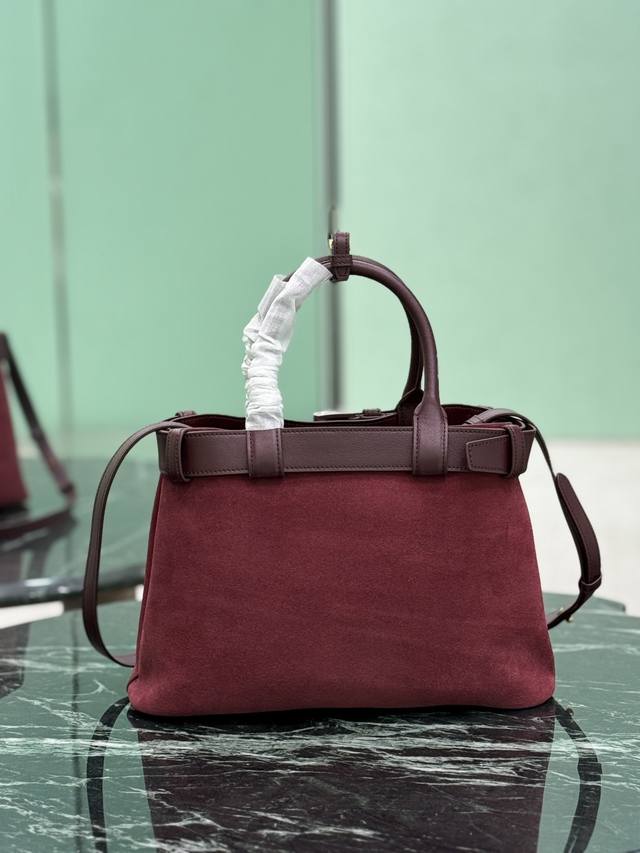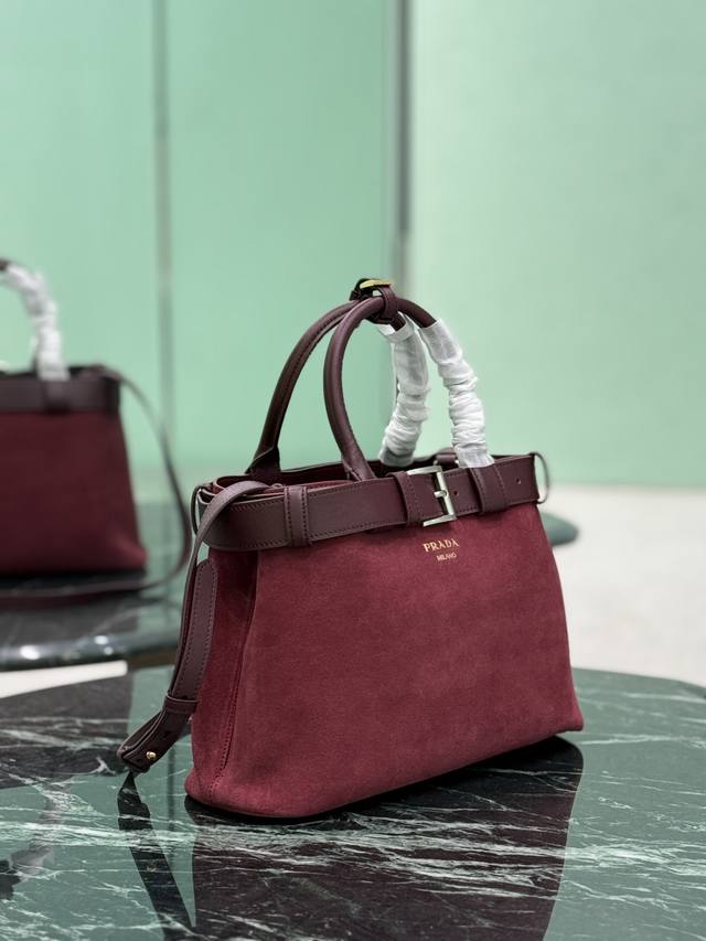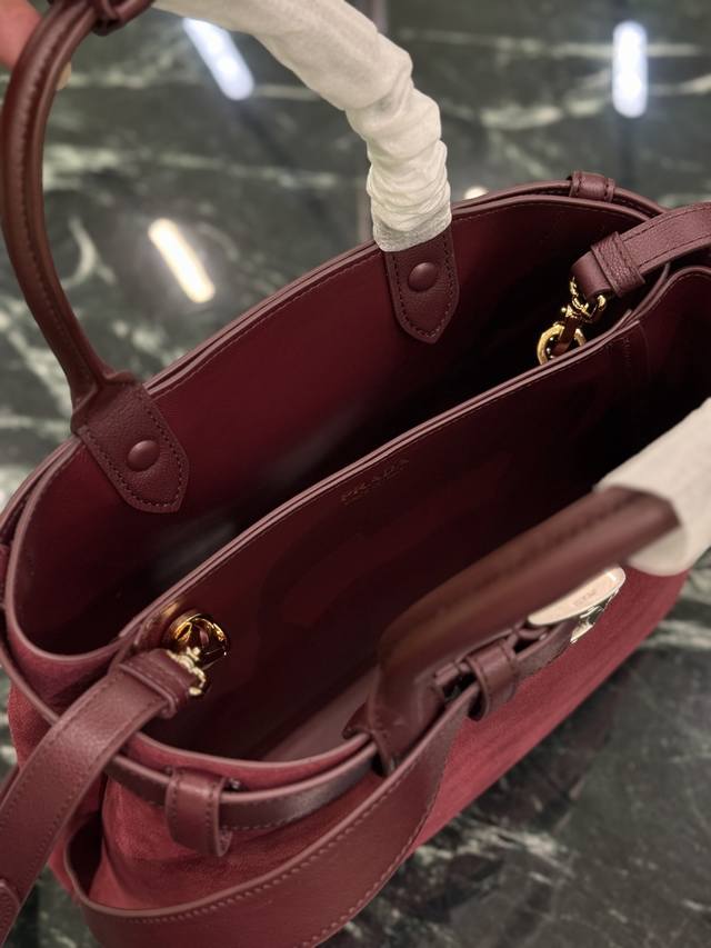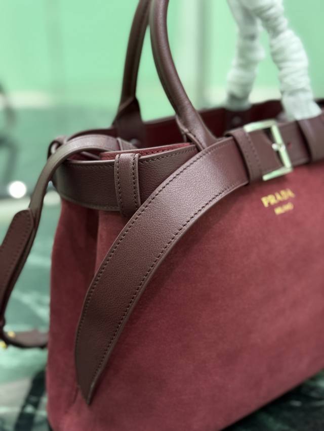 The new Doublebag shopping bag is made of imported Double suede cowhide with a full sheepskin lining. The elegant and simple design features a printed logo on the front and an adjustable shoulder strap. It has three built-in compartments, a center inner pocket, and a large leather belt, creating a unique and dynamic look!