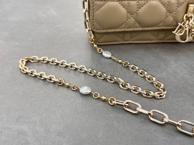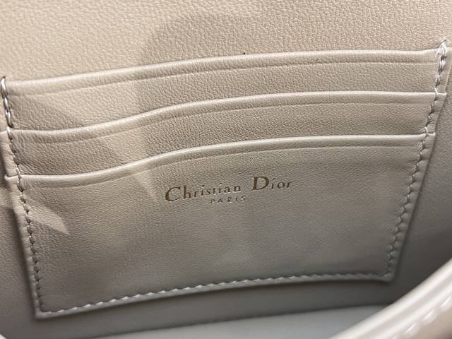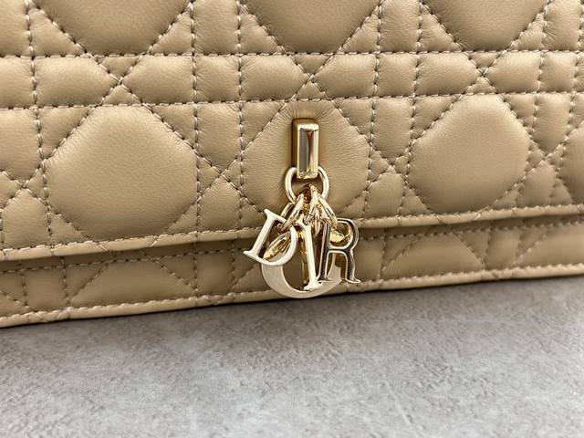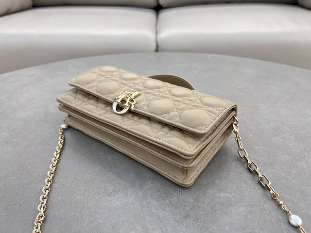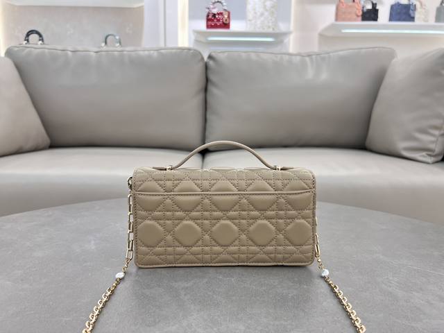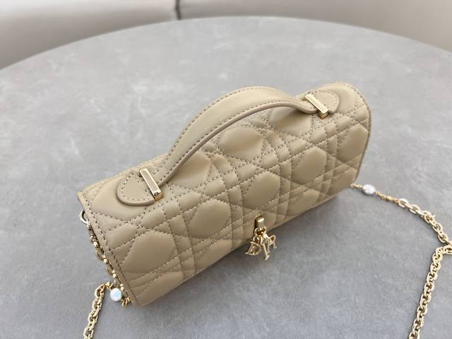 0980 Lambskin Apricot Lady Dior Pearl Clutch This clutch is a new addition to the season. Featuring a top handle, it's elegant and practical, enriching the Lady Dior collection. Crafted from lambskin leather with a cannage pattern, the flap design is adorned with a DIOR charm for added sophistication. Practical in design, it offers multiple compartments and card slots for various everyday essentials, making it an ideal companion for both day and evening wear. The top handle features a detachable chain embellished with beads for added refinement, allowing it to be carried by hand or worn crossbody. Dimensions: 21 x 11.5 x 4.5 cm Code: 0980 Front DIOR charm Flap closure 2 interior compartments Back slip pocket 3 card slots Top leather handle Detachable chain embellished with beads Made in Italy