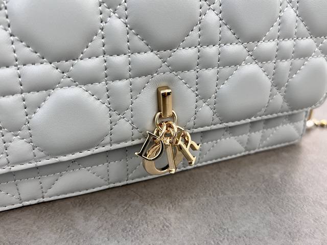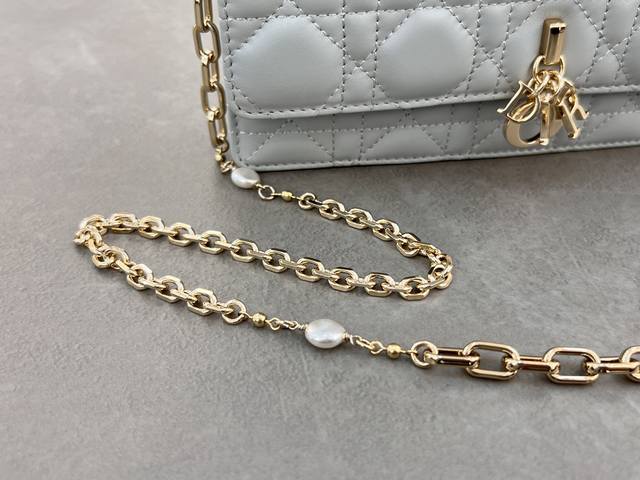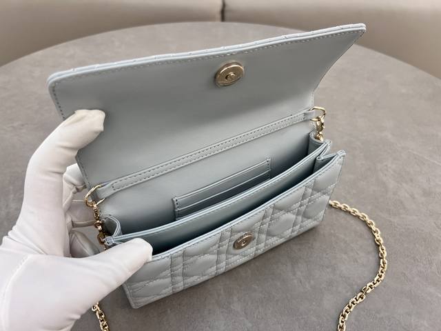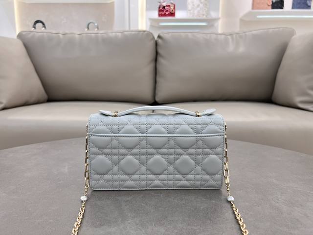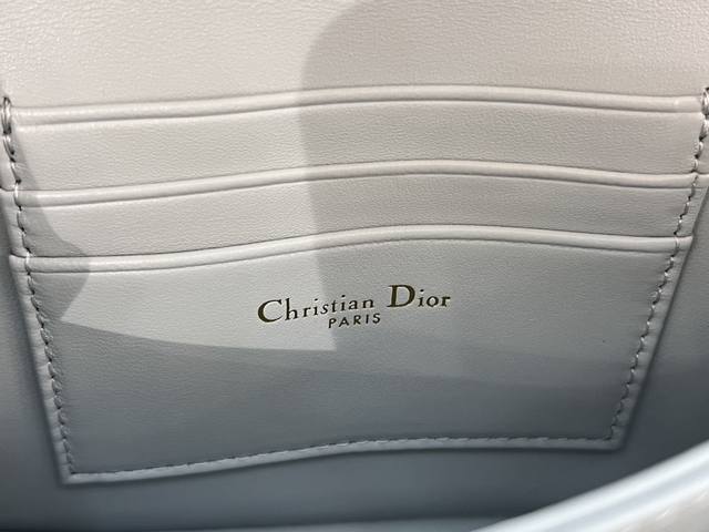 0980 Lambskin Lake Blue Lady Dior Pearl Clutch Bag. This new season clutch features a top handle, combining elegance and practicality to enrich the Lady Dior collection. Crafted from lambskin leather with a cannage pattern, the flap design is adorned with a DIOR charm for added sophistication. Practical in design, it offers multiple compartments and card slots for various everyday essentials, making it an ideal companion for both day and evening wear. The top handle features a detachable chain embellished with beads for added refinement, allowing for hand-carrying or crossbody wear. Dimensions: 21 x 11.5 x 4.5 cm. Code: 0980. Front DIOR charm. Flap closure. 2 interior compartments. Back slip pocket. 3 card slots. Top leather handle. Detachable chain embellished with beads. Made in Italy.
