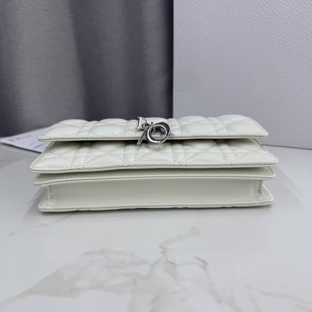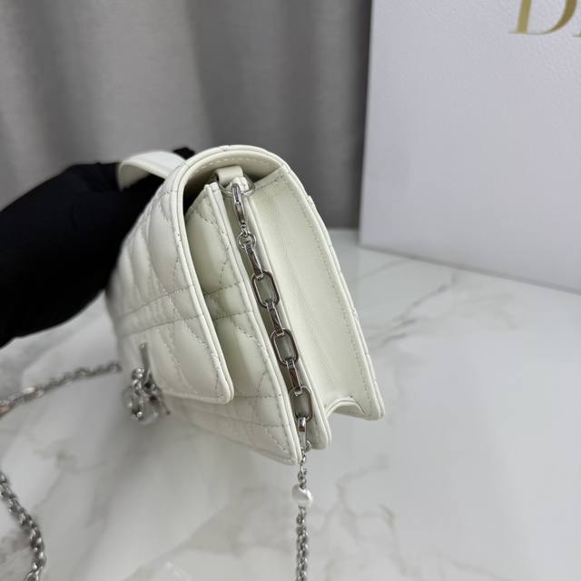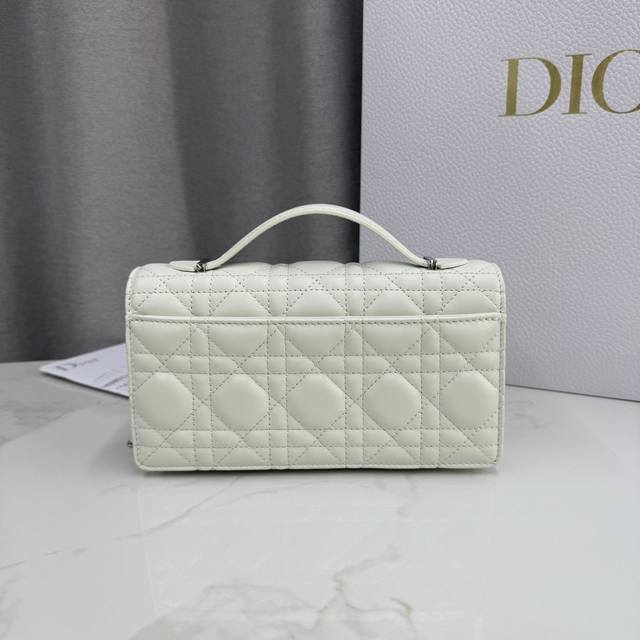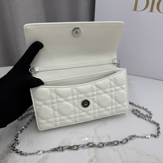 0980 Lambskin Off-White Lady Dior Pearl Clutch Bag. This new season clutch features a top handle, combining elegance and practicality to enrich the Lady Dior collection. Crafted from lambskin leather with a cannage pattern, the flap design is adorned with a DIOR charm for added sophistication. Practical in design, it offers multiple compartments and card slots for various everyday essentials, making it an ideal companion for both day and evening wear. The top handle features a detachable chain embellished with beads for added refinement, allowing for hand-carrying or crossbody wear. Dimensions: 21 x 11.5 x 4.5 cm. Code: 0980. Front DIOR charm. Flap closure. 2 interior compartments. Back slip pocket. 3 card slots. Top leather handle. Detachable chain embellished with beads. Made in Italy.