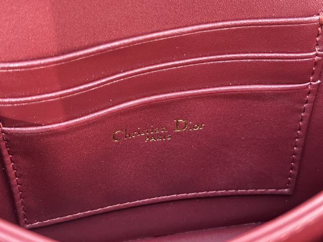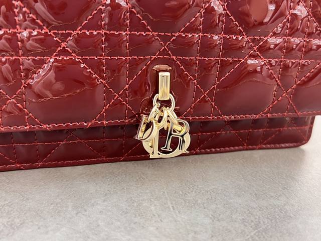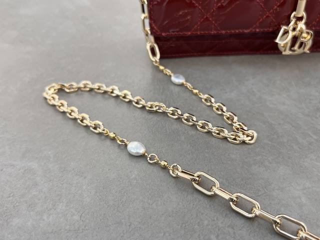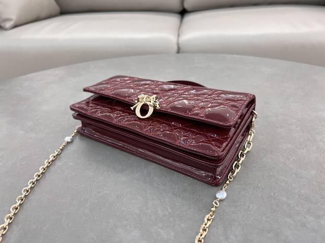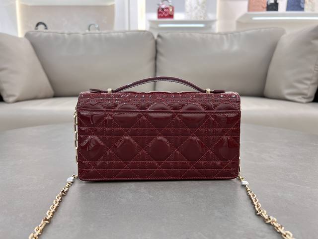 0980 Lambskin Patent Leather Burgundy Lady Dior Pearl Clutch Bag. This new season clutch features a top handle, combining elegance and practicality to enrich the Lady Dior collection. Crafted from lambskin leather with a cannage pattern, the flap design is adorned with a DIOR charm for added sophistication. Practical in design, it offers multiple compartments and card slots for various everyday essentials, making it an ideal companion for both day and evening wear. The top handle features a detachable chain embellished with beads for added refinement, and can be carried by hand or worn crossbody. Dimensions: 21 x 11.5 x 4.5 cm. Code: 0980. Front DIOR charm. Flap closure. 2 interior compartments. Back slip pocket. 3 card slots. Top leather handle. Detachable chain embellished with beads. Made in Italy.