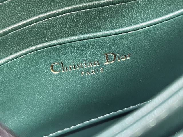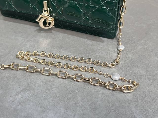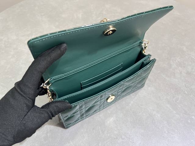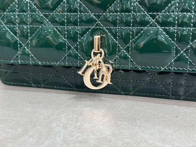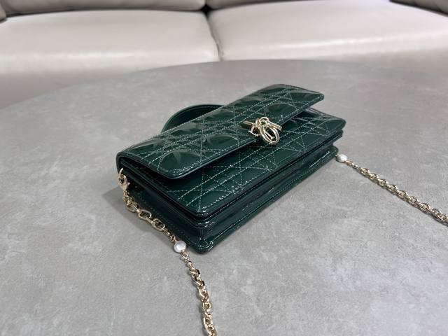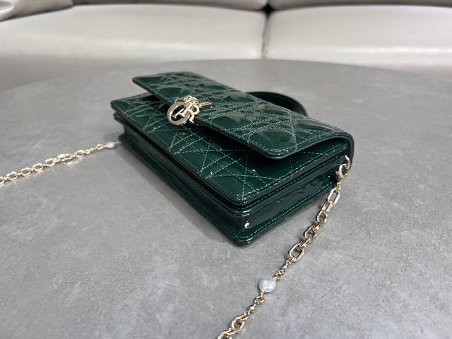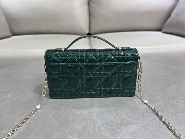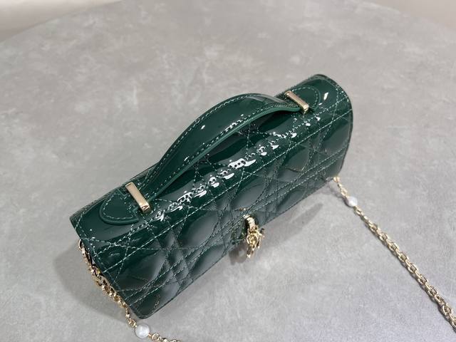 0980 Lambskin Patent Leather Dark Green Lady Dior Pearl Clutch Bag. This new season clutch features a top handle, combining elegance and practicality to enrich the Lady Dior collection. Crafted from lambskin leather with a cannage pattern, the flap design is adorned with a DIOR charm for added sophistication. Practical in design, it offers multiple compartments and card slots for various everyday essentials, making it an ideal companion for both day and evening wear. The top handle features a detachable chain embellished with beads for added refinement, and can be carried by hand or crossbody. Dimensions: 21 x 11.5 x 4.5 cm. Code: 0980. Front DIOR charm. Flap closure. 2 interior compartments. Back slip pocket. 3 card slots. Top leather handle. Detachable chain embellished with beads. Made in Italy.