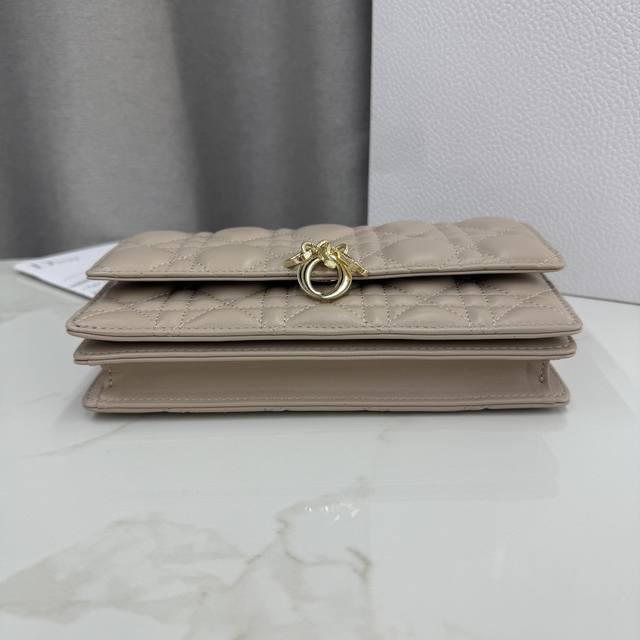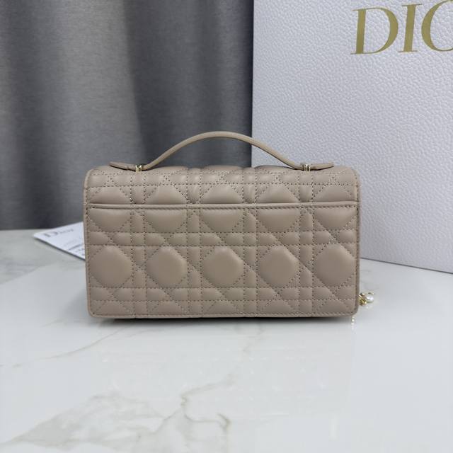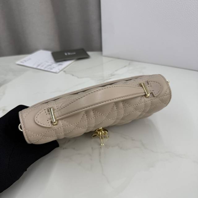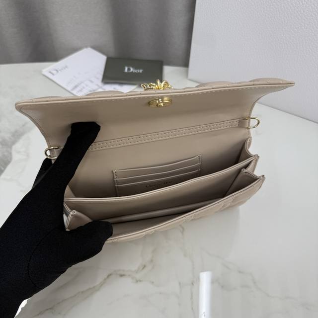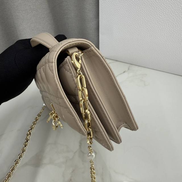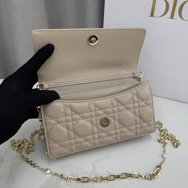 0980 Lambskin Rouge Beige Lady Dior Pearl Clutch This clutch is a new addition this season, featuring a top handle that is both elegant and practical, enriching the Lady Dior collection. Crafted from lambskin leather with a cannage pattern, the flap design is adorned with a DIOR charm for added sophistication. Practical in design, it offers multiple compartments and card slots for various everyday essentials, making it an ideal companion for both day and evening wear. The top handle features a detachable chain embellished with beads for added refinement, and can be carried by hand or worn crossbody. Dimensions: 21 x 11.5 x 4.5 cm Code: 0980 Front DIOR charm Flap closure 2 interior compartments Back slip pocket 3 card slots Top leather handle Detachable chain embellished with beads Made in Italy