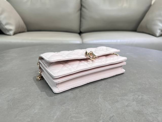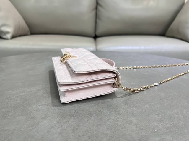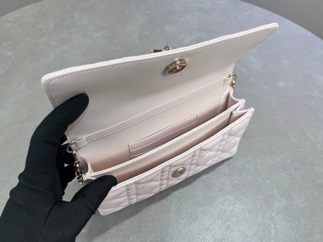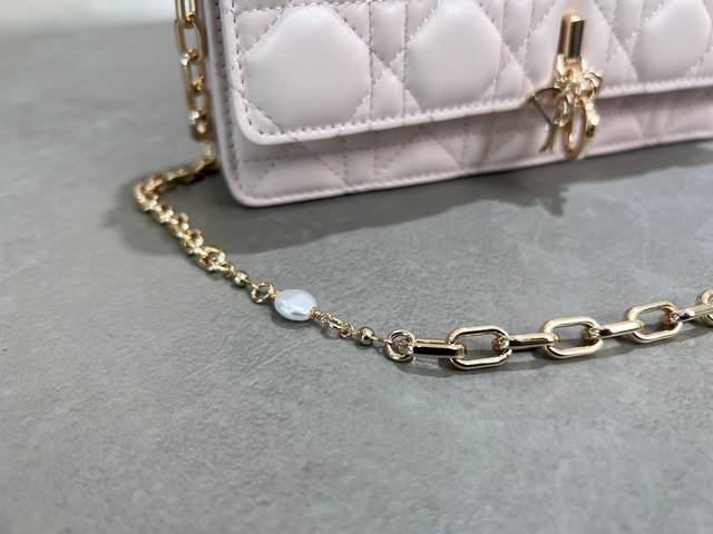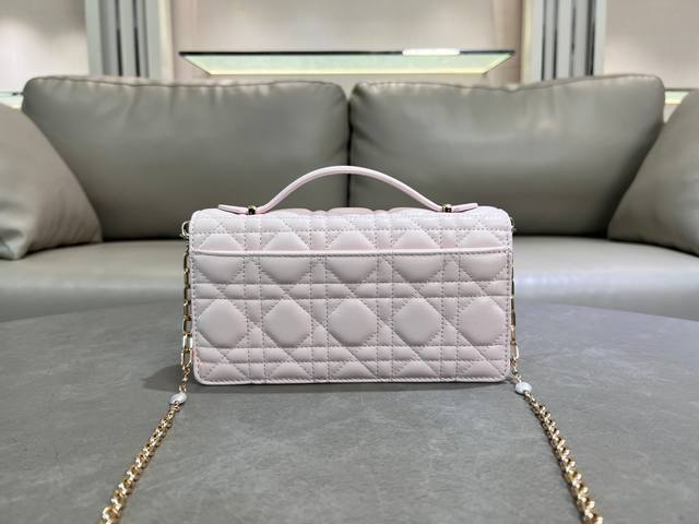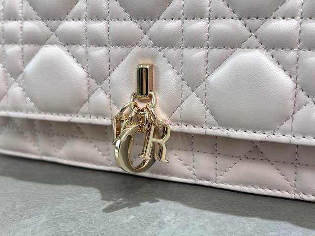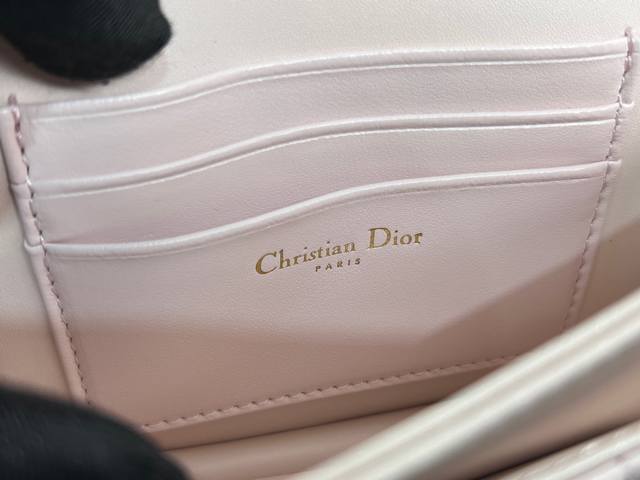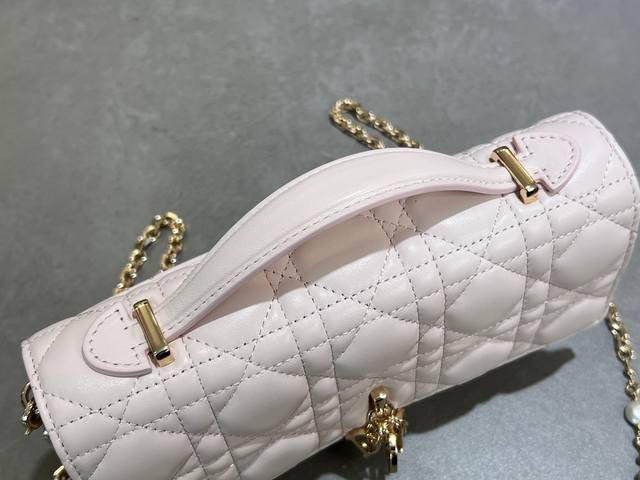 0980 Light Pink Lambskin Lady Dior Pearl Clutch Bag. This new season clutch features a top handle, combining elegance and practicality to enrich the Lady Dior collection. Crafted from lambskin leather with a cannage pattern, the flap design is adorned with a DIOR charm for added sophistication. Practical in design, it offers multiple compartments and card slots for various everyday essentials, making it an ideal companion for both day and evening wear. The top handle features a detachable chain embellished with beads for added refinement, and can be carried by hand or crossbody. Dimensions: 21 x 11.5 x 4.5 cm. Code: 0980. Front DIOR charm. Flap closure. 2 interior compartments. Back slip pocket. 3 card slots. Top leather handle. Detachable chain embellished with beads. Made in Italy.
