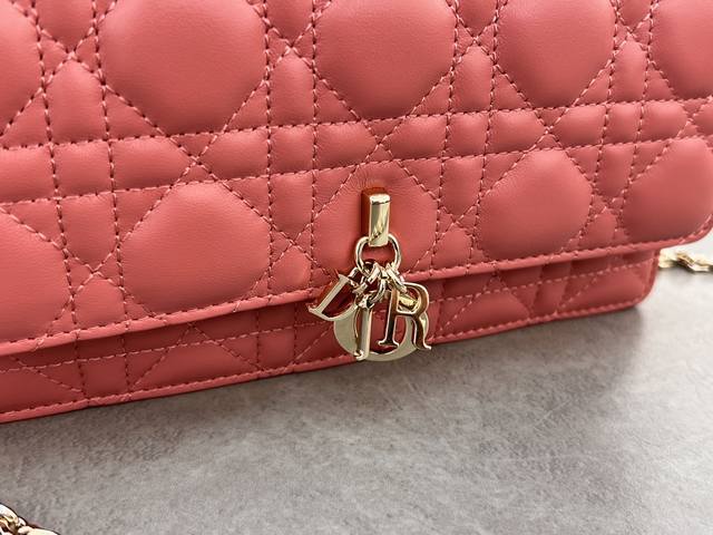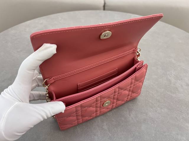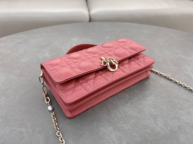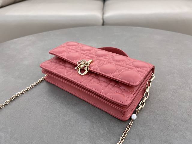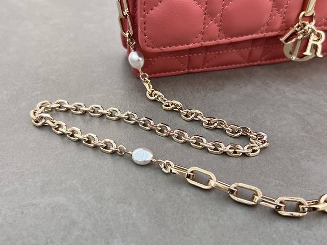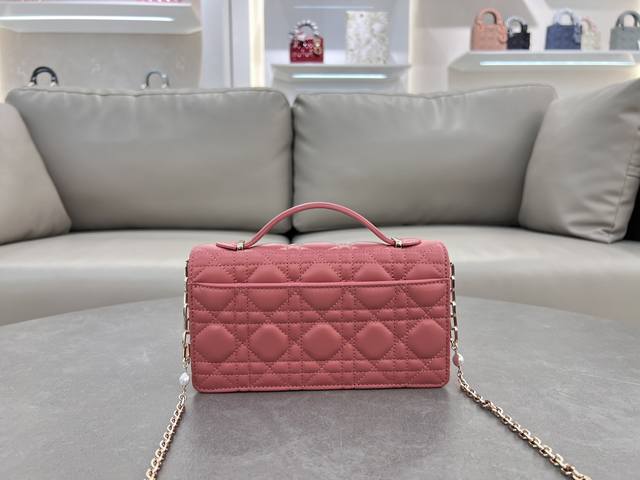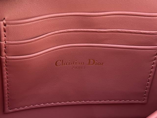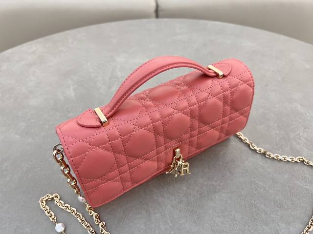 0980 Light Pink Lambskin Lady Dior Pearl Clutch Bag. This new season clutch features a top handle, combining elegance and practicality to enrich the Lady Dior collection. Crafted from lambskin leather with a cannage pattern, the flap design is adorned with a DIOR charm for added sophistication. Practical in design, it offers multiple compartments and card slots for various everyday essentials, making it an ideal companion for both day and evening wear. The top handle features a detachable chain embellished with beads for added refinement, and can be carried by hand or crossbody. Dimensions: 21 x 11.5 x 4.5 cm. Code: 0980. Front DIOR charm. Flap closure. 2 interior compartments. Back slip pocket. 3 card slots. Top leather handle. Detachable chain embellished with beads. Made in Italy.