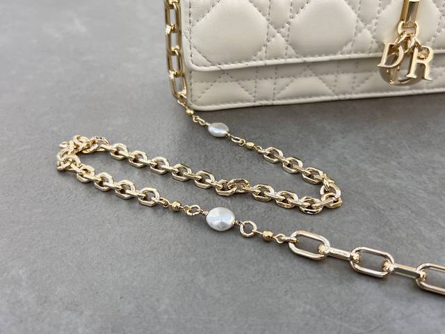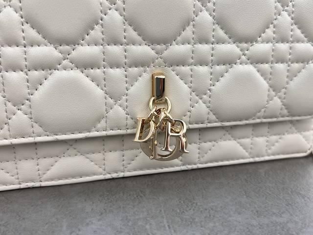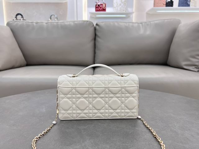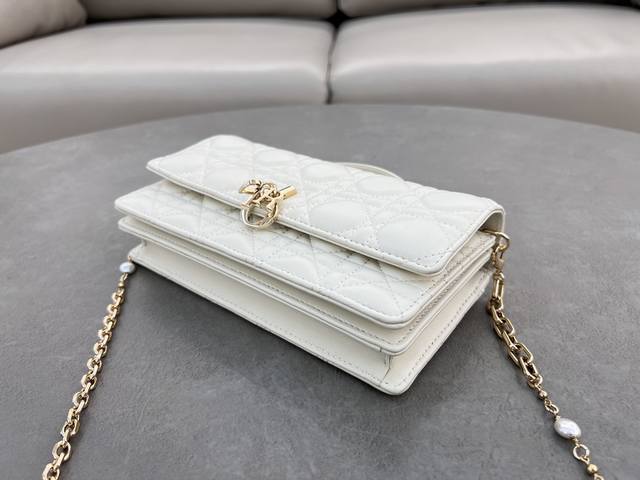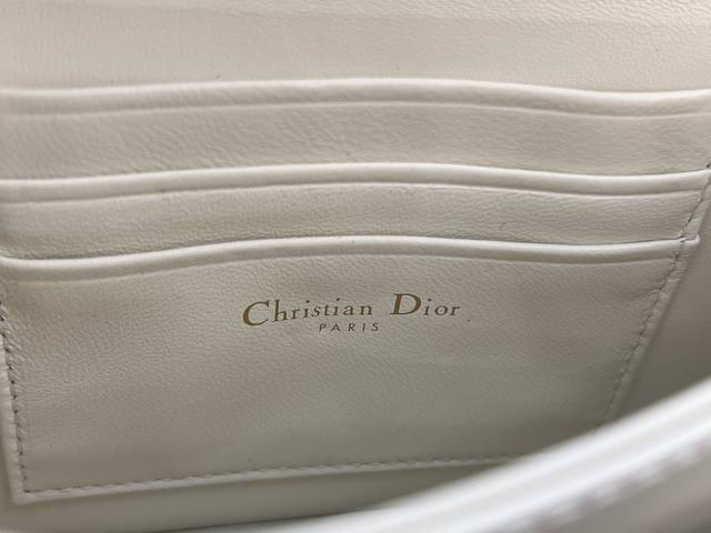 0980 White Lambskin Lady Dior Pearl Clutch Bag. This new season clutch features a top handle, combining elegance and practicality to enrich the Lady Dior collection. Crafted from lambskin leather with a cannage pattern, the flap design is adorned with a DIOR charm for added sophistication. Practical in design, it offers multiple compartments and card slots for various everyday essentials, making it an ideal companion for both day and evening wear. The top handle features a detachable chain embellished with beads for added refinement, and can be carried by hand or crossbody. Dimensions: 21 x 11.5 x 4.5 cm. Code: 0980. Front DIOR charm. Flap closure. 2 interior compartments. Back slip pocket. 3 card slots. Top leather handle. Detachable chain embellished with beads. Made in Italy.