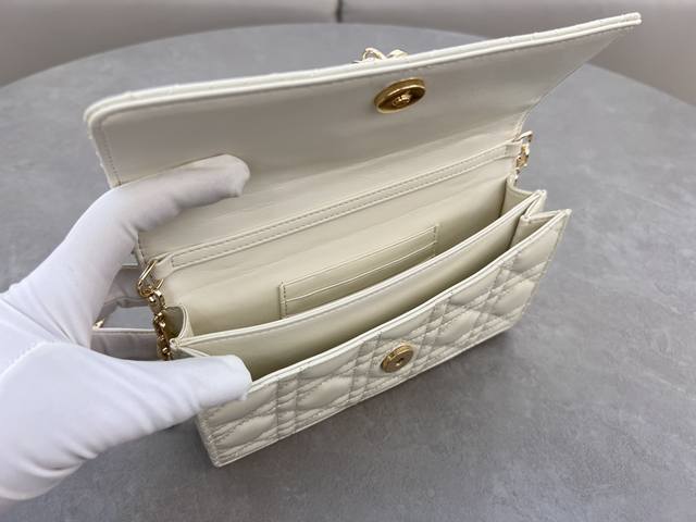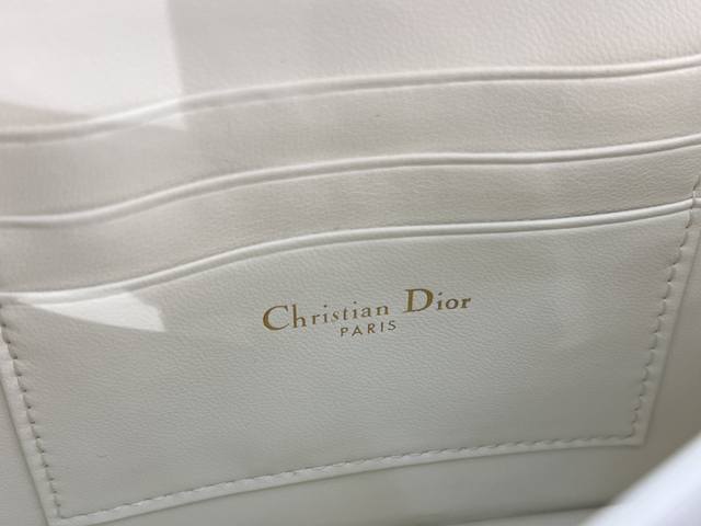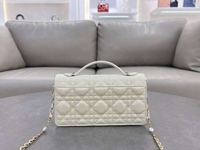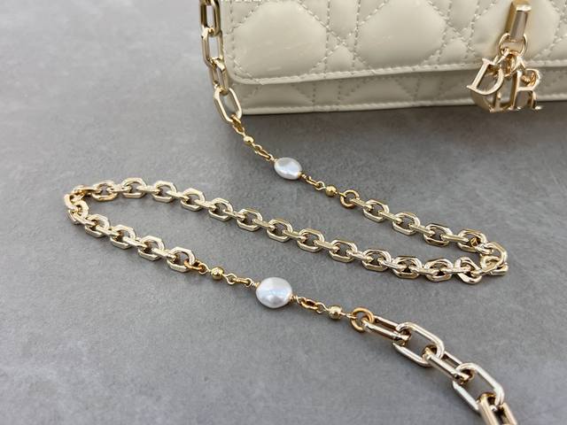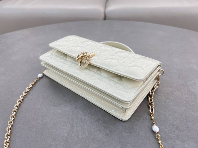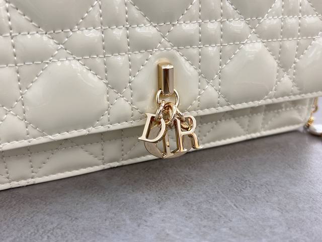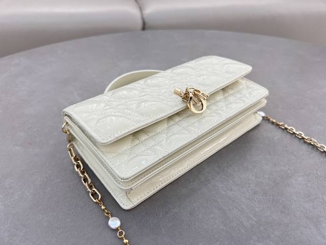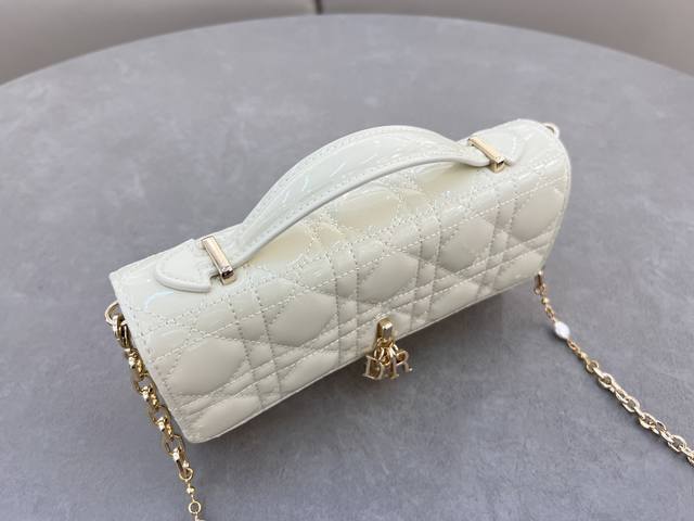 0980 White Lambskin Patent Leather Lady Dior Pearl Clutch Bag. This new season clutch features a top handle, combining elegance and practicality to enrich the Lady Dior collection. Crafted from lambskin leather with a cannage pattern, the flap design is adorned with a DIOR charm for added sophistication. Practical in design, it offers multiple compartments and card slots for various everyday essentials, making it an ideal companion for both day and evening wear. The top handle features a detachable chain embellished with beads for added refinement, and can be carried by hand or worn crossbody. Dimensions: 21 x 11.5 x 4.5 cm. Code: 0980. Front DIOR charm. Flap closure. 2 interior compartments. Back slip pocket. 3 card slots. Top leather handle. Detachable chain embellished with beads. Made in Italy.