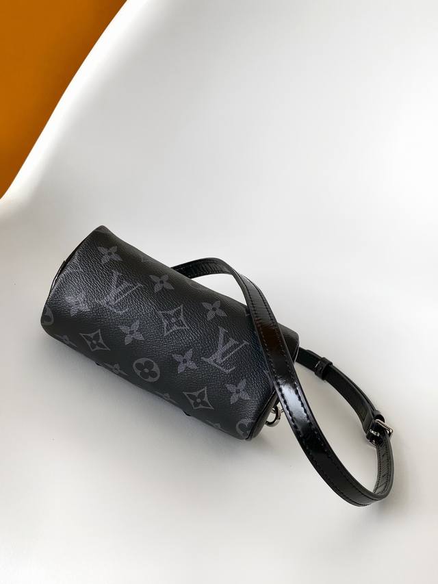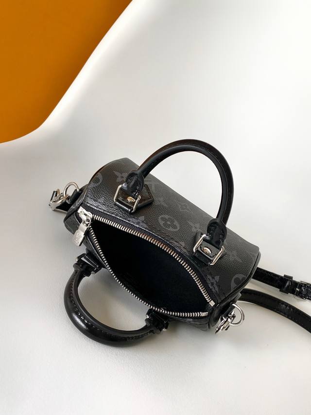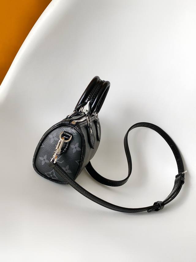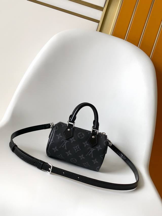 This Nano Speedy handbag features a sleek canvas design with an elegant Monogram Eclipse pattern, effortlessly brightening your look for day or night. Lustrous metal hardware exudes sophistication, and the ample space can accommodate everyday essentials like a short wallet. The detachable shoulder strap allows for multiple carrying options.