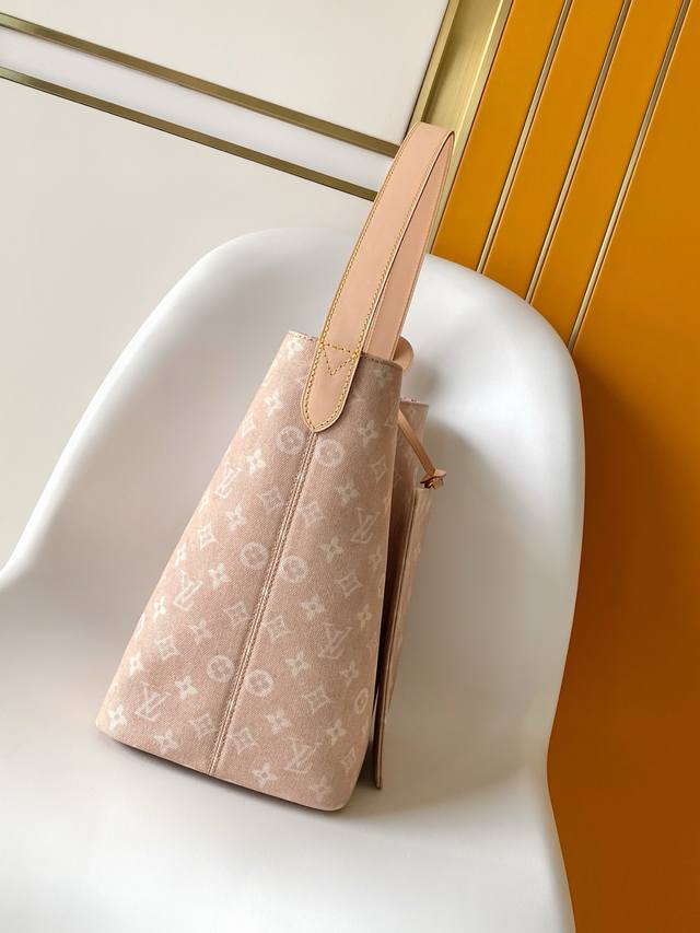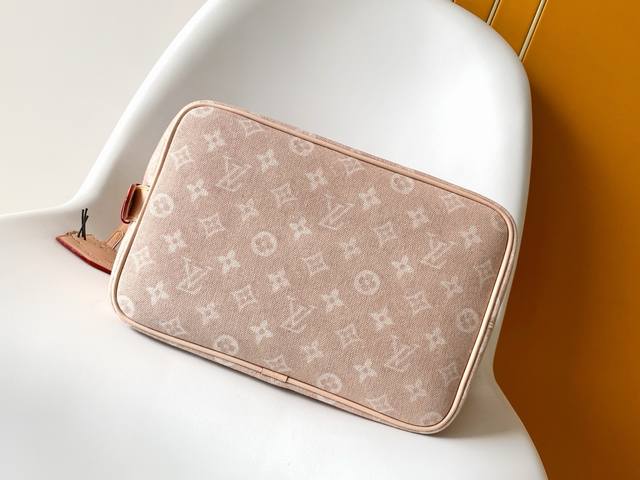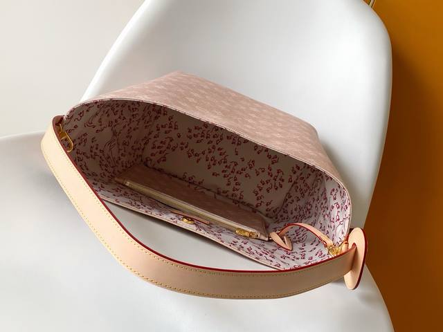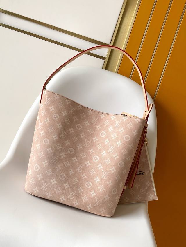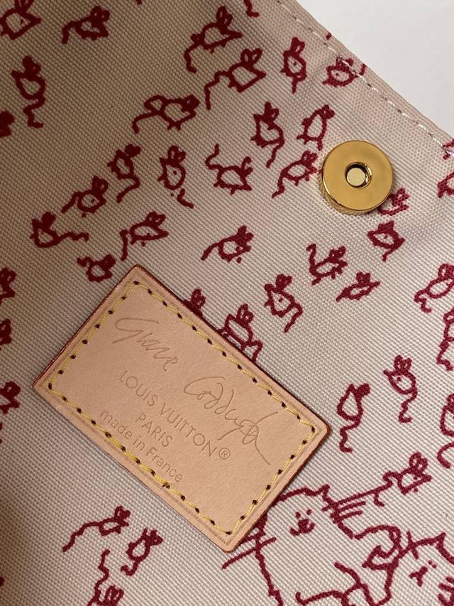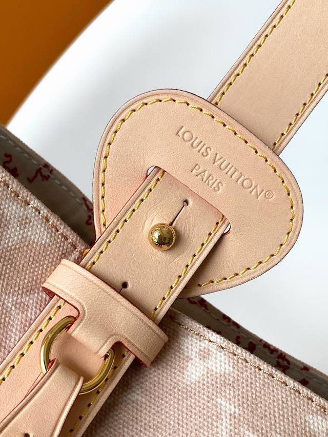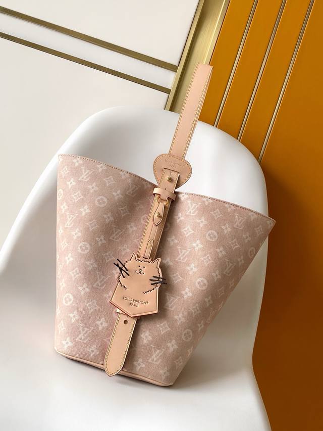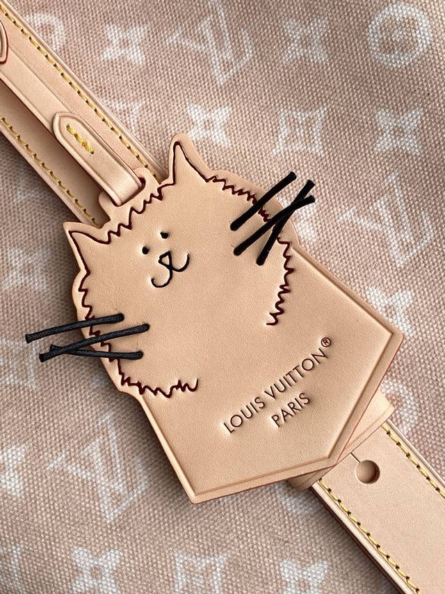 163C01 Dynamic Chip Top-Tier Original All-In Large Handbag from the LV Travels With series, showcasing the design aesthetics of fashion icon and artist Grace Coddington with its Meowgram pattern. The canvas body is accented with cowhide leather trim and a playful cat-shaped key pouch. The bucket shape easily accommodates everyday essentials such as a laptop, while a detachable zippered pocket adds further functionality. Meowgram coated canvas