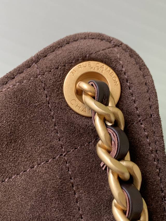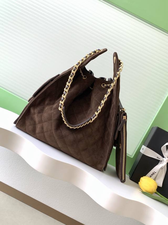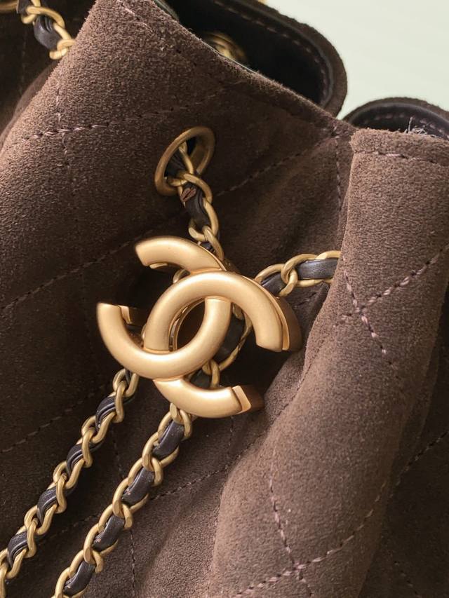 25K Suede Bag, Vintage Gold Coin Button Drawstring Bucket Bag with Quilted Pattern and Classic Chain Design, Exuding Sophistication! A must-have for everyday outings, exquisite appearance, delicate texture, easily complementing both casual and formal occasions. Style Number As5311, Size 30-40-15.