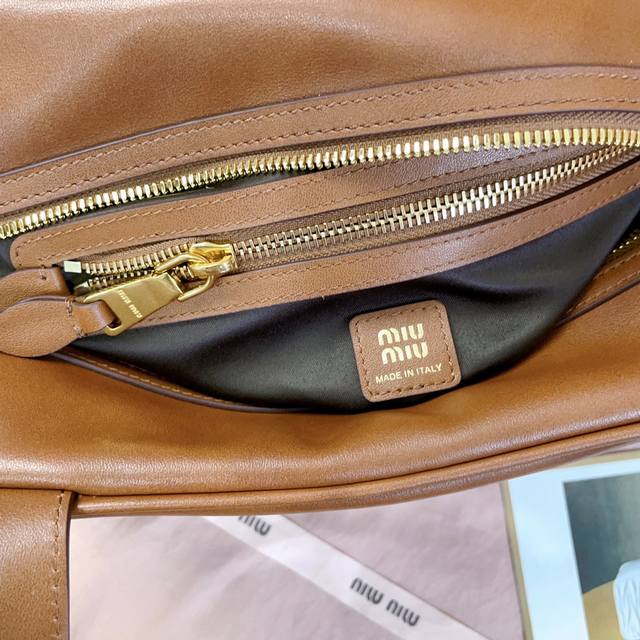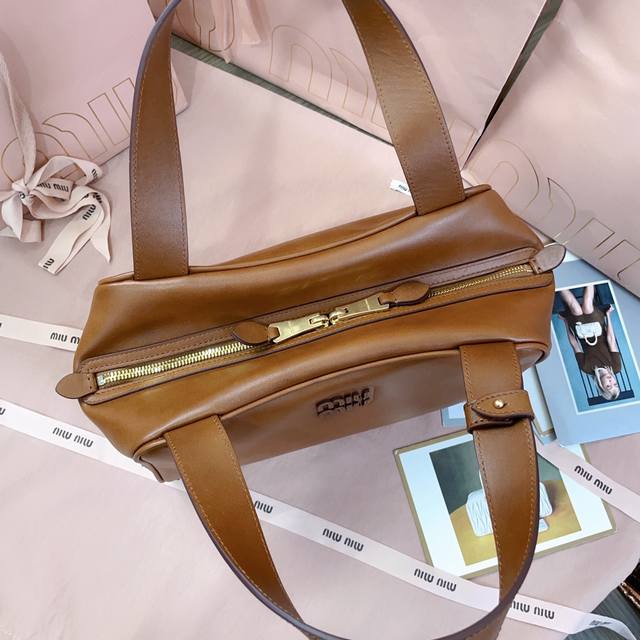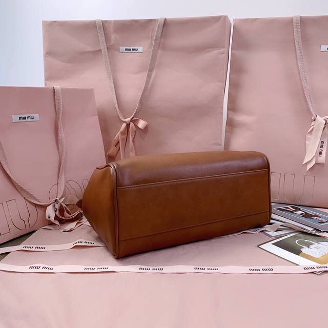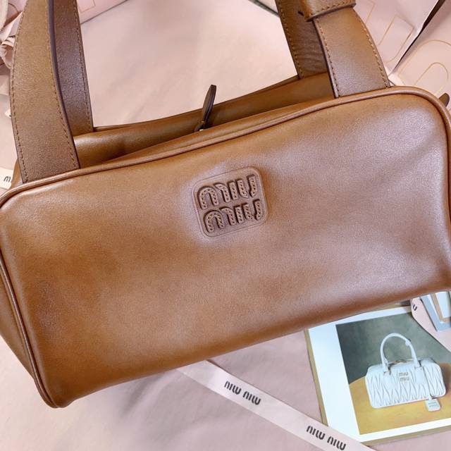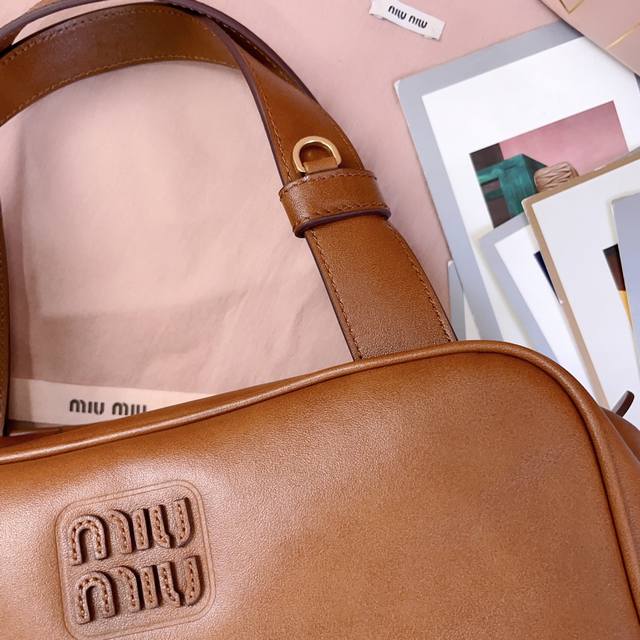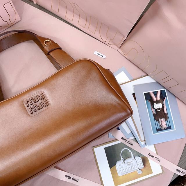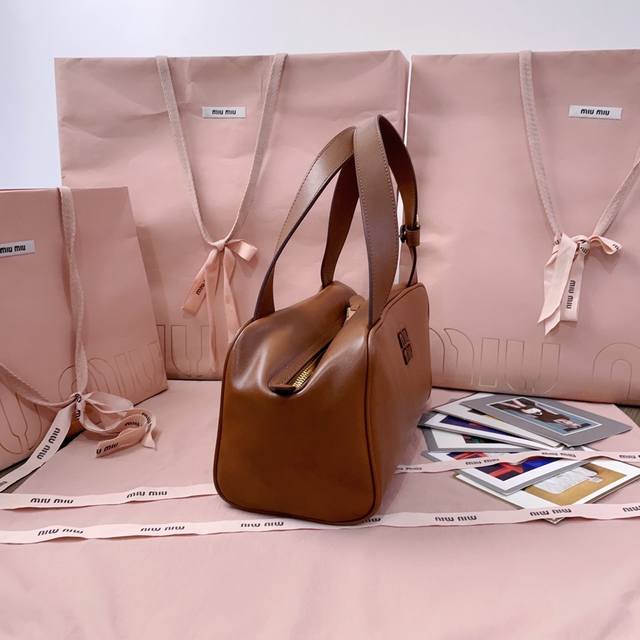 5Bb182, New and Popular Underarm Bowling Bag. This reinterpretation of the handbag features a flat handle, an elegant logo on the front, and the subtle sheen of soft calfskin, embodying Miu M's refined experimental spirit. The leather is soft and high-quality, with a novel and unique style. It has a cotton satin lining, an interior zip pocket, and is suitable for carrying by hand or over the shoulder. Dimensions: 28X15X13Cm.
