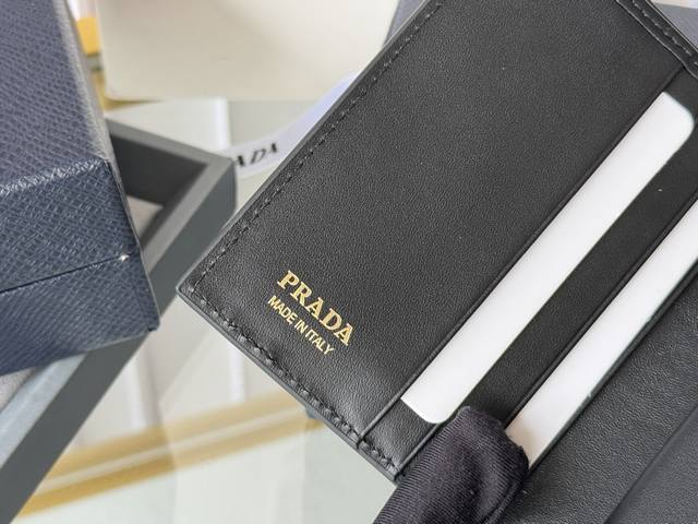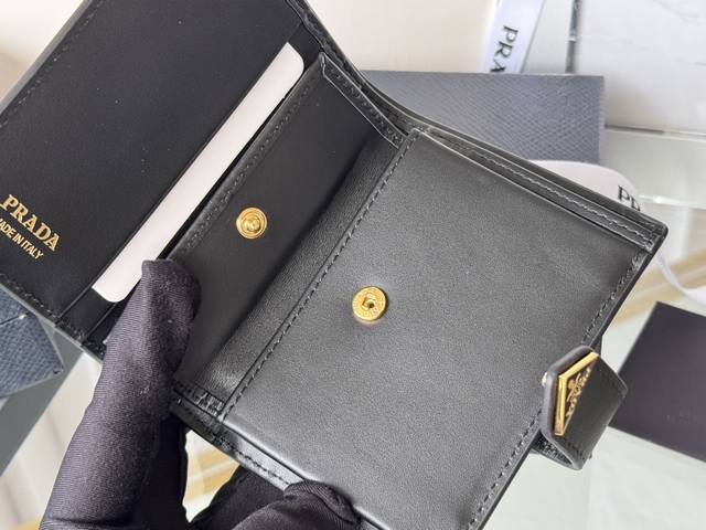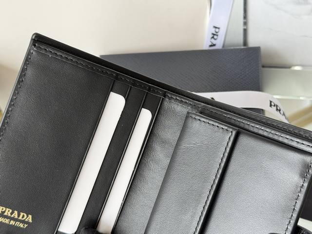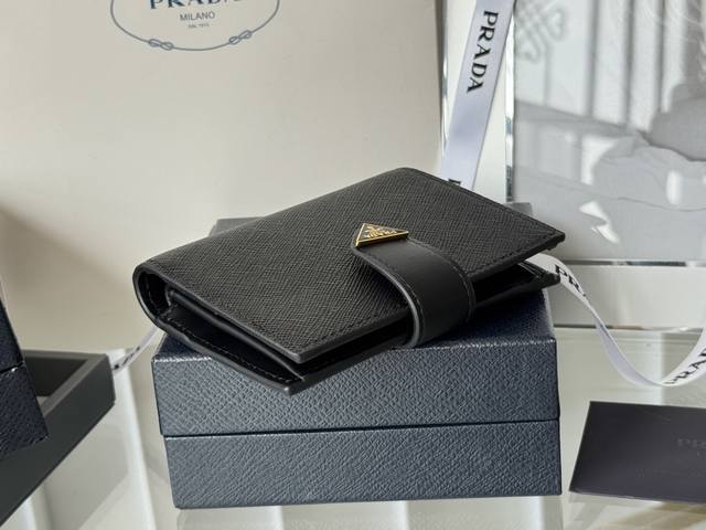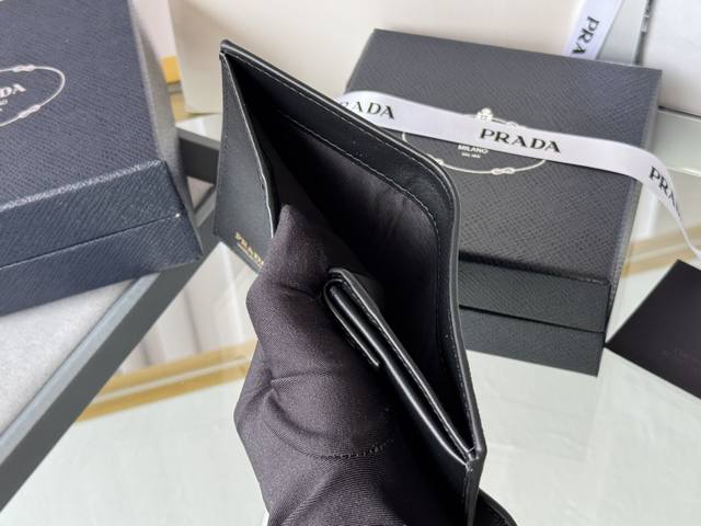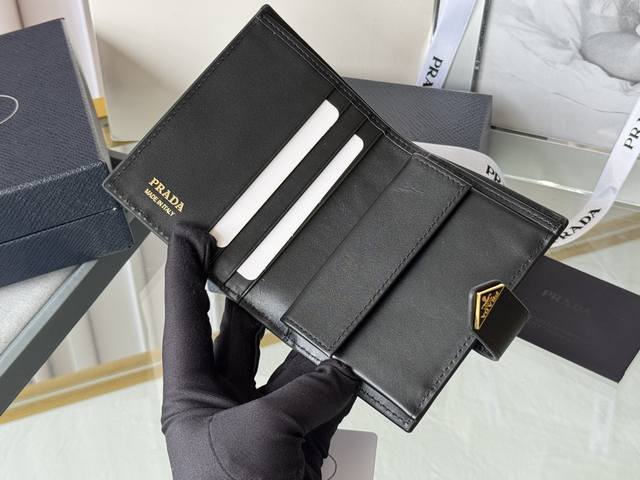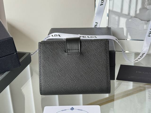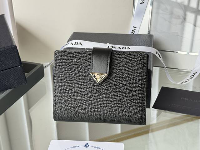 A classic Prada wallet, simple and stylish. Model 1Mv204. This simple yet elegant small wallet is crafted from smooth leather and Saffiano leather. Saffiano leather features a cross-stitch texture, a signature Prada material. The wallet has a simple and sophisticated design with multiple compartments and pockets, and the iconic enamel triangle logo adorns the closure, showcasing the brand's style. Dimensions: 11.2*8.5Cm.