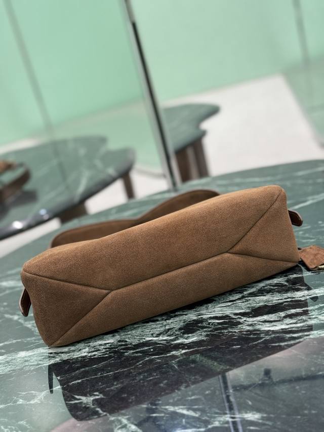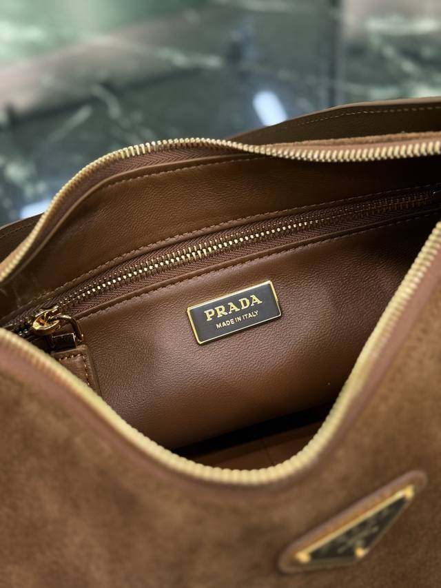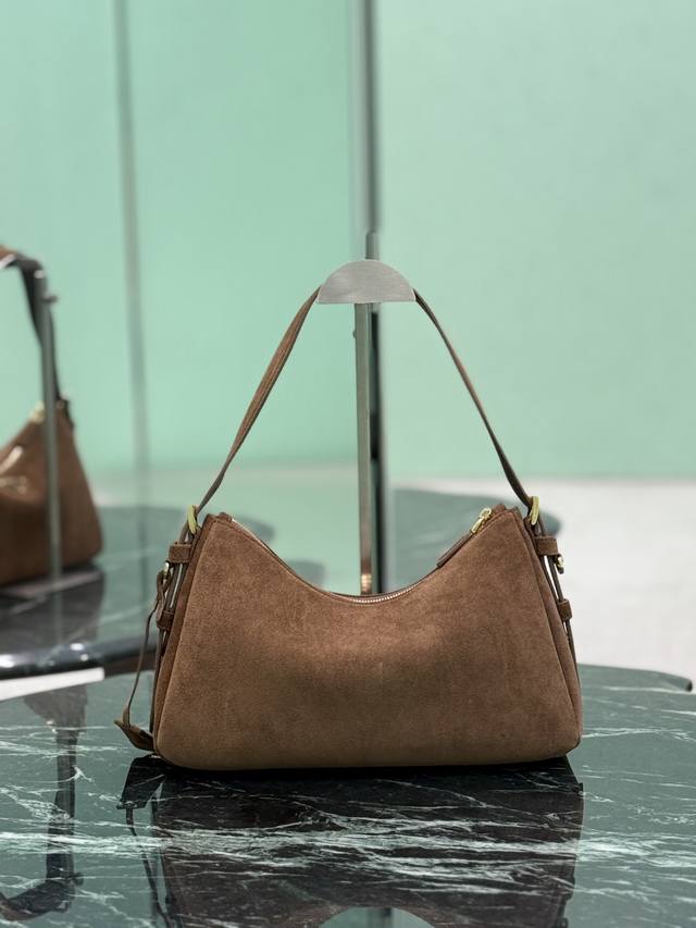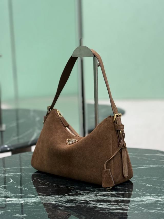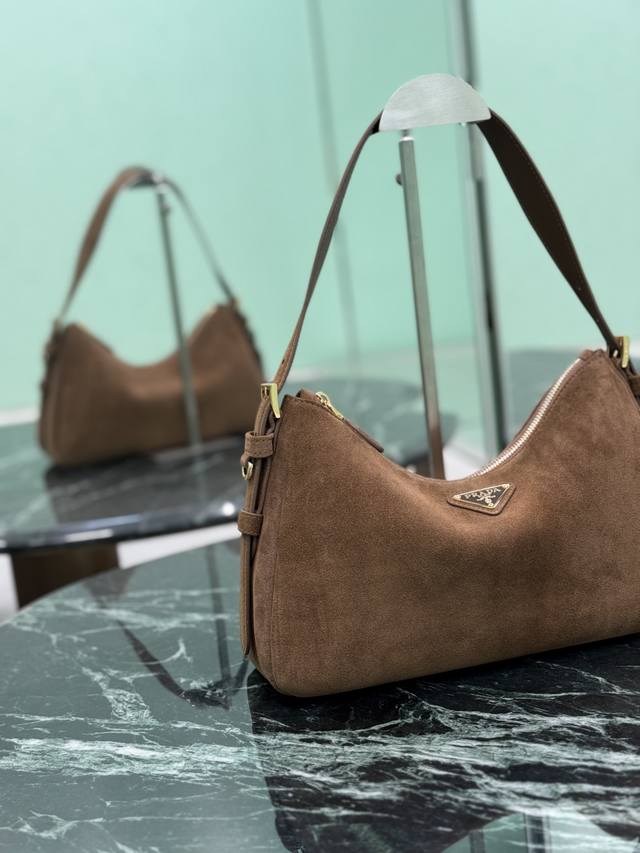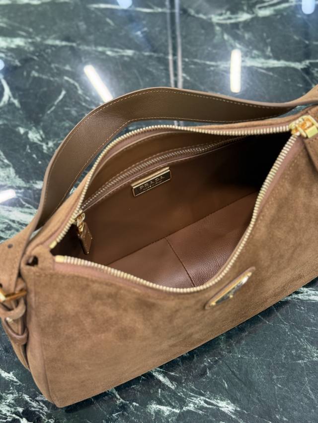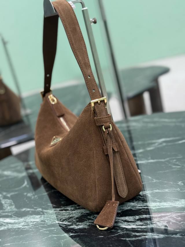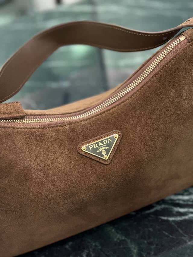 ) Dark Brown. This leather Hobo shoulder bag features a simple yet elegant design. Made of imported suede, it has a metal triangular enamel logo on the front and a detachable leather shoulder strap. The leather is soft and supple, practical, lightweight, spacious, and versatile. Dimensions: Length 31cm x Height 18cm x Base 10cm. Style Number: 1Bc229