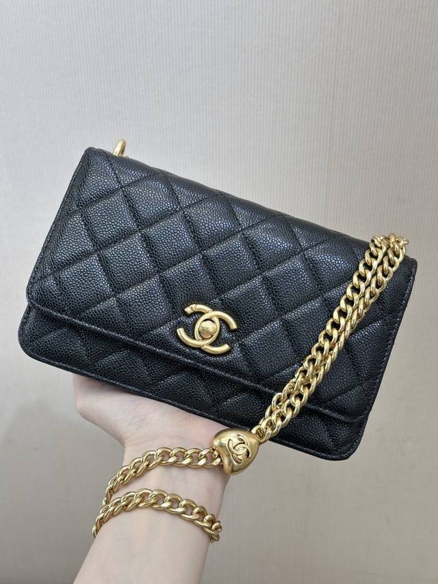 Although many brands have launched WOC (Wallet on Chain) bags, Chanel's WOC is the most desirable. I waited three months to receive this 24S series WOC "Fortune Bag"! The gold heart charm is the highlight of this bag; it's so exquisite and an attractive embellishment, paying homage to the classic design. The shoulder strap is a vintage gold chain with a retractable design. The interior is surprisingly compact; it can hold a compact powder, tissues, lipstick, ID card, vehicle registration, car keys... even an iPhone Pro Max fits easily. Model: 3201 Size: 19-12-4cm