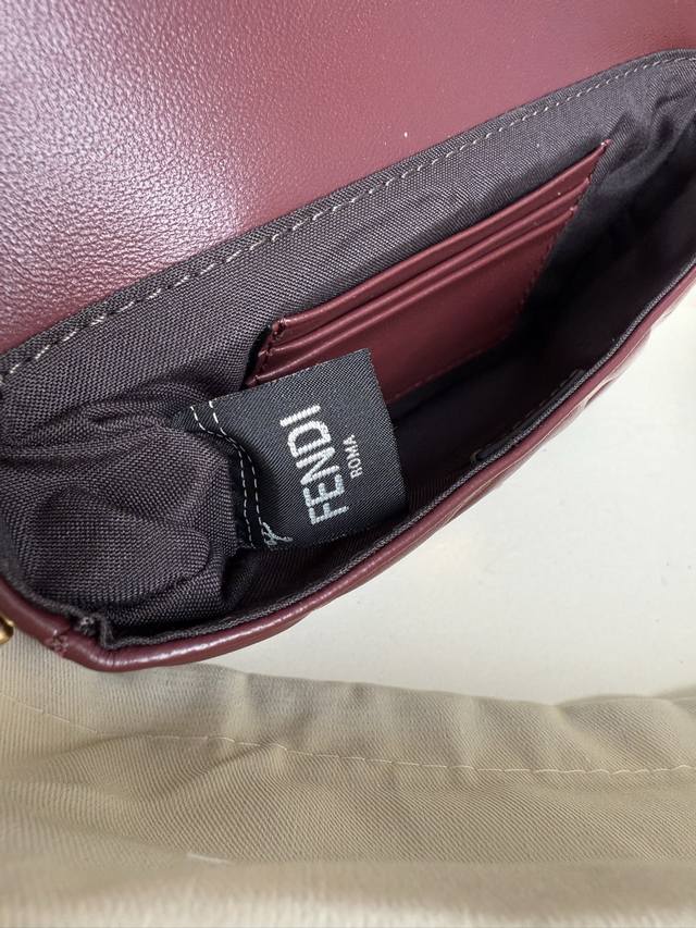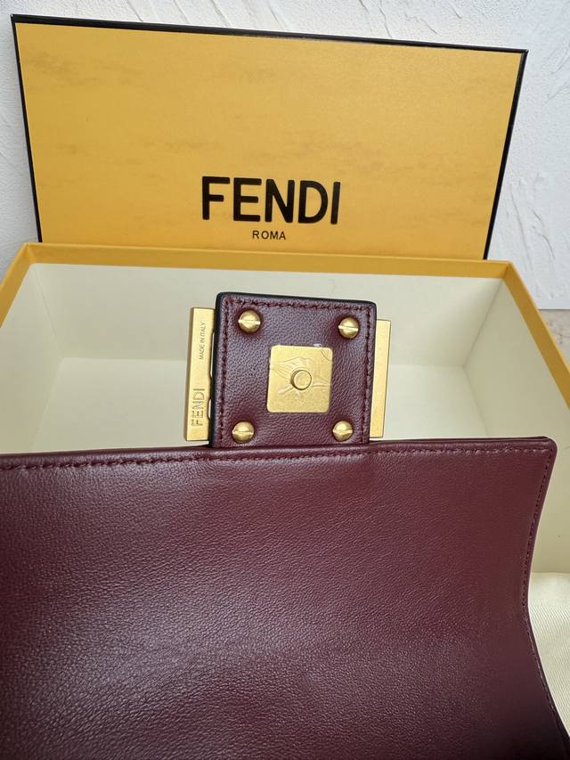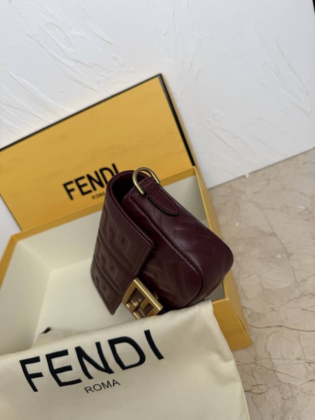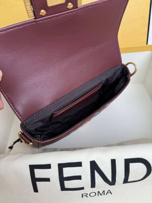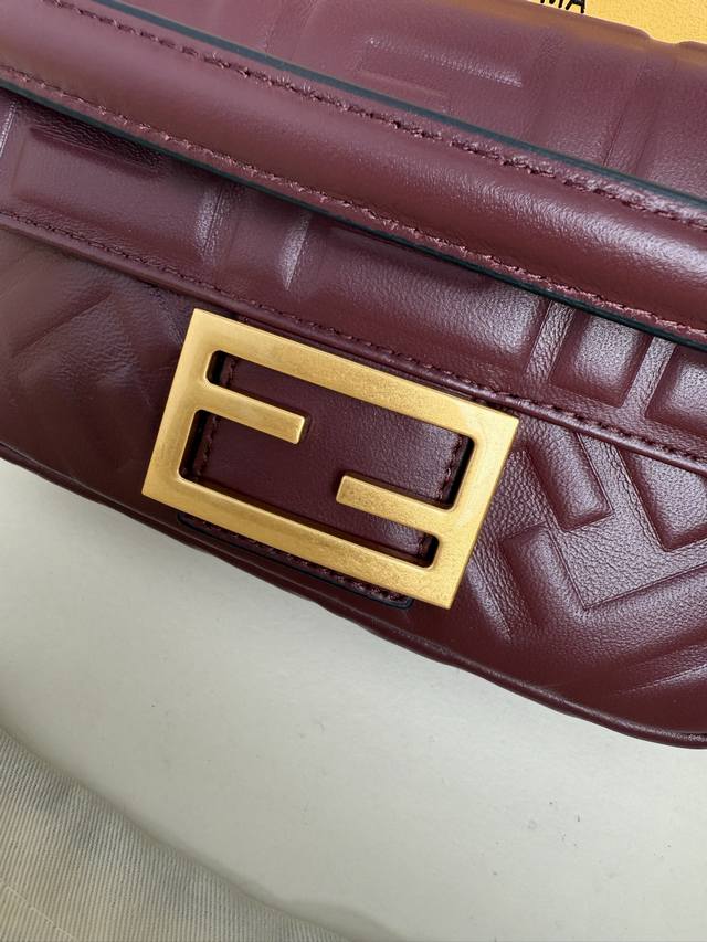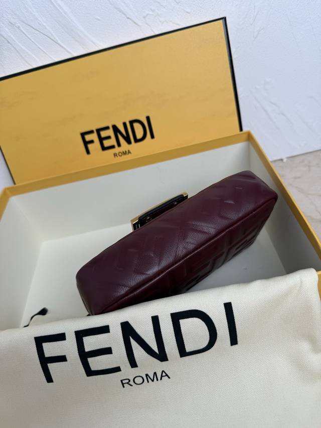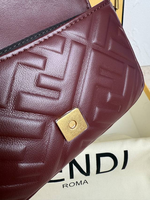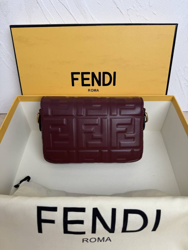 Authentic Baguette Handbag, Colored Leather Handbag. More details: Iconic Baguette mini handbag, made of Nappa leather with a 3D textured pattern. Features an Ff clasp. Front flap, magnetic closure, lined interior compartment, pockets, and gold-tone hardware. The bag comes with a detachable handle and chain shoulder strap, allowing for hand-carrying, shoulder-carrying, or crossbody wear. Material: Outer: Lambskin, Lining: Cotton. Depth: 4 cm. Length: 19 cm. Height: 11.5 cm. Style Number: 0191S.