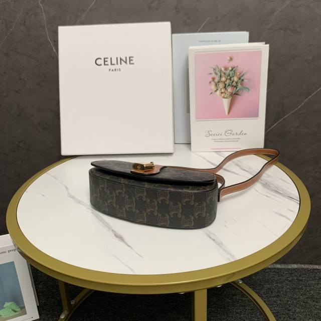 Authentic Cel*Ine Tabou Clutch. A great autumn/winter item, perfect for carrying by hand or over the shoulder. Don't underestimate its capacity! Sufficient for everyday use: phone, powder compact, lipstick, watch. For the super-rich: it can even fit three phones! Features include: leather trim, fabric lining, shoulder or hand carry with a flap closure and decorative snap closure, one main compartment, one interior flat pocket, shoulder strap length 28cm, handle length 7.5cm. Item number: 101592. Brown material with original packaging. Dimensions: 18 x 8 x 5 cm.