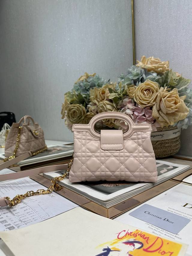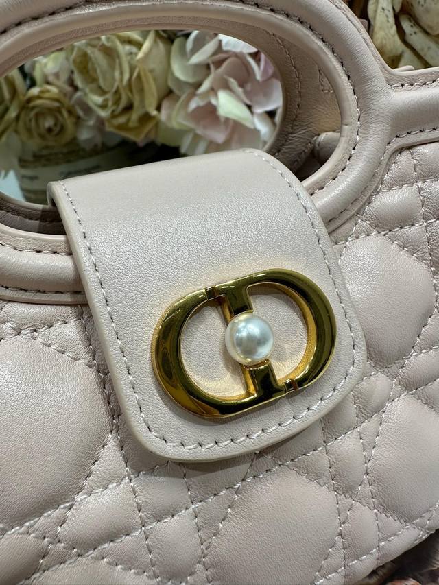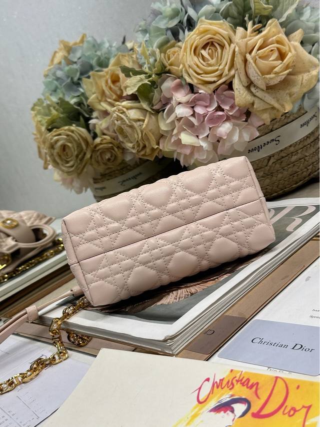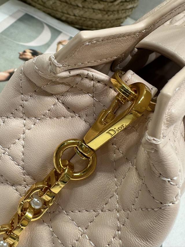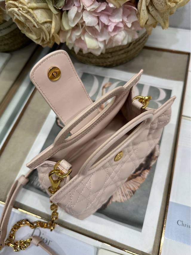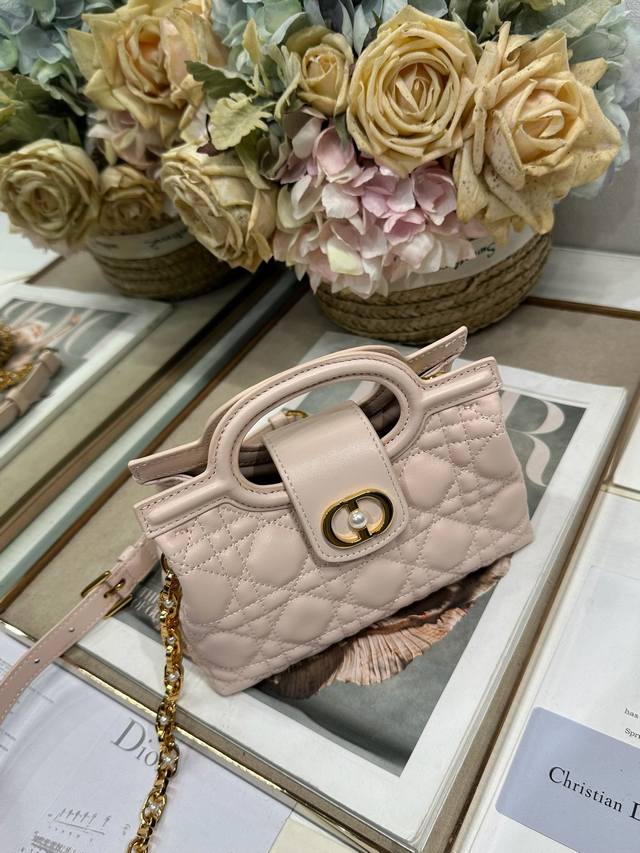 Authentic, High-Quality Dior Jolie Top Handle Mini Chain Handbag in Pink. This Dior Jolie Top Handle mini chain handbag is a new addition to the 2026 Early Spring Ready-to-Wear collection, showcasing an elegant and sophisticated design. Crafted from pink lambskin leather with a cannage pattern, the flap is adorned with a gold-finished Cd logo and white resin beads. An interior compartment provides ample storage for everyday essentials. It features double top handles and an adjustable, detachable Cd chain shoulder strap, composed of leather strap and Cd chain links, embellished with white resin beads. It can be comfortably carried by hand, over the shoulder, or crossbody, complementing both casual and evening looks. Magnetic flip-top opening with Cd buckle and white resin beads on the front. Features one compartment, double top leather handle, and an adjustable, detachable chain with resin beads and a leather strap. Model: 3123. Dimensions: 18.5 x 13 x 8.5 cm (L x H x W). Holds one mobile phone, one card holder, sunglasses, and lipstick.