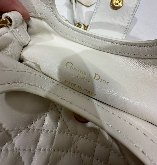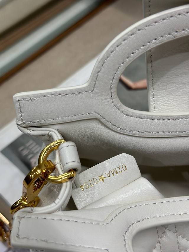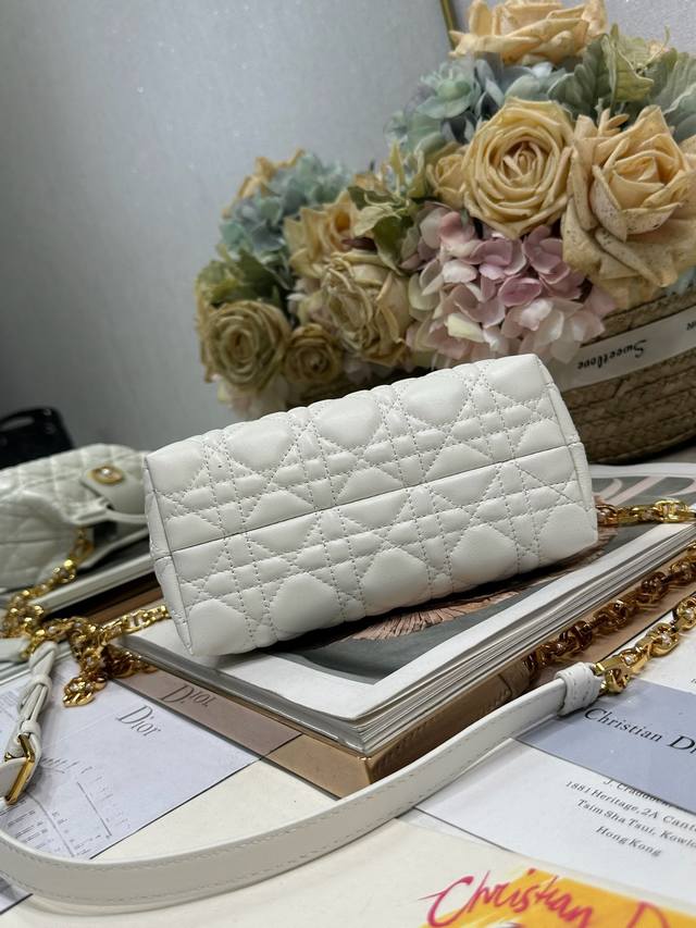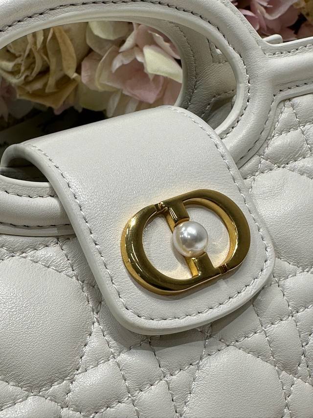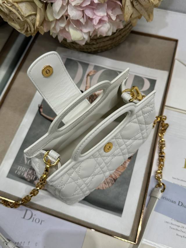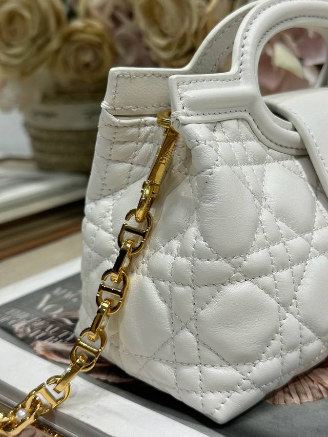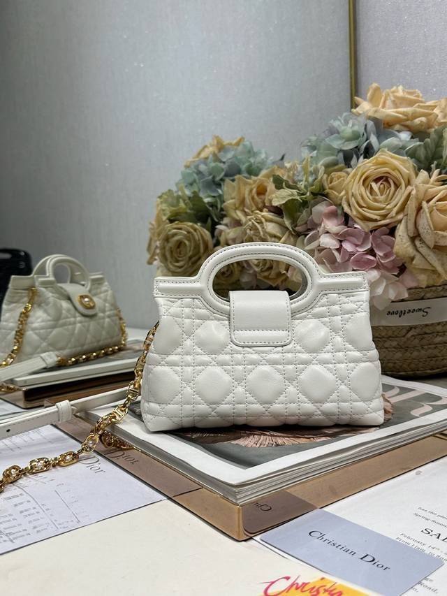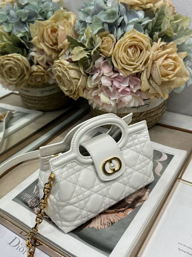 Authentic, High-Quality Dior Jolie Top Handle Mini Chain Handbag, White. This Dior Jolie Top Handle Mini Chain Handbag is a new addition to the 2026 Early Spring Ready-to-Wear Collection, showcasing an elegant and sophisticated design. Crafted from cream-colored lambskin leather with a cannage pattern, the flap is adorned with a gold-finished Cd logo and white resin beads. An interior compartment provides ample storage for everyday essentials. It features double top handles and an adjustable, detachable Cd chain shoulder strap, composed of leather strap and Cd chain links, embellished with white resin beads. It can be comfortably carried by hand, over the shoulder, or crossbody, complementing both casual and evening looks. Magnetic flip-top opening with Cd buckle and white resin beads on the front. Features one compartment, double top leather handle, and an adjustable, detachable chain with resin beads and a leather strap. Model: 3123. Dimensions: 18.5 x 13 x 8.5 cm (L x H x W). Holds one mobile phone, one card holder, sunglasses, and lipstick.