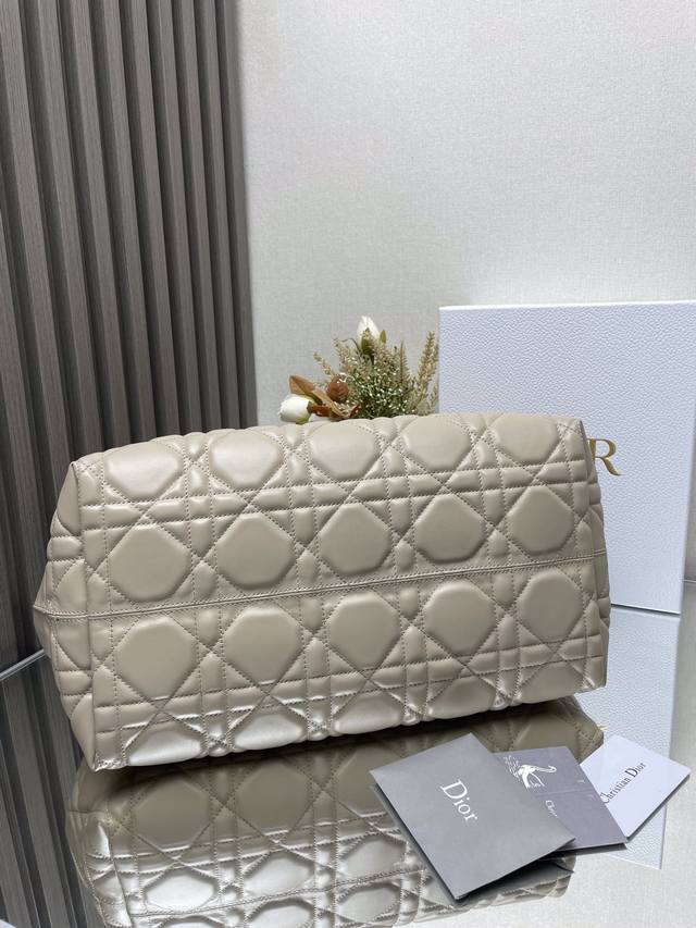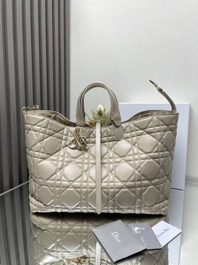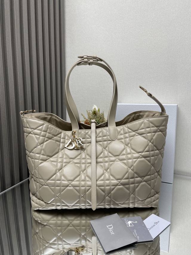 Dior Toujours Handbag (Large, Apricot) This Dior Toujours handbag made a stunning debut at the Spring/Summer 2023 fashion show, boasting a unique blend of casual and practical design. Crafted from light apricot calfskin leather with oversized cannage stitching, its spacious interior features compartments and small pouches for neatly organizing everyday essentials. It features a leather drawstring closure for secure storage, and a Cd Lock dial closure with adjustable sides for added style. The large size includes adjustable leather handles for hand or shoulder carrying. DIOR charm with lock and drawstring closure, removable internal pocket, adjustable leather handle, includes dust bag. Model: 2823. Dimensions: 37 x 20 x 28.5 cm. Handle length: 14 x 29 cm.
