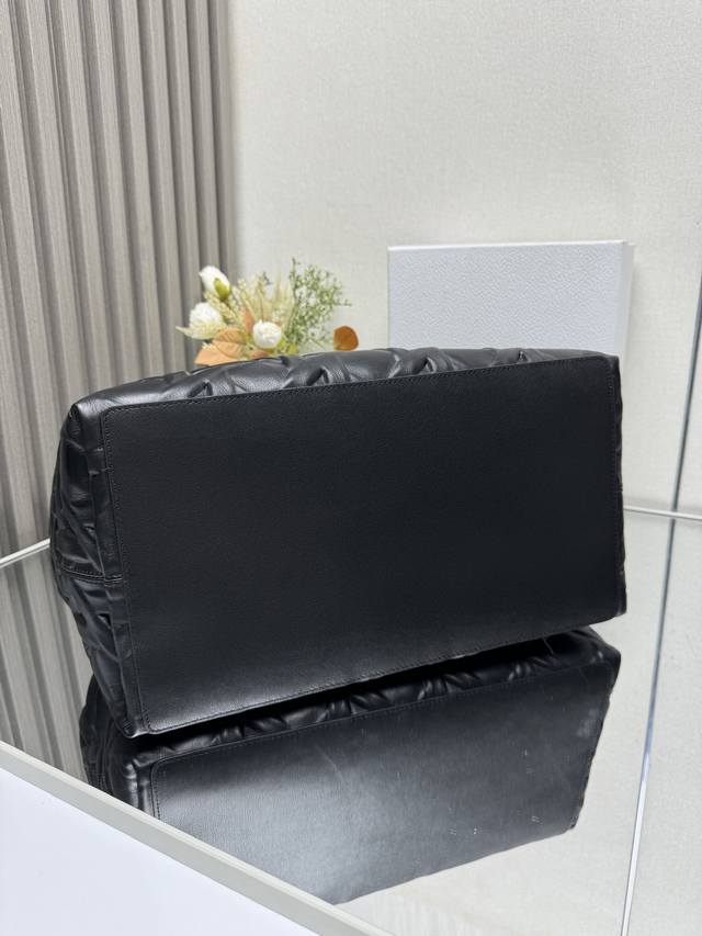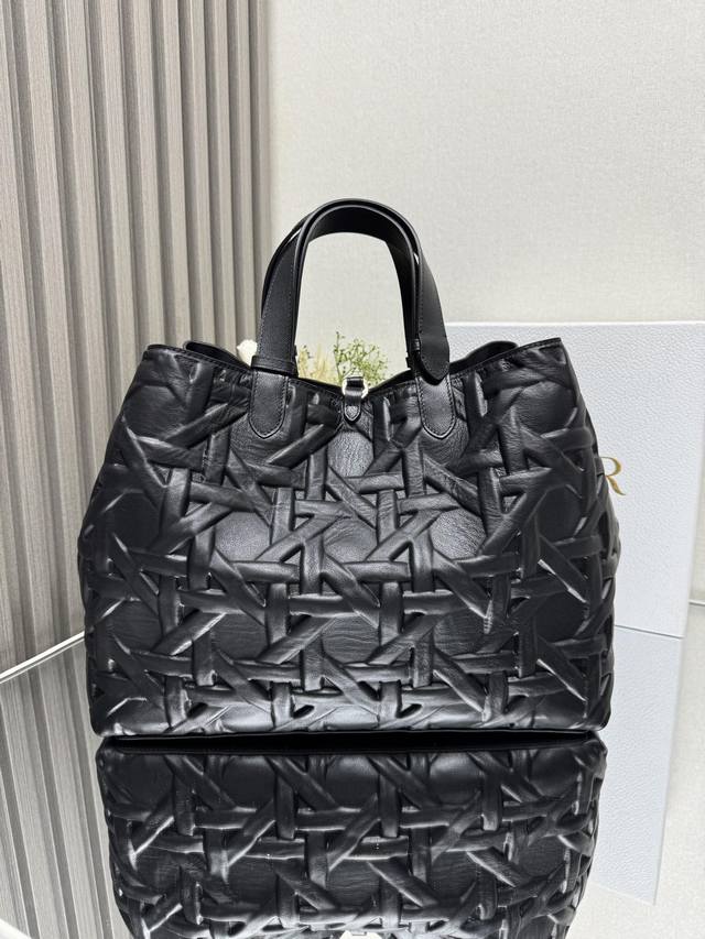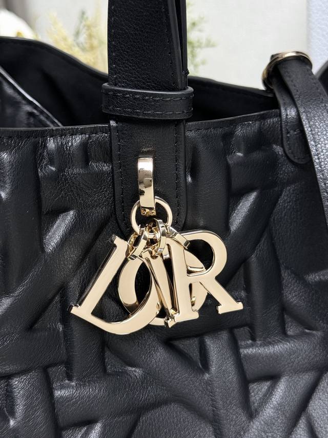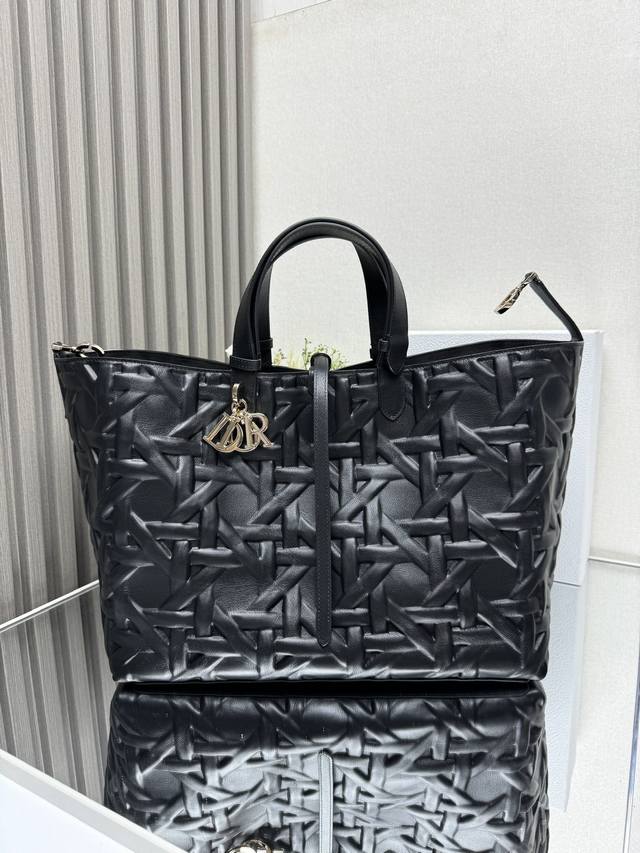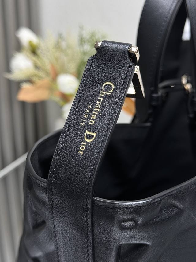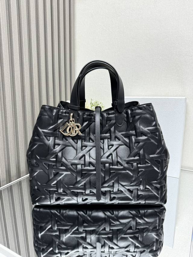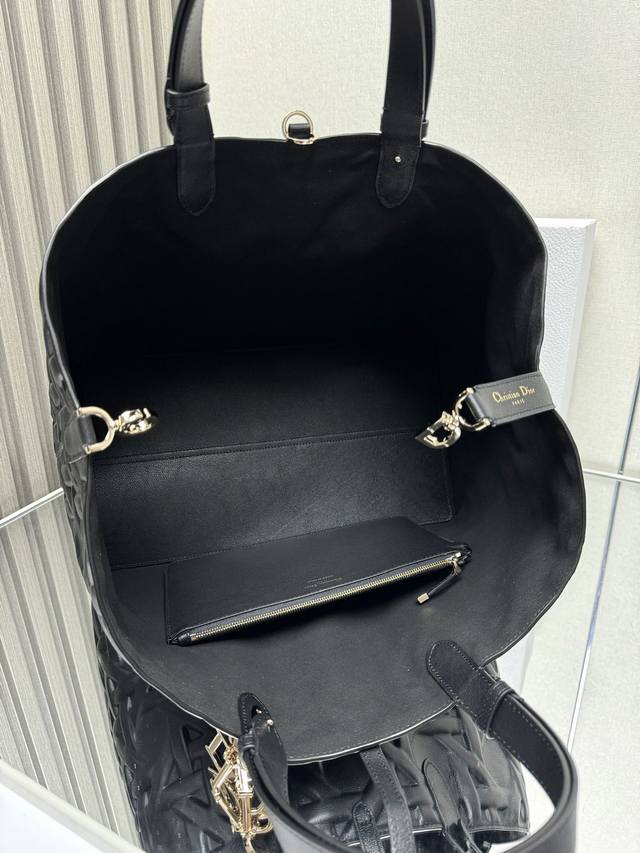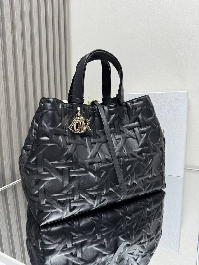 Dior Toujours Handbag [Large Black with Diamond Quilting] This Dior Toujours handbag made a stunning debut in the Spring/Summer 2023 collection, boasting a unique blend of casual and practical design. Crafted from black calfskin leather with oversized cannage stitching, its spacious interior features compartments and small pouches for neatly organizing everyday essentials. It features a leather drawstring closure for secure storage, and a Cd Lock dial closure with adjustable sides for added style. The large size includes adjustable leather handles for hand or shoulder carrying. DIOR charm with lock and drawstring closure, removable internal pocket, adjustable leather handle, includes dust bag. Model: 2820. Dimensions: 37 x 20 x 28.5 cm. Handle length: 14 x 29 cm.