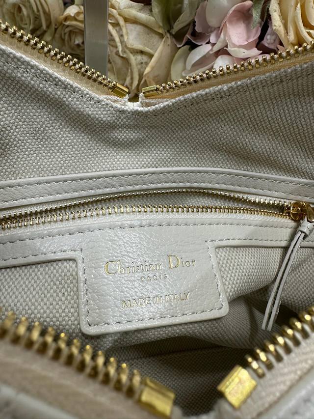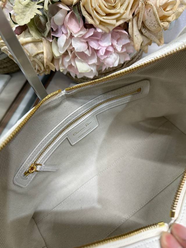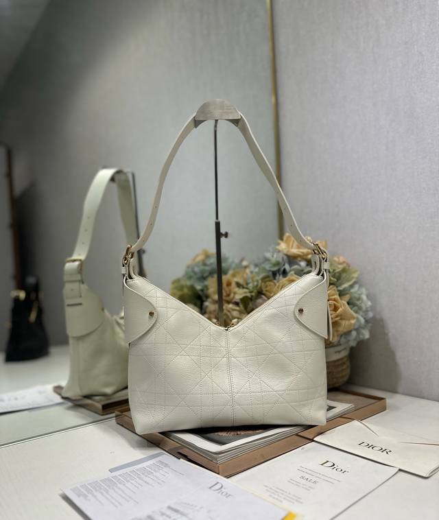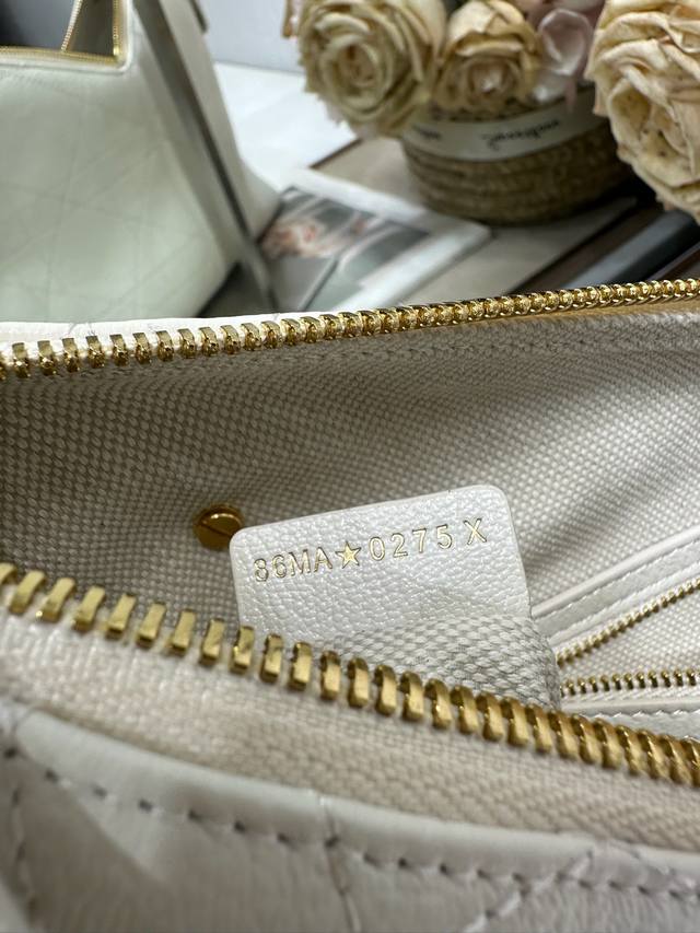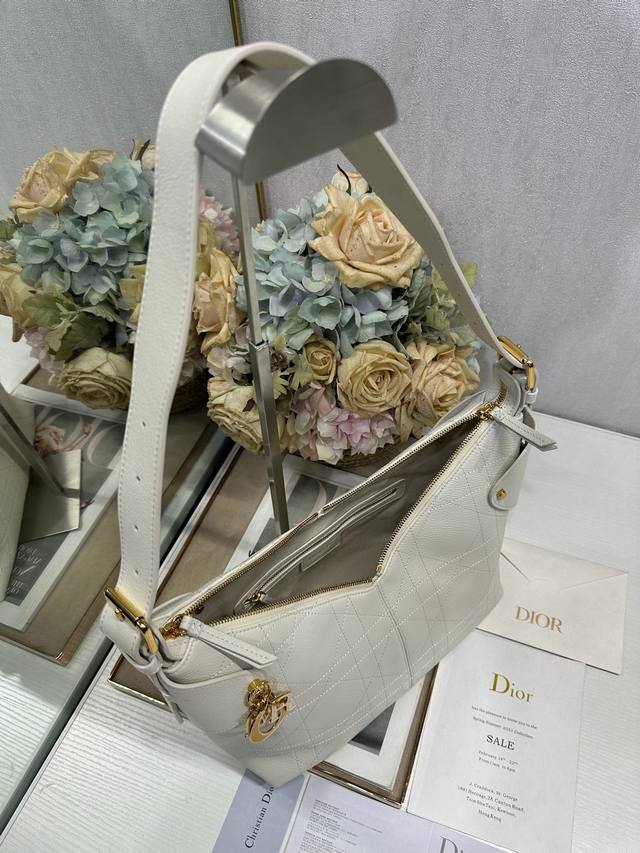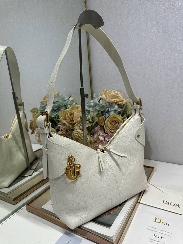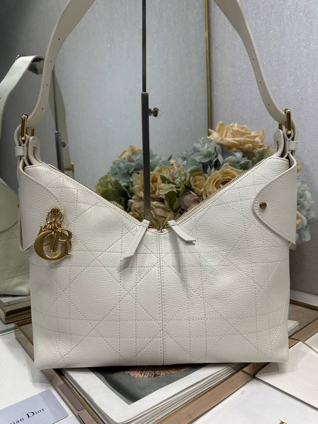 Authentic, High-Quality Dior Voyage Medium Handbag in White Goat's Blood Texture. This Dior Voyage handbag is a new addition to the 2026 Early Spring Ready-to-Wear collection, blending soft lines and elegant details to create a harmonious silhouette. Crafted from white pebbled calfskin leather, it features flat, oversized cannage stitching, a fresh interpretation of Dior's classic pattern. The soft silhouette is enhanced by a gold-tone DIOR charm and meticulously crafted leather accents, giving it a more structured look. The main compartment features a secure and practical two-way zip closure. The medium size includes a top handle with an adjustable buckle, allowing for shoulder carrying, making it an ideal companion for everyday styling.