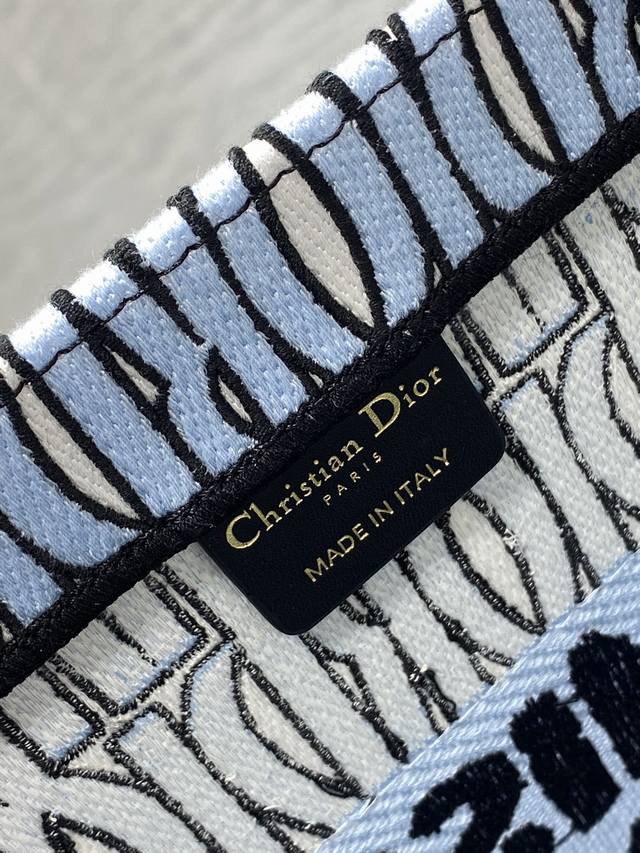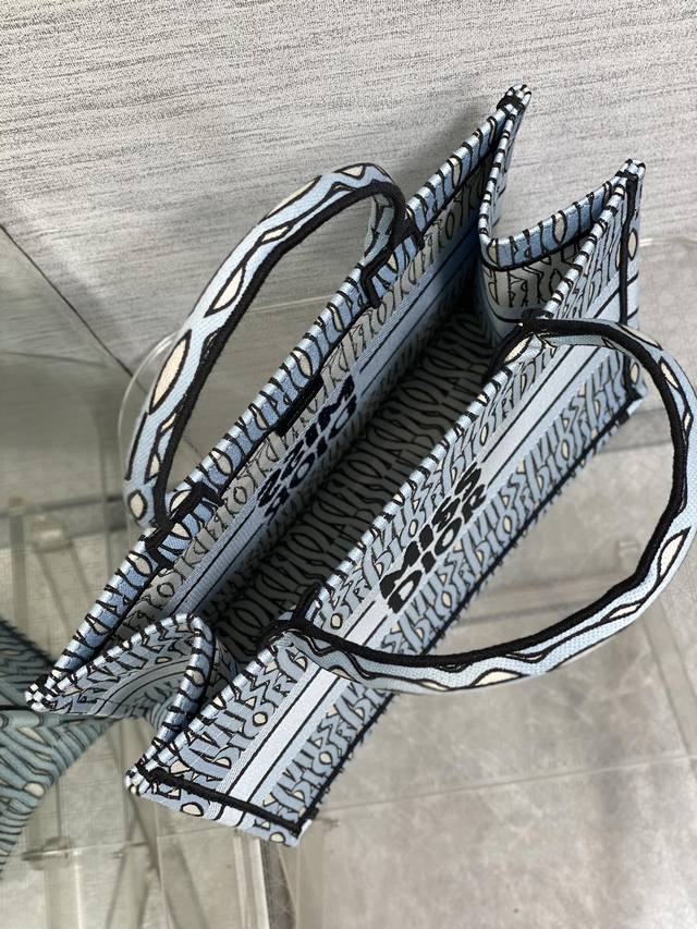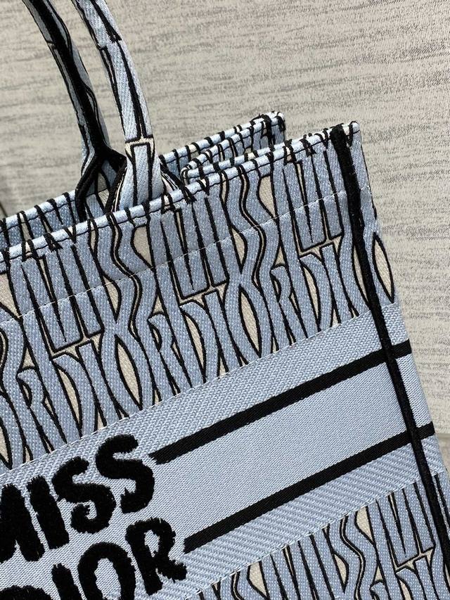 light blue stamp medium-sized Tote bag in stock. From the latest Spring/Summer collection, featuring Missdior embroidery, exuding summer vibes. Sophisticated color blocking, iconic lettering, and a super-large capacity design. A must-have for fashionistas, perfect for creating stylish looks. The capacity is ample; just throw all your essentials in there.
