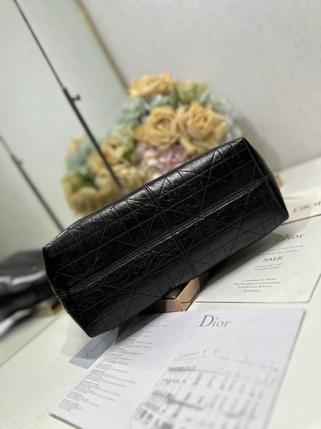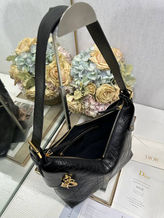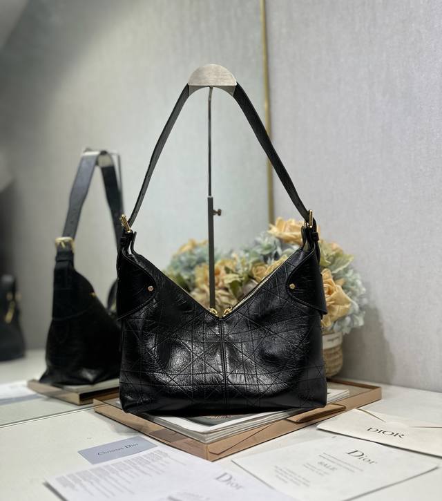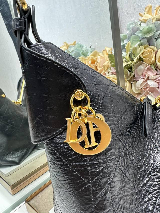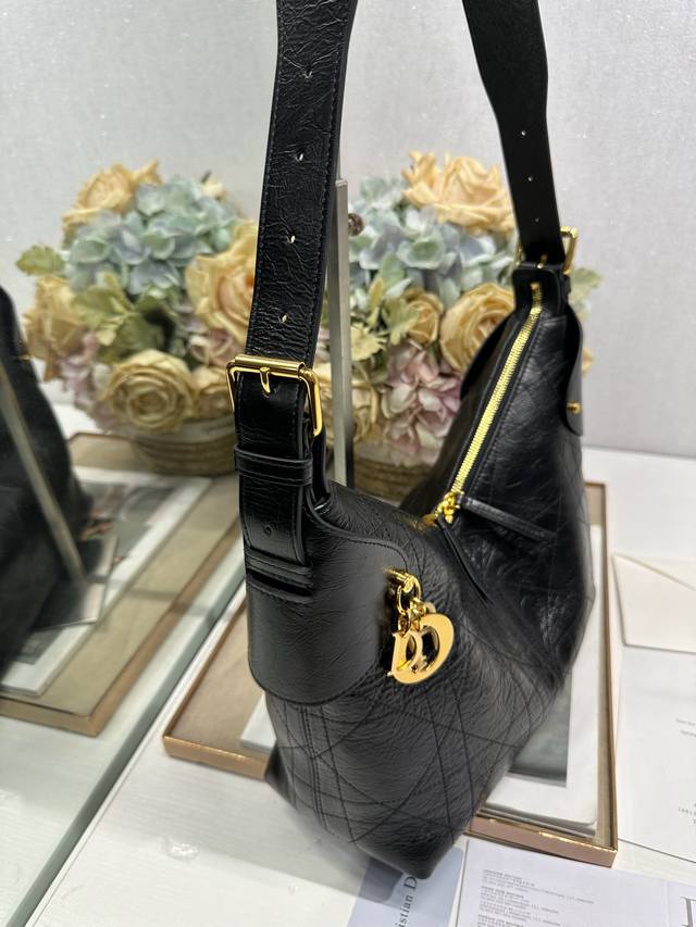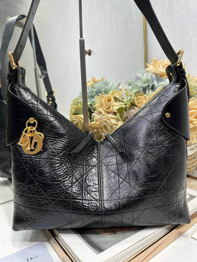 Medium Dior Voyage Handbag, Black with Pleated Design. This Dior Voyage handbag is a new addition to the 2026 Early Spring Ready-to-Wear collection, blending soft lines and elegant details to create a harmonious silhouette. Crafted from black pleated calfskin, it features flat, oversized cannage stitching, a fresh interpretation of Dior's classic pattern. The soft silhouette is enhanced by a gold-tone DIOR charm and meticulously crafted leather accents, giving it a more structured look. The main compartment features a secure and practical two-way zip closure. The medium size includes a top handle with an adjustable buckle, allowing for shoulder carrying, making it an ideal companion for everyday styling.