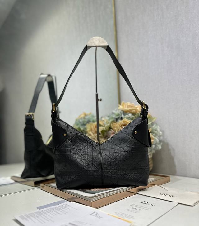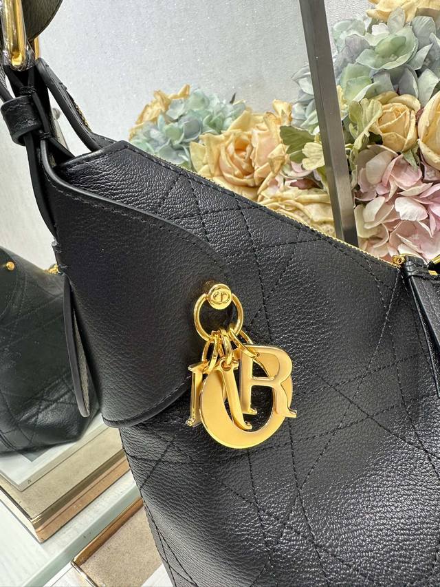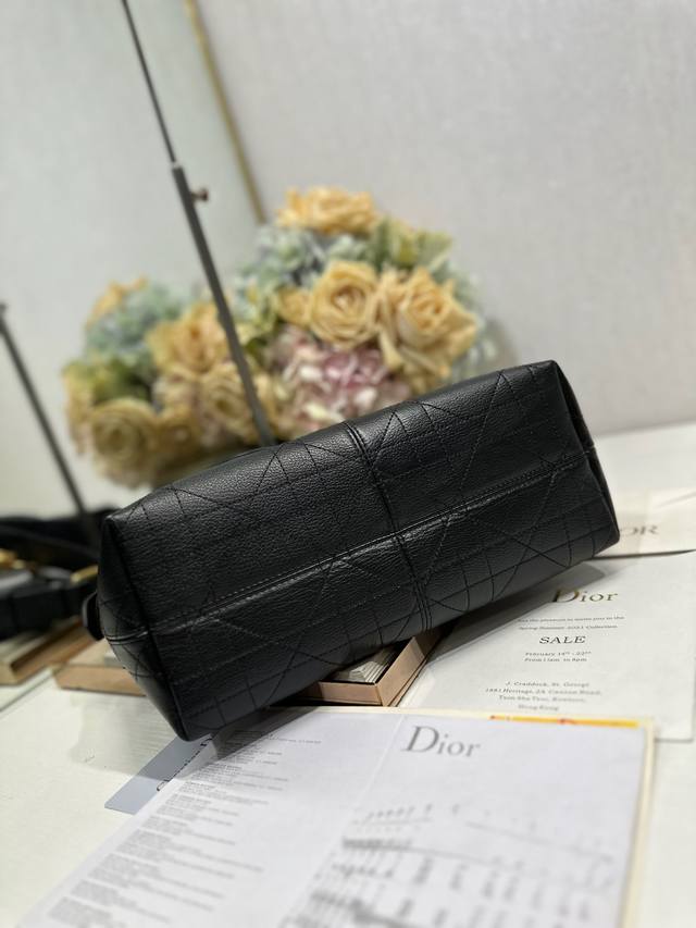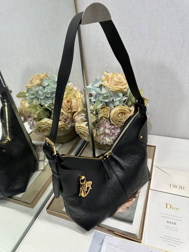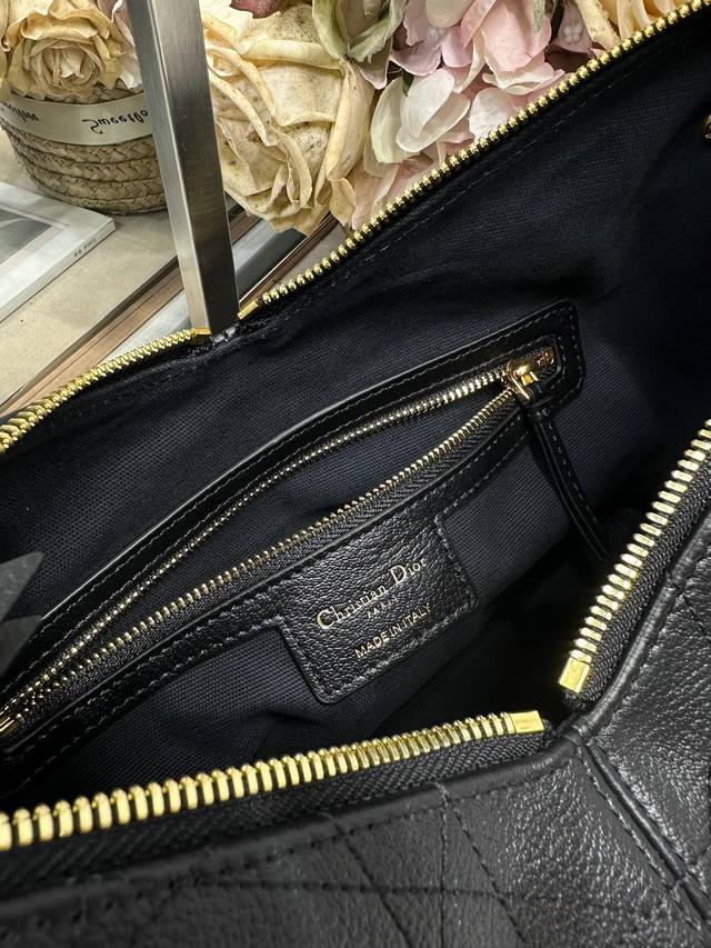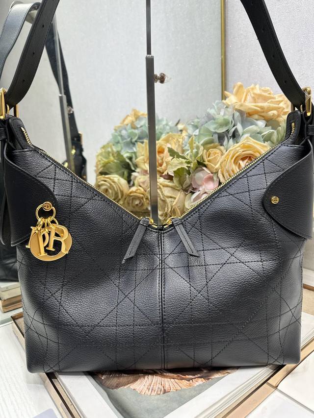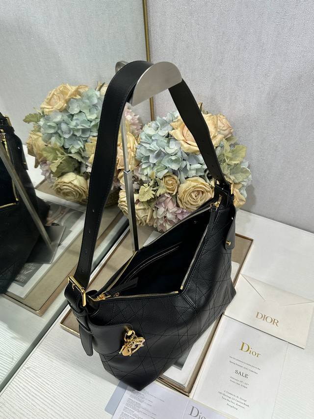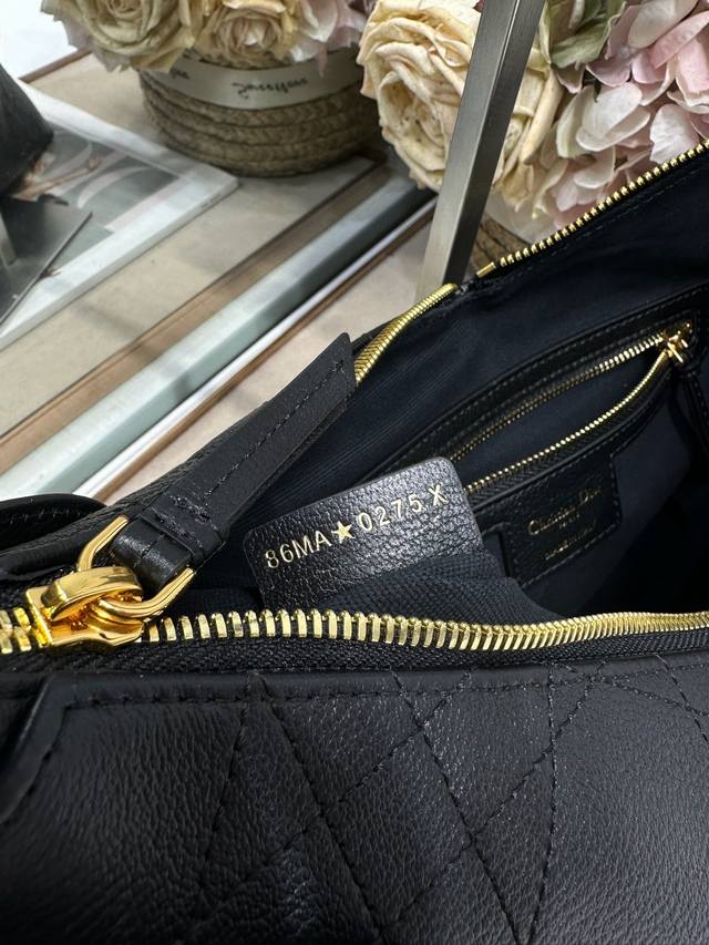 Authentic, High-Quality Version Dior Voyage Medium Handbag in Goat's Blood Texture, Black. This Dior Voyage handbag is a new addition to the 2026 Early Spring Ready-to-Wear collection, blending soft lines and elegant details to create a harmonious silhouette. Crafted from black pebbled calfskin leather, it features flat, oversized cannage stitching, a fresh interpretation of Dior's classic pattern. The soft silhouette is enhanced by a gold-tone DIOR charm and meticulously crafted leather accents, giving it a more structured look. The main compartment features a secure and practical two-way zip closure. The medium size includes a top handle with an adjustable buckle, allowing for shoulder carrying, making it an ideal companion for everyday styling.