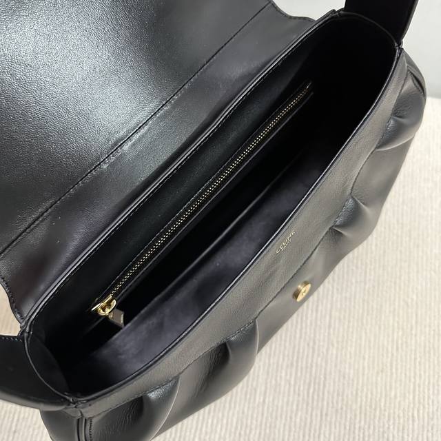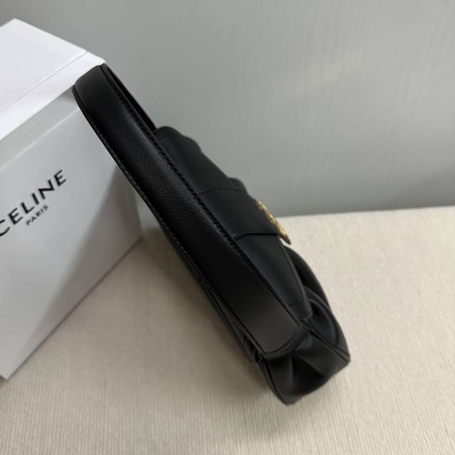 Spring/Summer Collection Polly Bag. The new season's bags still feature the brand's iconic Triomphe logo as a core element. The highlight of the Polly baguette silhouette from the runway show is the wavy curve at the bottom, adding a touch of playfulness. The bag features an envelope flap paired with a soft, pleated body, presenting an elegant retro feel. It has a magnetic closure, an interior main compartment, and a zip pocket. Made of cowhide leather with a lambskin lining and gold-tone finish, it can be carried by the shoulder or hand! Amazing capacity!