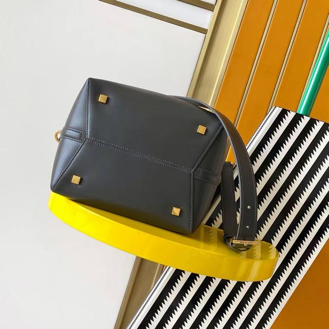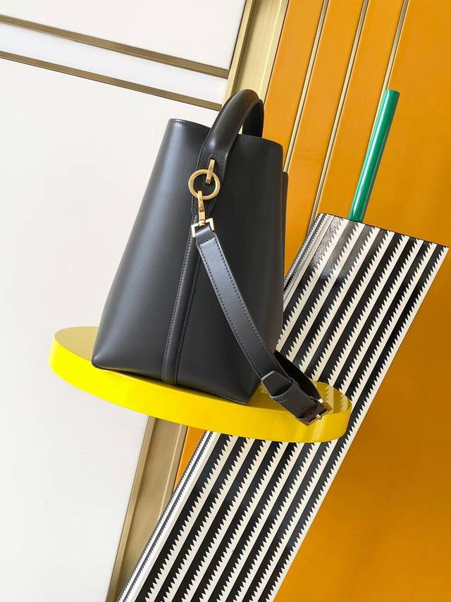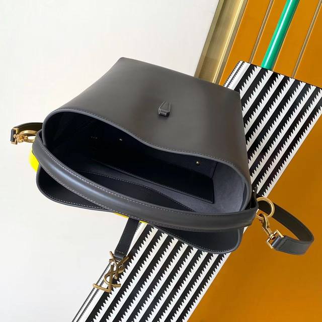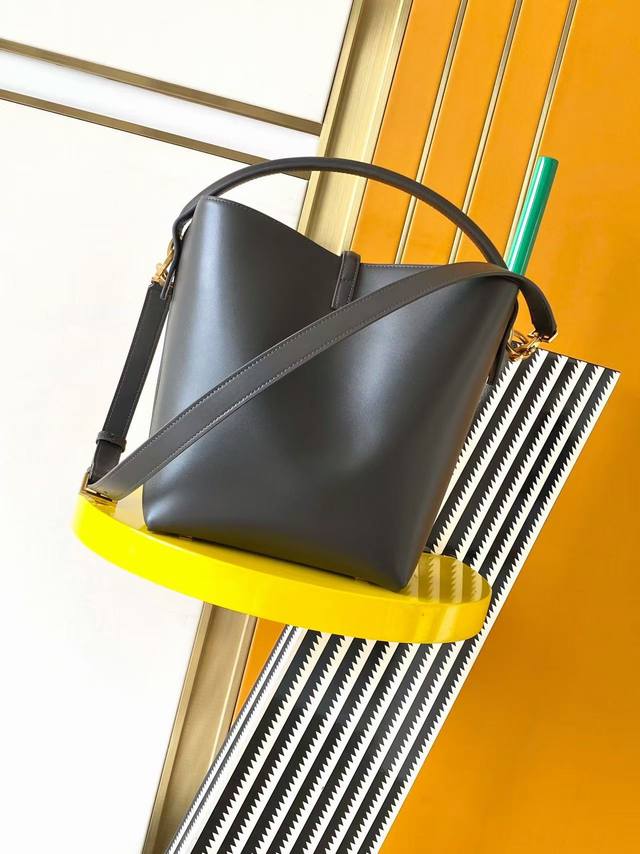 original leather Le 5A7 series new model, super stylish bucket bag with handles. A brand new bag design, made of Italian calfskin, with a simple and structured silhouette that looks firm yet not too sharp. It features a metal stud at the bottom and a classic, iconic metal logo insert clasp, giving it a unique blend of classic elegance and modern chic!