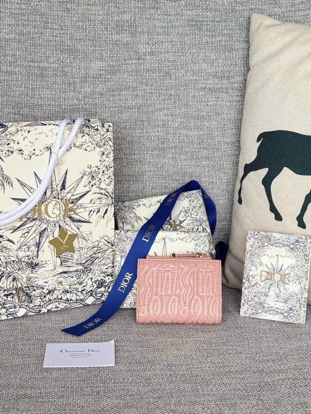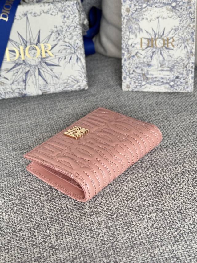 This Miss Dior Freesia wallet is an elegant and practical accessory. Crafted from lambskin leather, it features the collection's signature quilted Miss Dior Allover pattern, inspired by Marc Bohan's Dior design archives, offering a modern interpretation of 1960s fashion. A vintage gold-finished metal Miss Dior logo adds a touch of sophistication. It features six card slots. Elegant and suitable for various occasions, it can be paired with other Miss Dior pieces from the collection to create a coordinated look. Dimensions: 11.5 x 9 x 2 cm