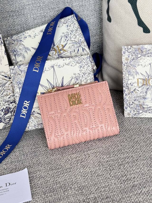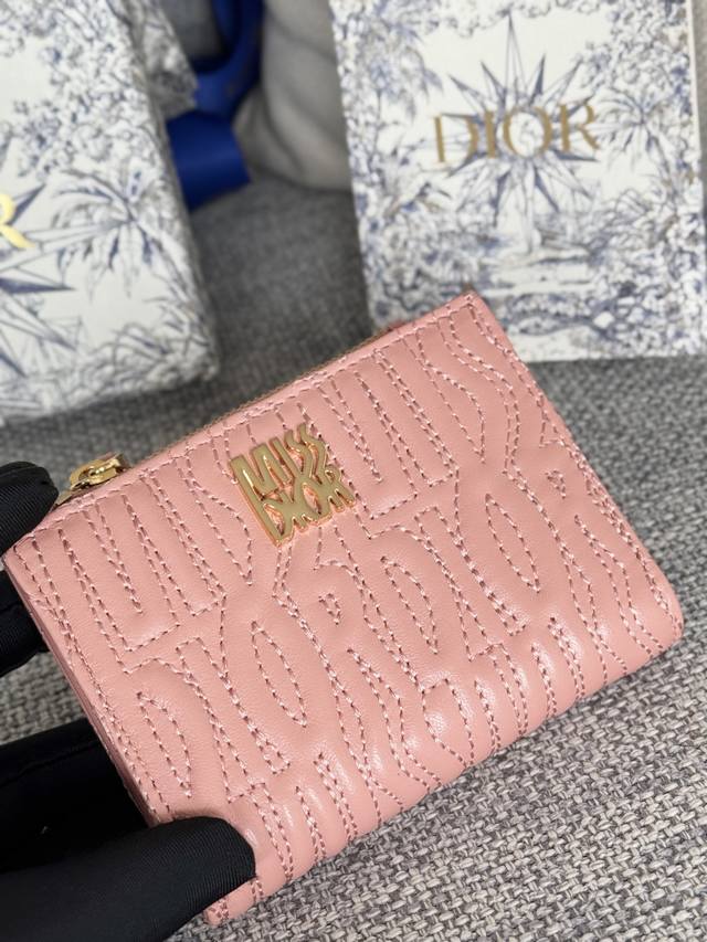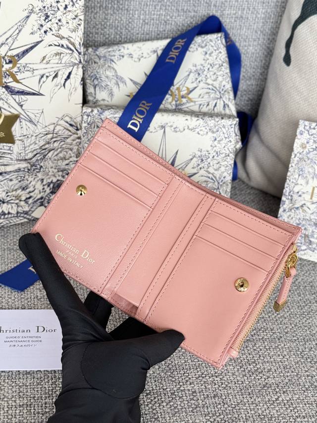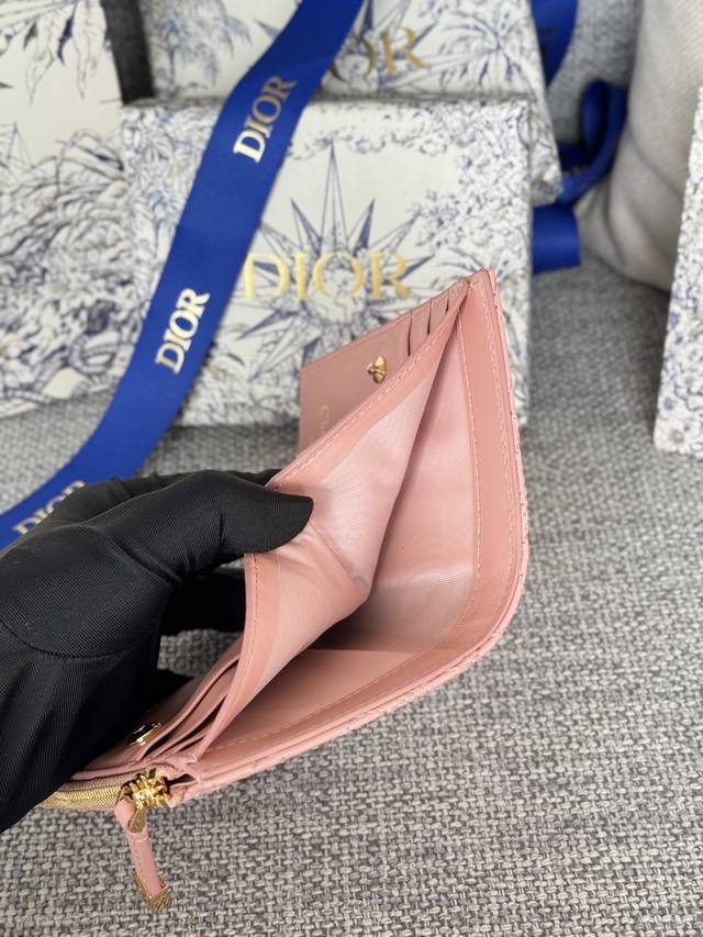 Lining: Lambskin leather, technical fabric Front: Miss Dior logo 6 card slots 4 card slots 1 cash compartment 1 zip pocket