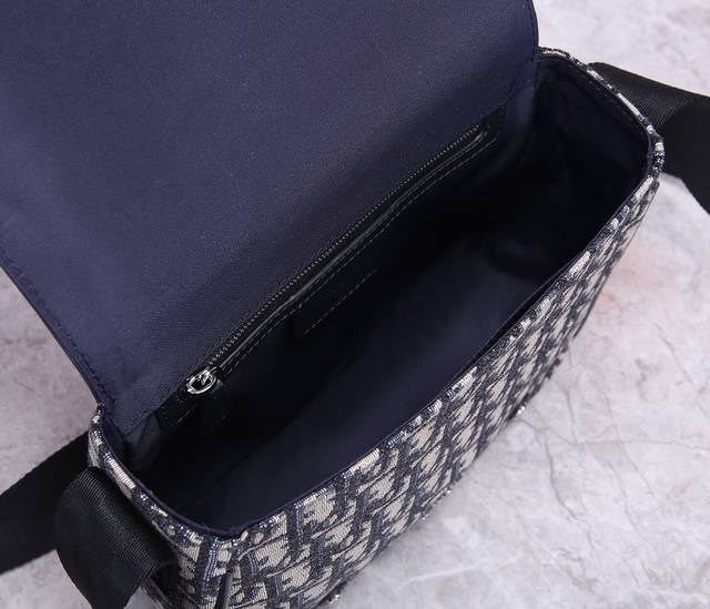 messenger bag draws inspiration from the traditional Cambridge Satchel. Crafted from the iconic Oblique print canvas, it features a cowhide leather flap adorned with a metal "Dio.R" logo. A magnetic clasp closure allows easy access to items, and the adjustable nylon shoulder strap provides ample interior space with small pockets perfect for storing small school supplies. Features include: blue Oblique print canvas and cowhide leather; adjustable nylon shoulder strap; magnetic clasp closure on the front; interior pockets. Dimensions: 24cm