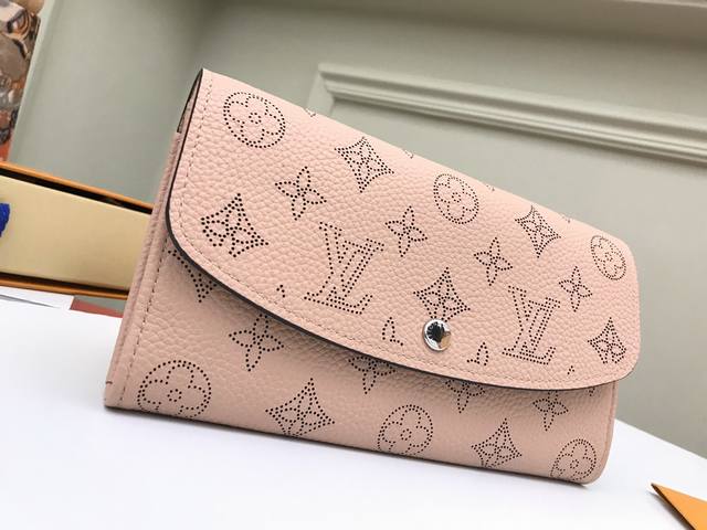 Top-Tier Original M60145 Pink Delicate Perforated Leather with Monogram Pattern, Reflecting the Elegance of the Iris Wallet. The gracefully rounded flap conceals a spacious compartment, a zippered coin pocket, and multiple card slots. Dimensions: 19.0 x 12.0 x 2.0 cm.