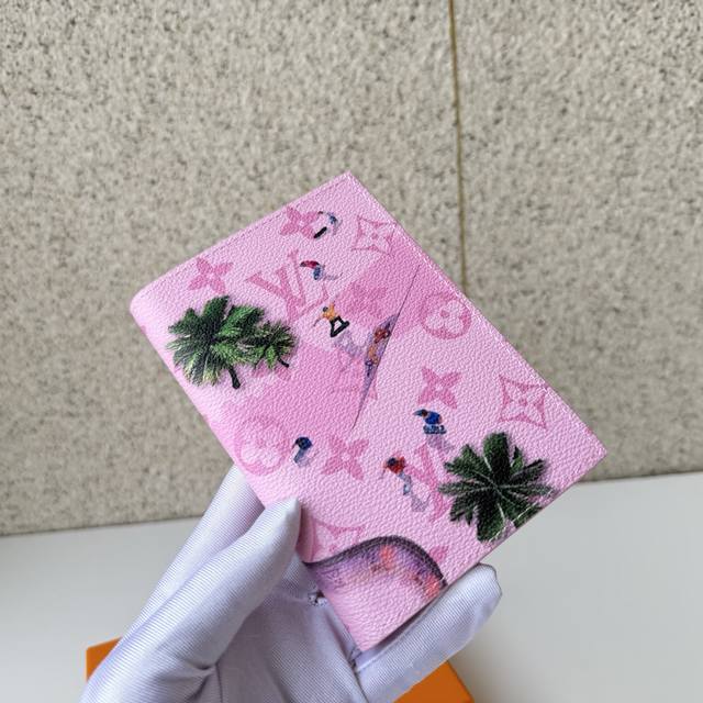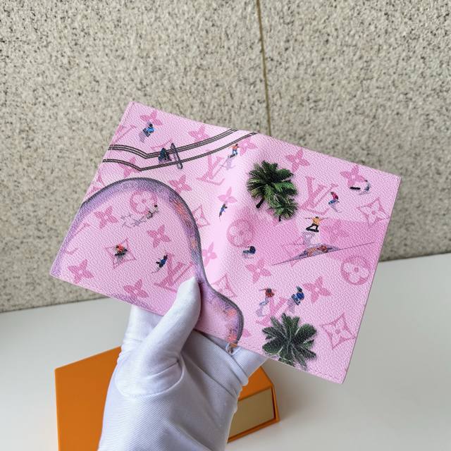 Top-Tier Original Passport M27229. This passport features a playful scene of skaters captured from the air on a baby pink canvas. It's a vibrant and youthful item. A design that adds personality to travel, it not only securely holds your passport but also includes four card slots and a flat pocket, adding fun and expression to this classic accessory. Dimensions: 10 x 14 x 2.5 cm.