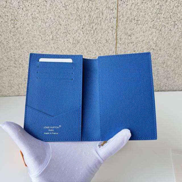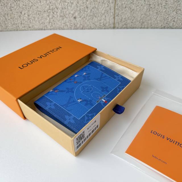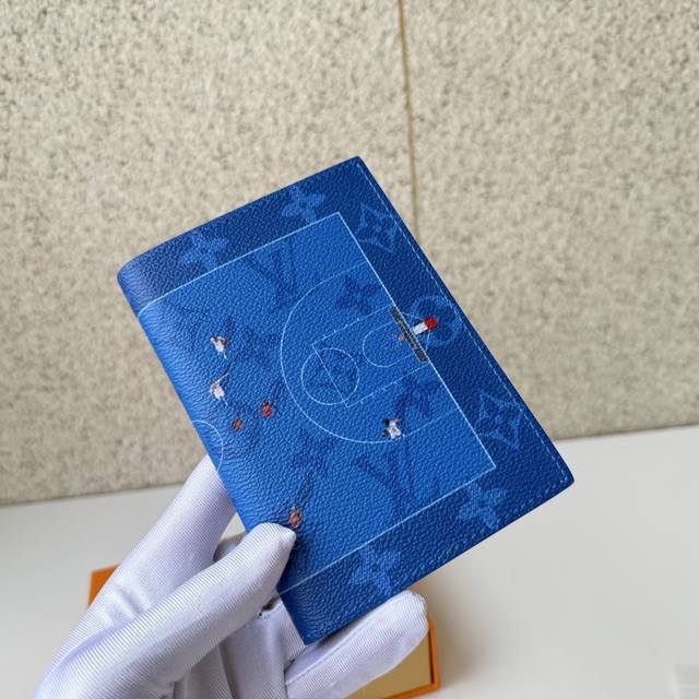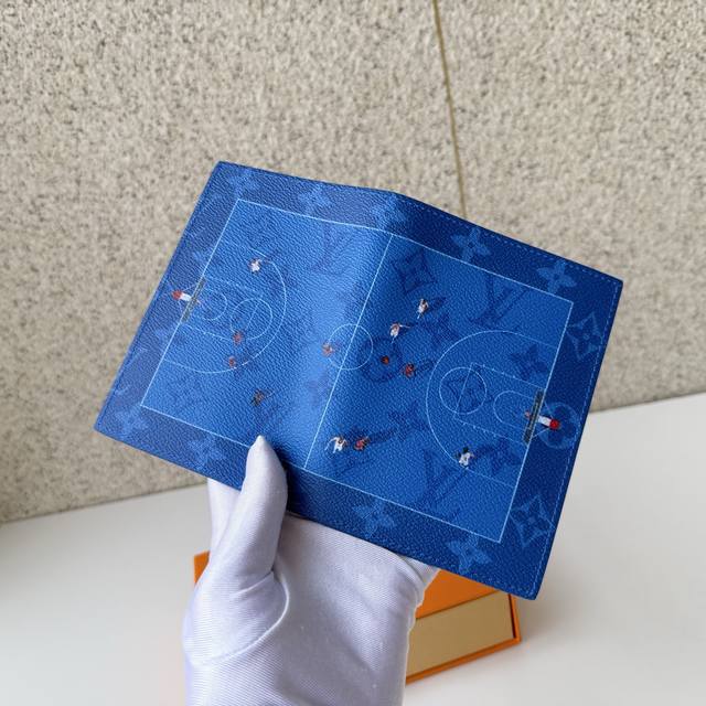 Top-Tier Original Single Item M26795 Blue Passport. A unique scene depicting basketball players on a court, captured from the air, on a deep blue canvas. Adding personality to your travels, this item not only securely holds your passport but also features four card slots and a flat pocket. A dynamic and expressive accessory that combines playful style with practicality. Dimensions: 10 x 14 x 2.5 cm.