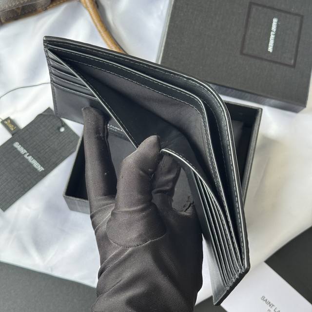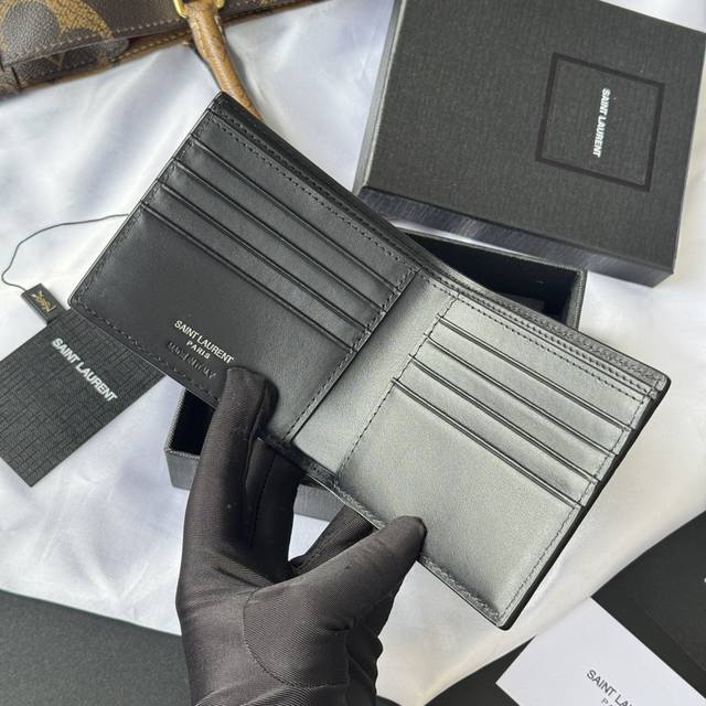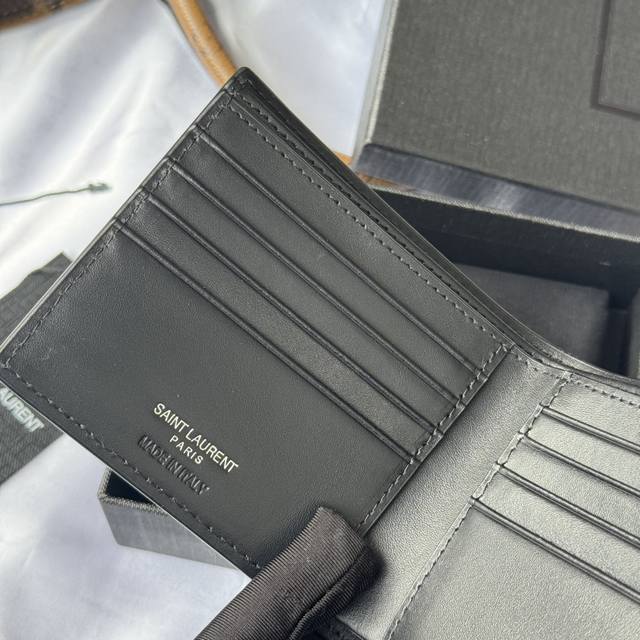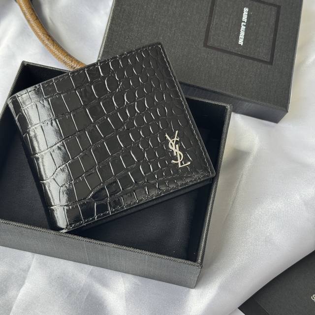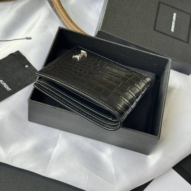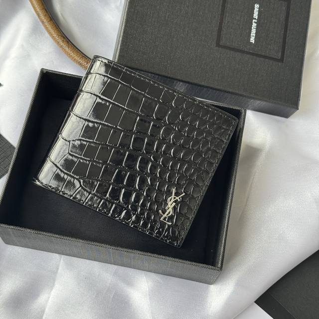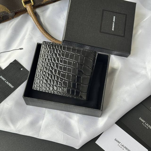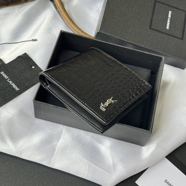 Authentic YSL Men's Wallet, Black Crocodile Pattern, Made of Leather Monogram Bi-fold Wallet with Metal YSL Logo. Interior: Two bill compartments, eight card slots, and two note compartments. Model: 607727. Dimensions: 11*9.5*2.5cm.